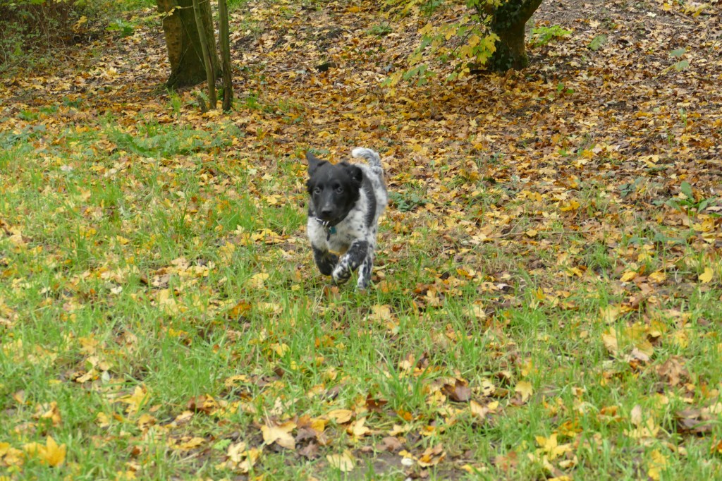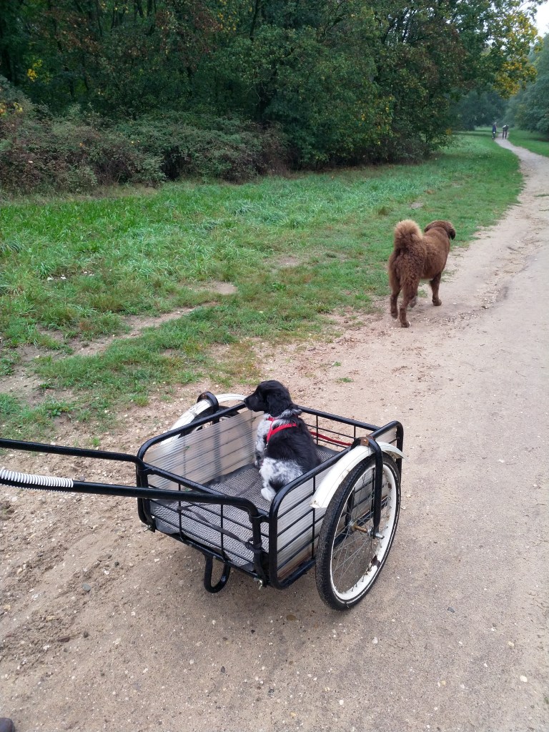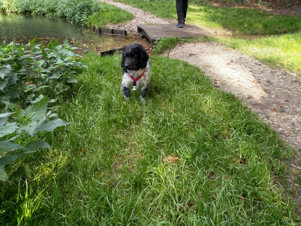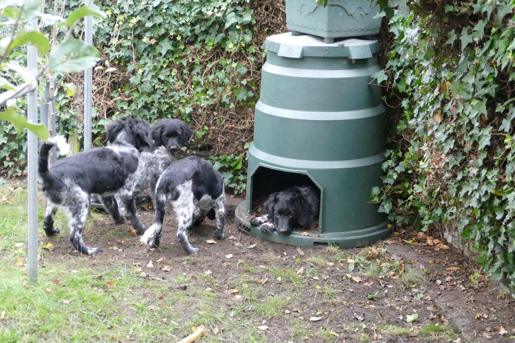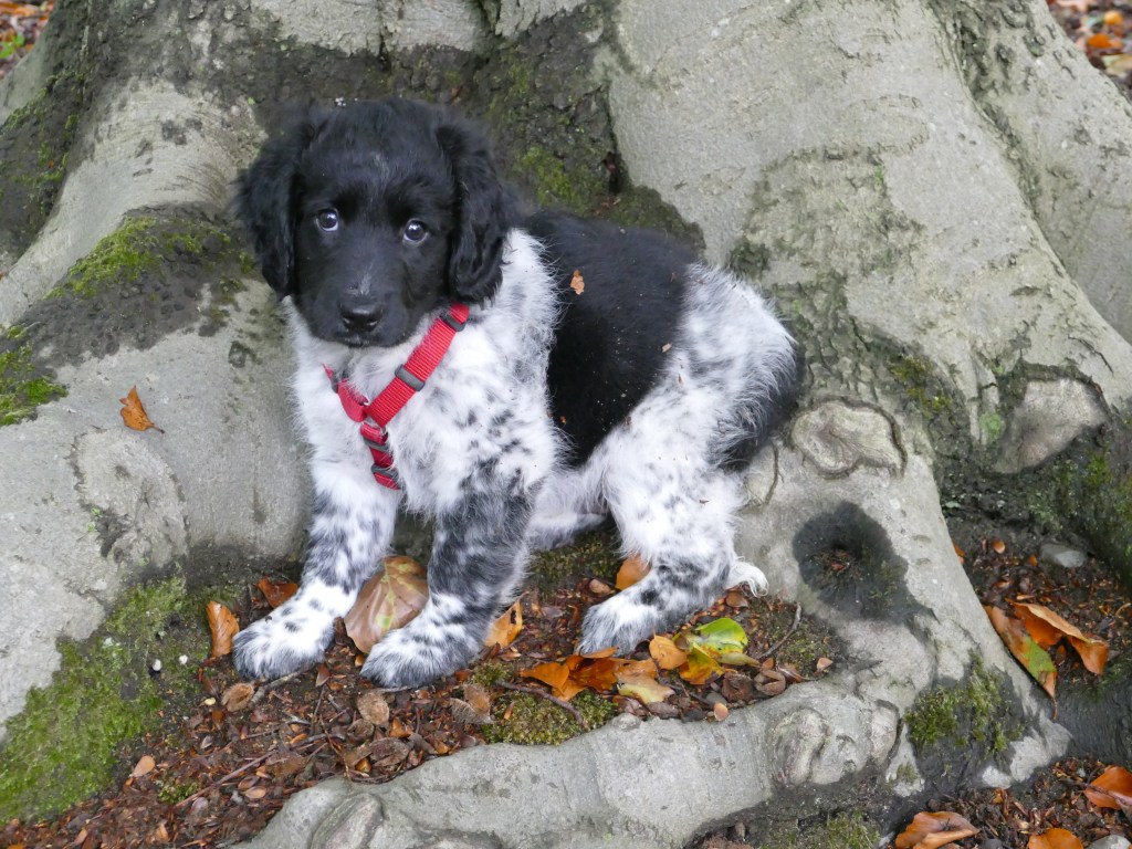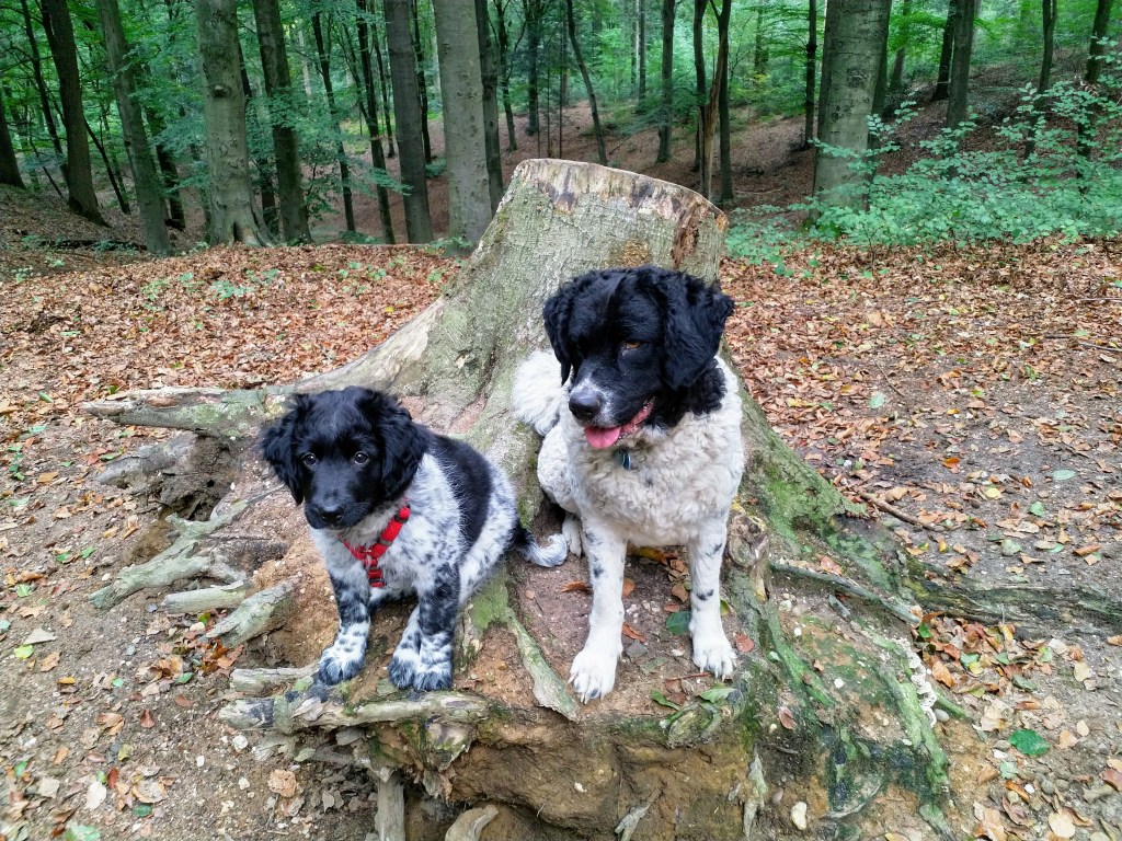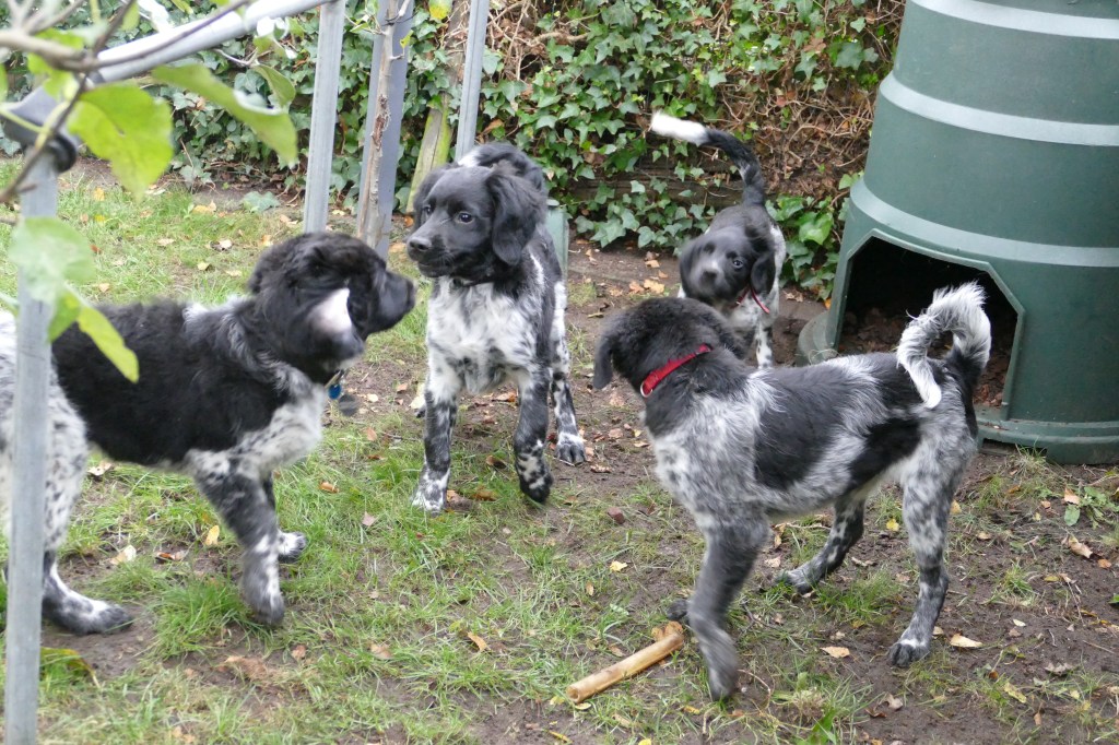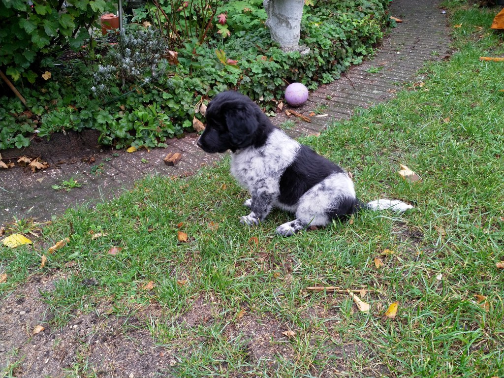 Otto: Otto was een kleine bange pup toen hij bij ons kwam. Als hij in de voortuin was schrok hij al als er een fiets de straat af reed. De Stabij staat er om bekend dat zij van nature vaak wat onzeker en nerveus zijn. Het is zaak om een stabij pup zo vroeg mogelijk goed te socialiseren. Mede door de “opvoeding” van onze 3 Wetters is dat wel gelukt. Je zag hem mentaal groeien en hij heeft zich ontwikkeld tot een zelfverzekerde pup van 15 weken, toen hij ons verliet. De eerste dagen bleef Otto dicht bij mij in de buurt. Dat kwam waarschijnlijk omdat Tyske in het begin niet zo aardig was. Daarom hield ik ze maar gescheiden om het wennen aan elkaar heel geleidelijk en gecontroleerd te laten verlopen. Dat is gelukt, na een paar dagen heeft Tyske Otto geaccepteerd. Daarom waren Otto en ik veel samen in de keuken en heb ik daar een mand voor hem neer gezet. Otto gaat mee in onze fietskar als we Ayke, Tyske en Hielke uitlaten in het bos. Otto mag dan ook korte periodes van 10min(2mnd) en 15min(met 3mnd) los lopen. We hebben hem kennis laten maken met andere honden en andere dieren zoals koeien, paarden, varkens en zelfs een kalkoen en de papegaai van onze vrienden. We hebben hem ook laten wennen aan water en aan verkeer want hij gaat in Londen wonen. Hielke is zijn grote speelmaatje maar Tyske, die hem eerst als indringer beschouwde, speelt op haar ruwe manier ook met hem. Zelf Ayke, die nooit zoveel van pups moet hebben, speelt af en toe met hem en doet dat op een veel subtielere manier dan Hielke en Tyske. Otto is heel bedreven geworden in het ontwijken van deze lompe honden als ze met elkaar spelen. Pas als hij zijn 12 weken inenting heeft gehad mag hij los op het hondenveld en gaat hij ook mee op de korte wandelingen, zonder kar.