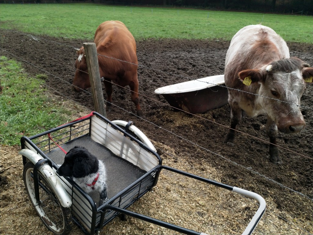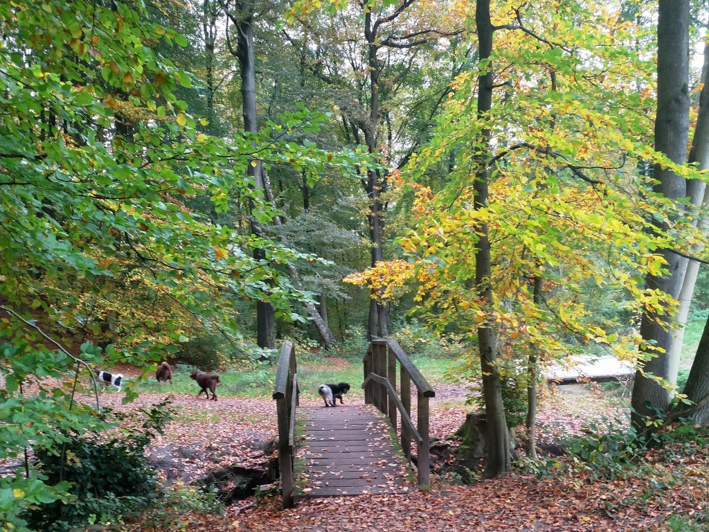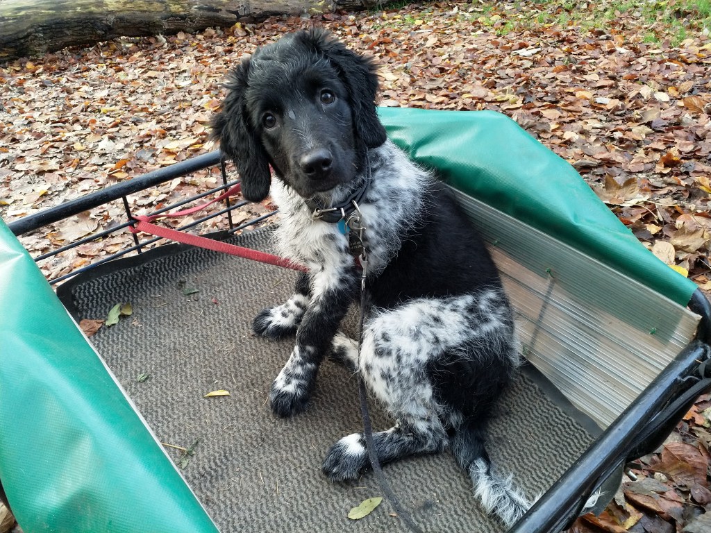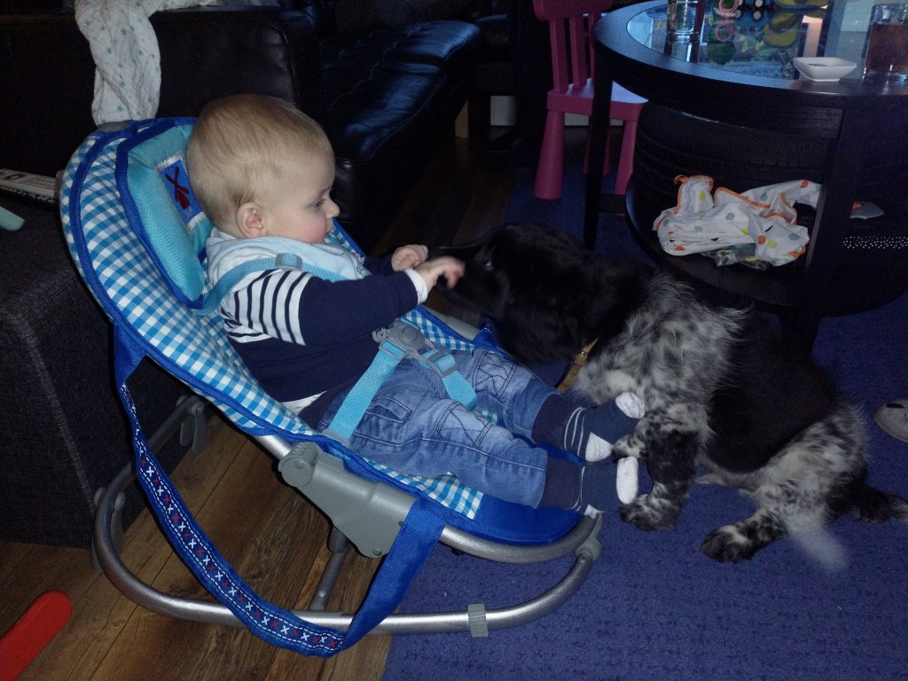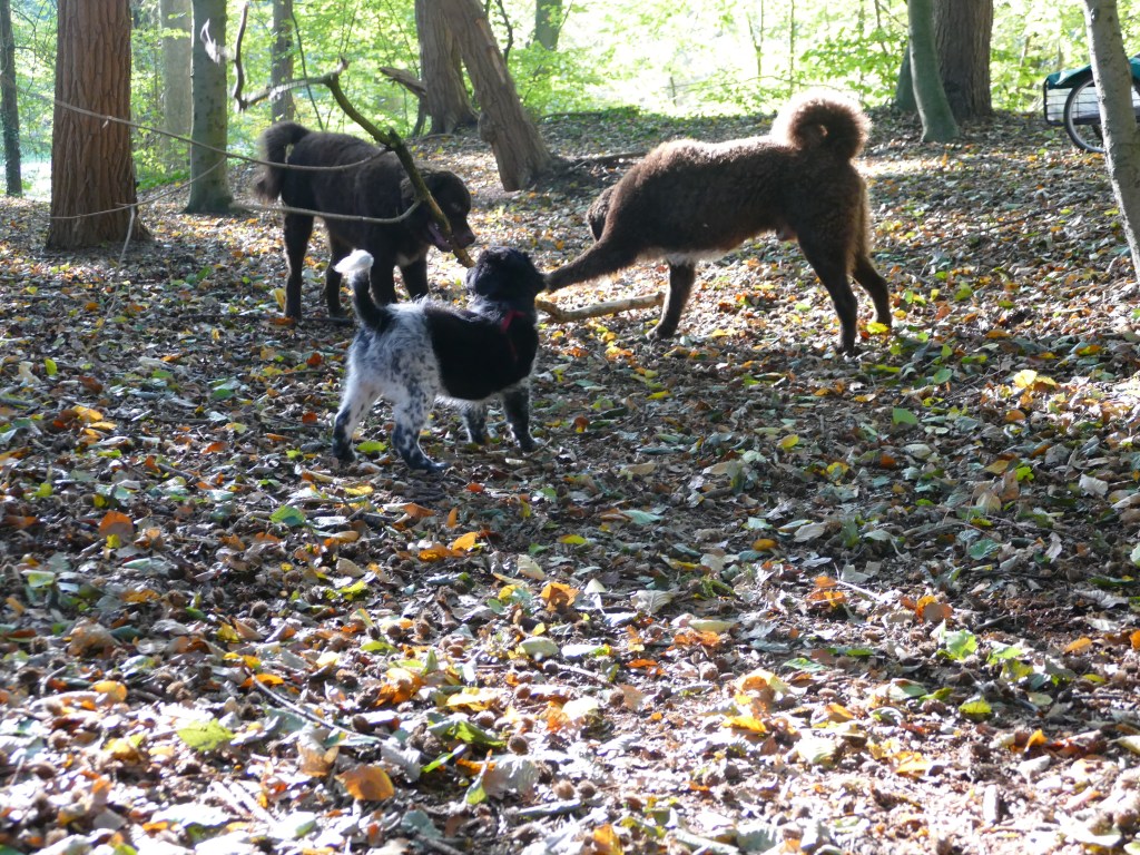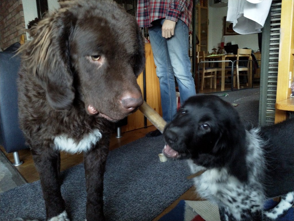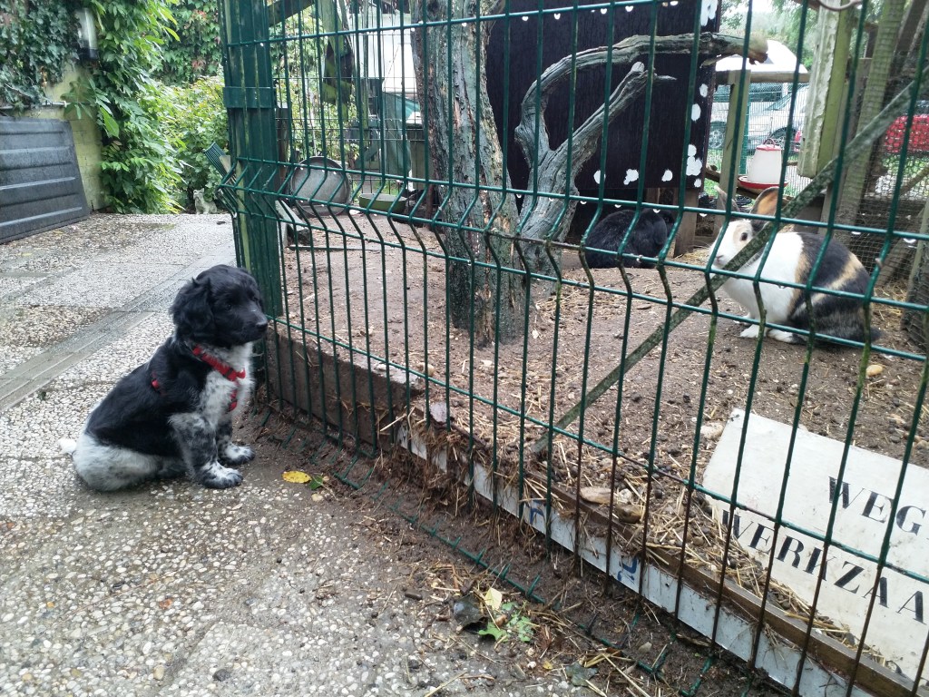 Otto: Otto was een kleine bange pup toen hij bij ons kwam. Als hij in de voortuin was schrok hij al als er een fiets de straat af reed. De Stabij staat er om bekend dat zij van nature vaak wat onzeker en nerveus zijn. Het is zaak om een stabij pup zo vroeg mogelijk goed te socialiseren. Mede door de “opvoeding” van onze 3 Wetters is dat wel gelukt. Je zag hem mentaal groeien en hij heeft zich ontwikkeld tot een zelfverzekerde pup van 15 weken, toen hij ons verliet. De eerste dagen bleef Otto dicht bij mij in de buurt. Dat kwam waarschijnlijk omdat Tyske in het begin niet zo aardig was. Daarom hield ik ze maar gescheiden om het wennen aan elkaar heel geleidelijk en gecontroleerd te laten verlopen. Dat is gelukt, na een paar dagen heeft Tyske Otto geaccepteerd. Daarom waren Otto en ik veel samen in de keuken en heb ik daar een mand voor hem neer gezet. Otto gaat mee in onze fietskar als we Ayke, Tyske en Hielke uitlaten in het bos. Otto mag dan ook korte periodes van 10min(2mnd) en 15min(met 3mnd) los lopen. We hebben hem kennis laten maken met andere honden en andere dieren zoals koeien, paarden, varkens en zelfs een kalkoen en de papegaai van onze vrienden. We hebben hem ook laten wennen aan water en aan verkeer want hij gaat in Londen wonen. Hielke is zijn grote speelmaatje maar Tyske, die hem eerst als indringer beschouwde, speelt op haar ruwe manier ook met hem. Zelf Ayke, die nooit zoveel van pups moet hebben, speelt af en toe met hem en doet dat op een veel subtielere manier dan Hielke en Tyske. Otto is heel bedreven geworden in het ontwijken van deze lompe honden als ze met elkaar spelen. Pas als hij zijn 12 weken inenting heeft gehad mag hij los op het hondenveld en gaat hij ook mee op de korte wandelingen, zonder kar.