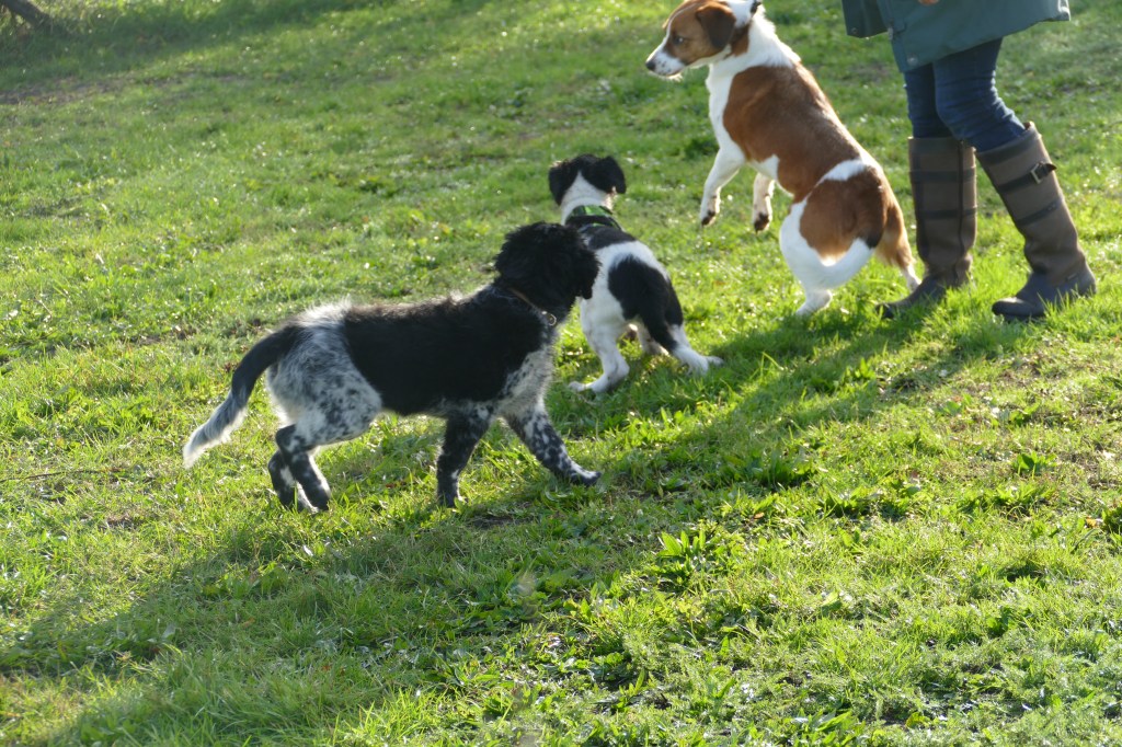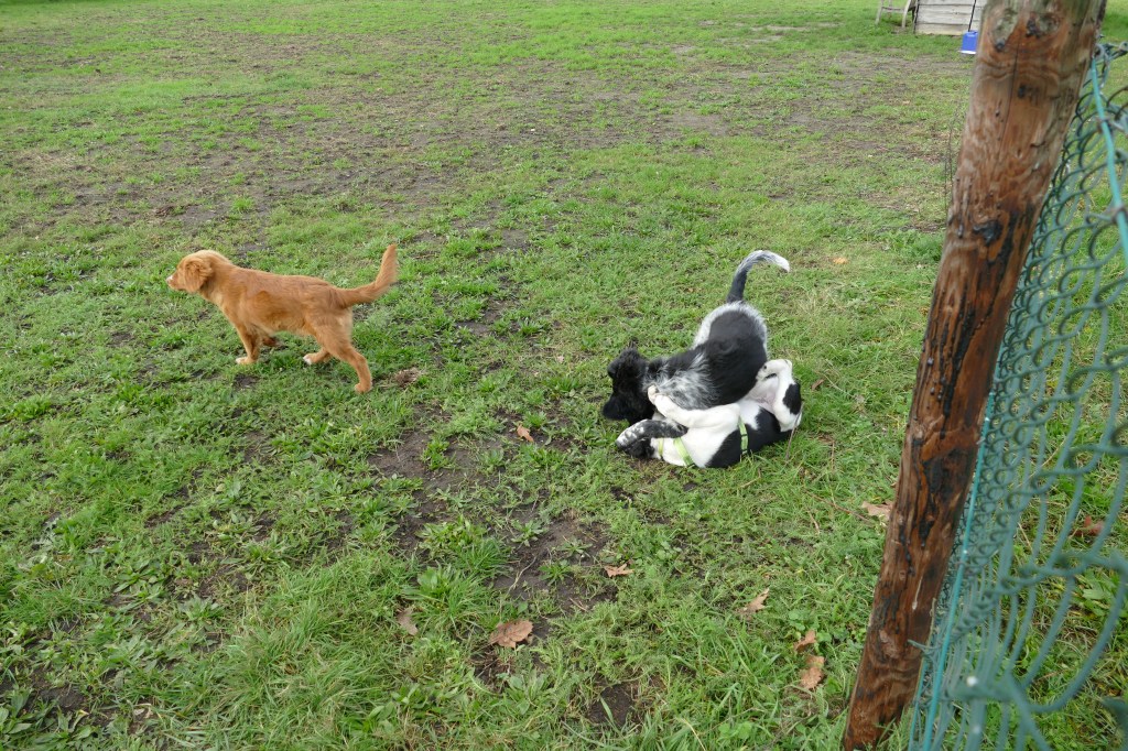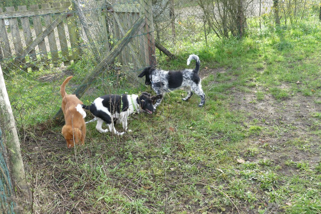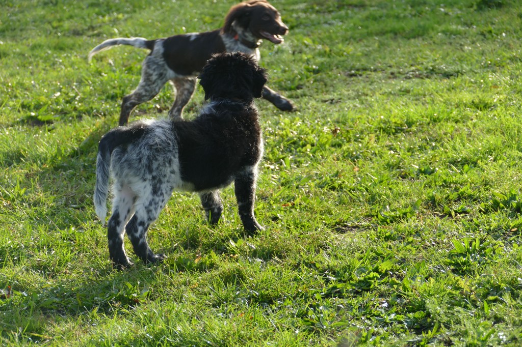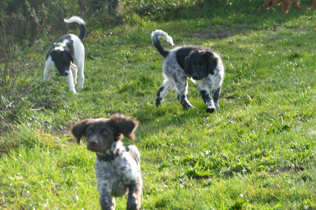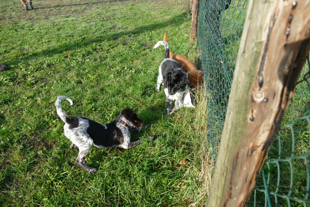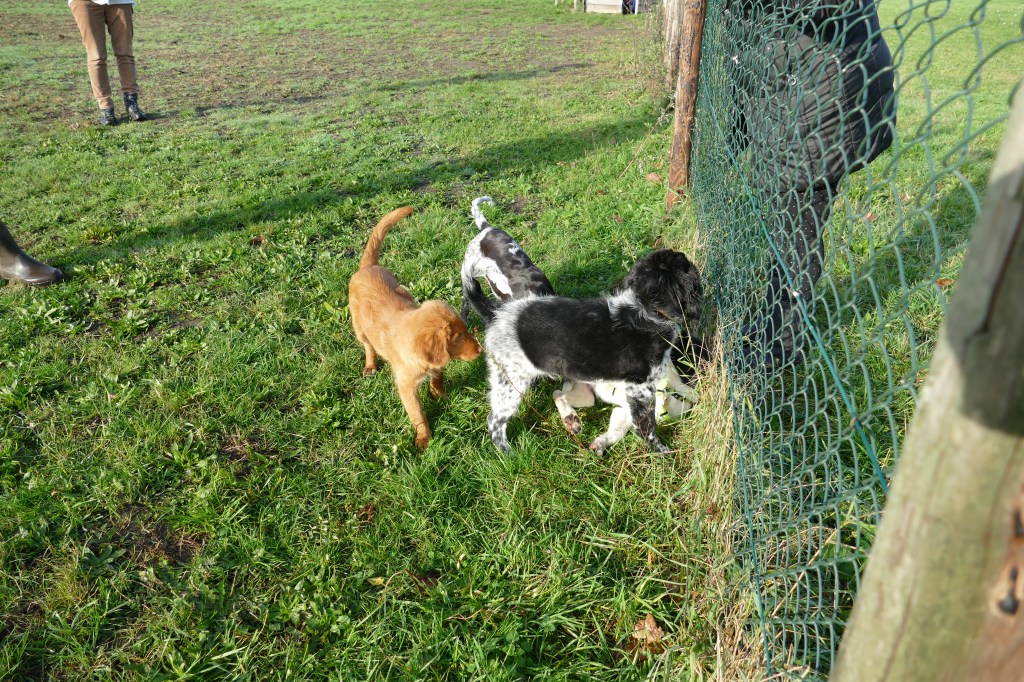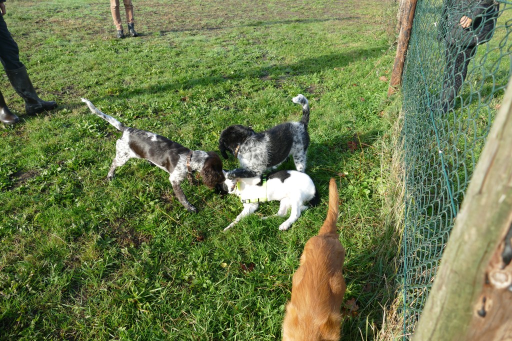 Puppycursus: Ik ben ook met Otto naar puppycursus geweest. Helaas verliep die iets anders dan ik me voorgesteld had. De 1e twee lessen verliep normaal met 9 à 10 pups. Toen kwamen er corona regels en mocht je nog maar met maximaal 4 mensen bij elkaar komen en volgden er 2 lessen met 4 pups. Daarna werden de regels nog strenger en mocht er helemaal geen les meer zijn maar konden we wel met 4 pups komen die dan 20min. met elkaar konden spelen. Zelf moeten we buiten het veld blijven. Dat waren de laatste 2 lessen voor Otto, daarna vertrok hij naar de UK. Otto speelde vrij wild met zijn puppyvriendjes, Stabij, Duitse Staander en Toller. Pups van zijn eigen formaat. Ik denk dat, dat ligt aan zijn opvoeding met en door 3 Wetterhounen.