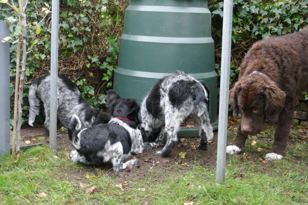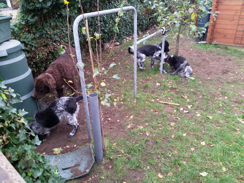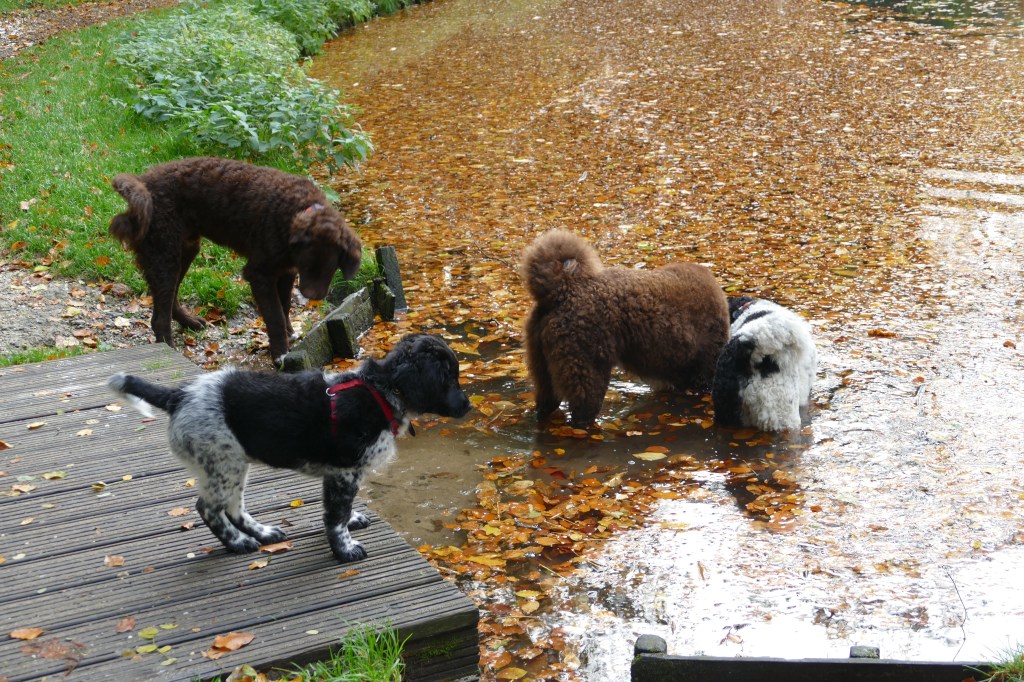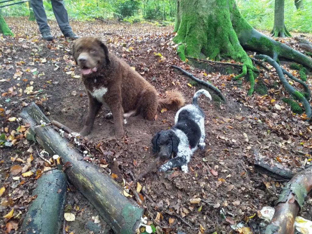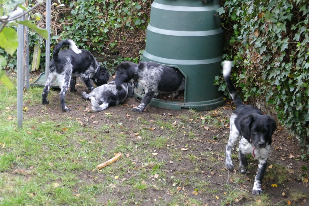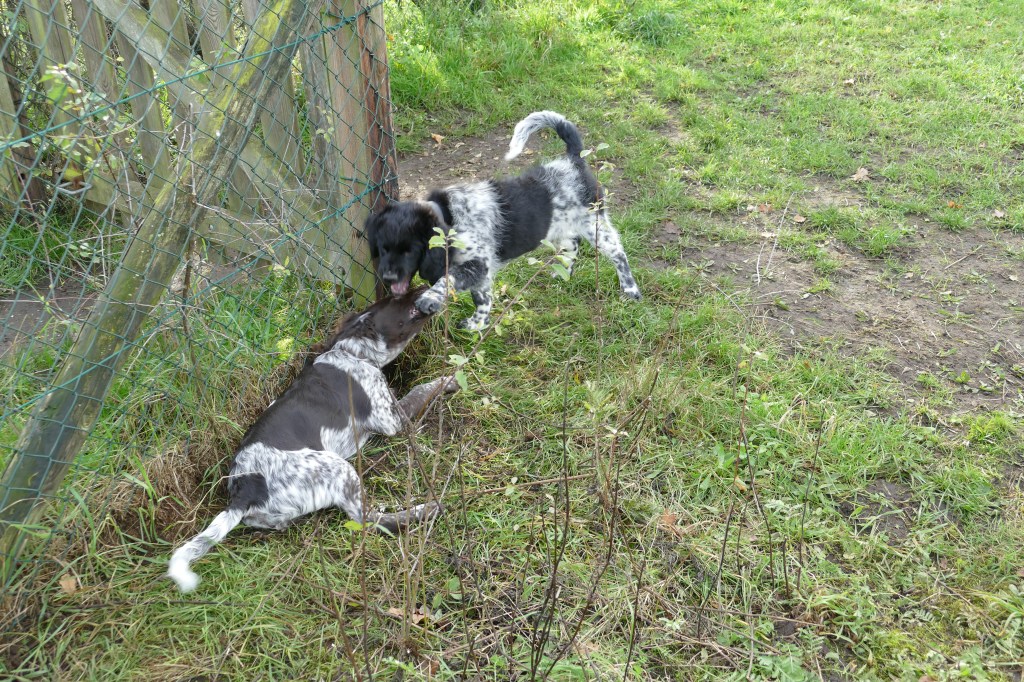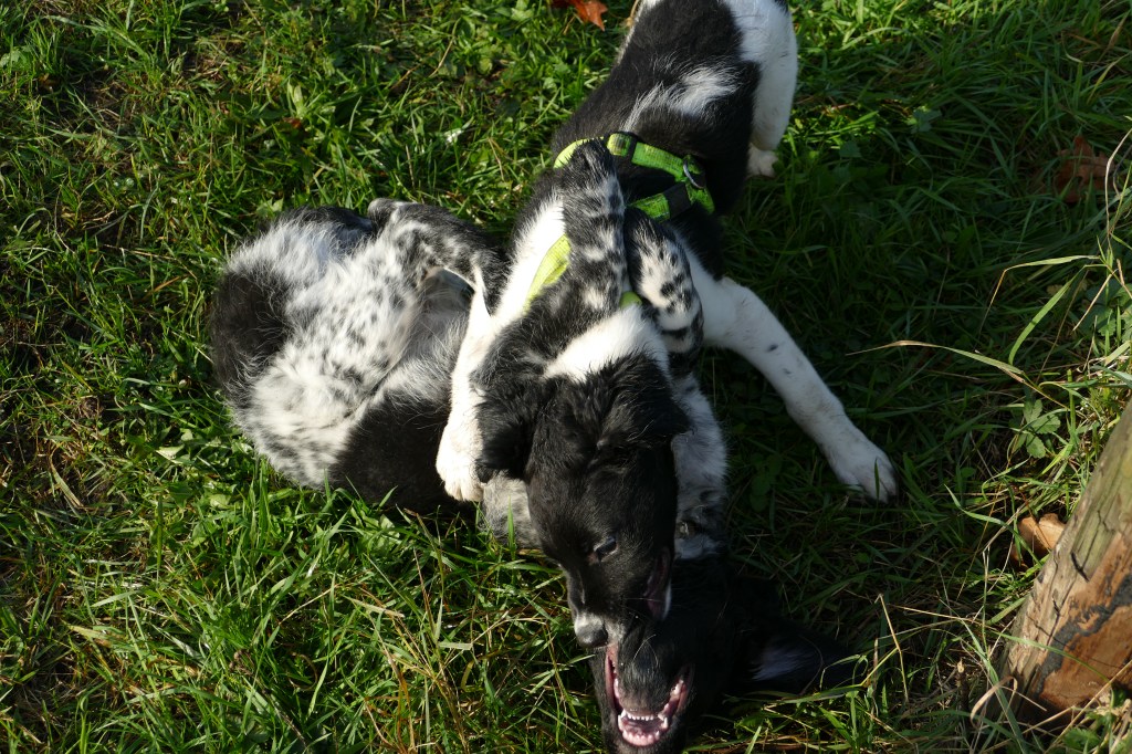 Puppycursus: Ik ben ook met Otto naar puppycursus geweest. Helaas verliep die iets anders dan ik me voorgesteld had. De 1e twee lessen verliep normaal met 9 à 10 pups. Toen kwamen er corona regels en mocht je nog maar met maximaal 4 mensen bij elkaar komen en volgden er 2 lessen met 4 pups. Daarna werden de regels nog strenger en mocht er helemaal geen les meer zijn maar konden we wel met 4 pups komen die dan 20min. met elkaar konden spelen. Zelf moeten we buiten het veld blijven. Dat waren de laatste 2 lessen voor Otto, daarna vertrok hij naar de UK. Otto speelde vrij wild met zijn puppyvriendjes, Stabij, Duitse Staander en Toller. Pups van zijn eigen formaat. Ik denk dat, dat ligt aan zijn opvoeding met en door 3 Wetterhounen.