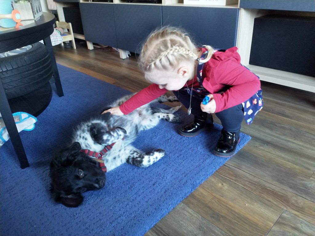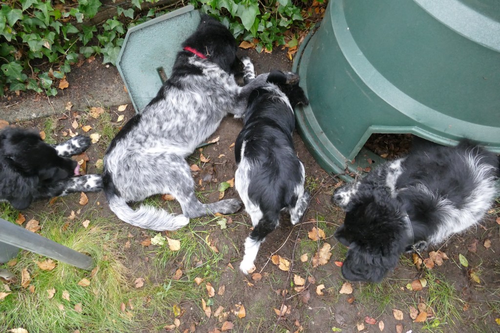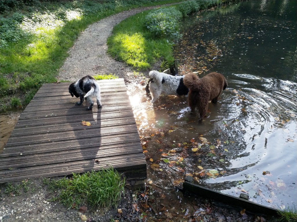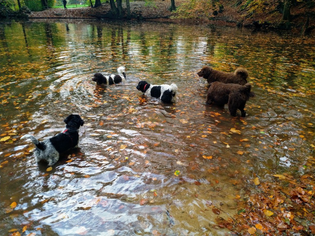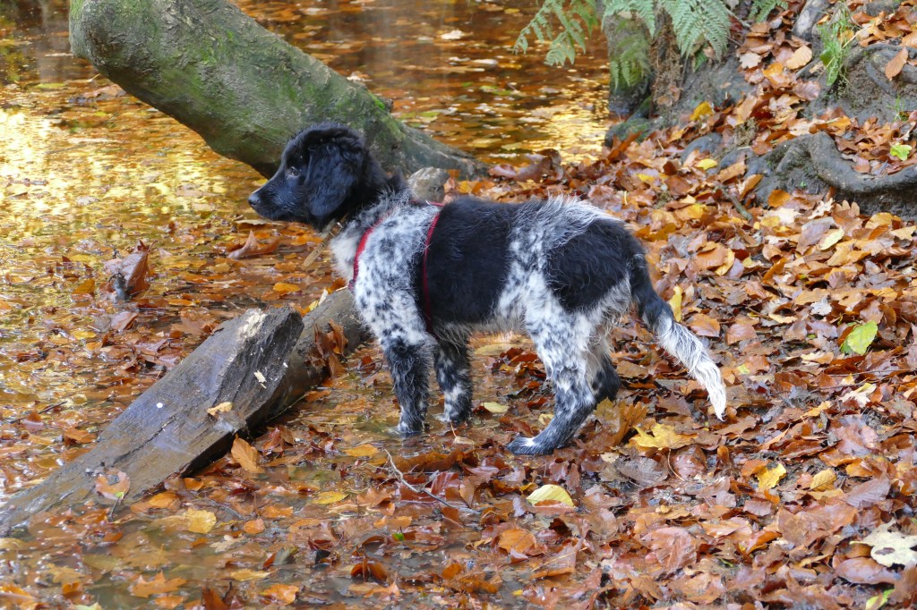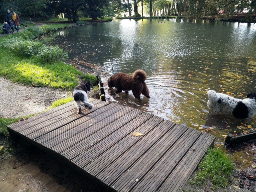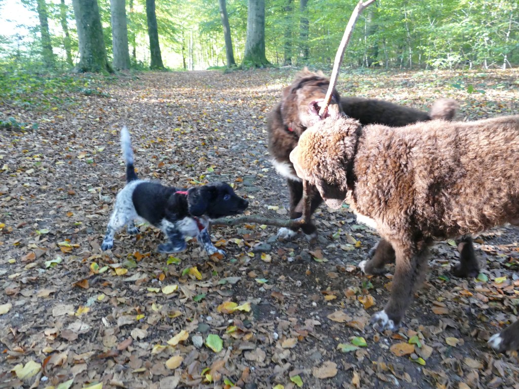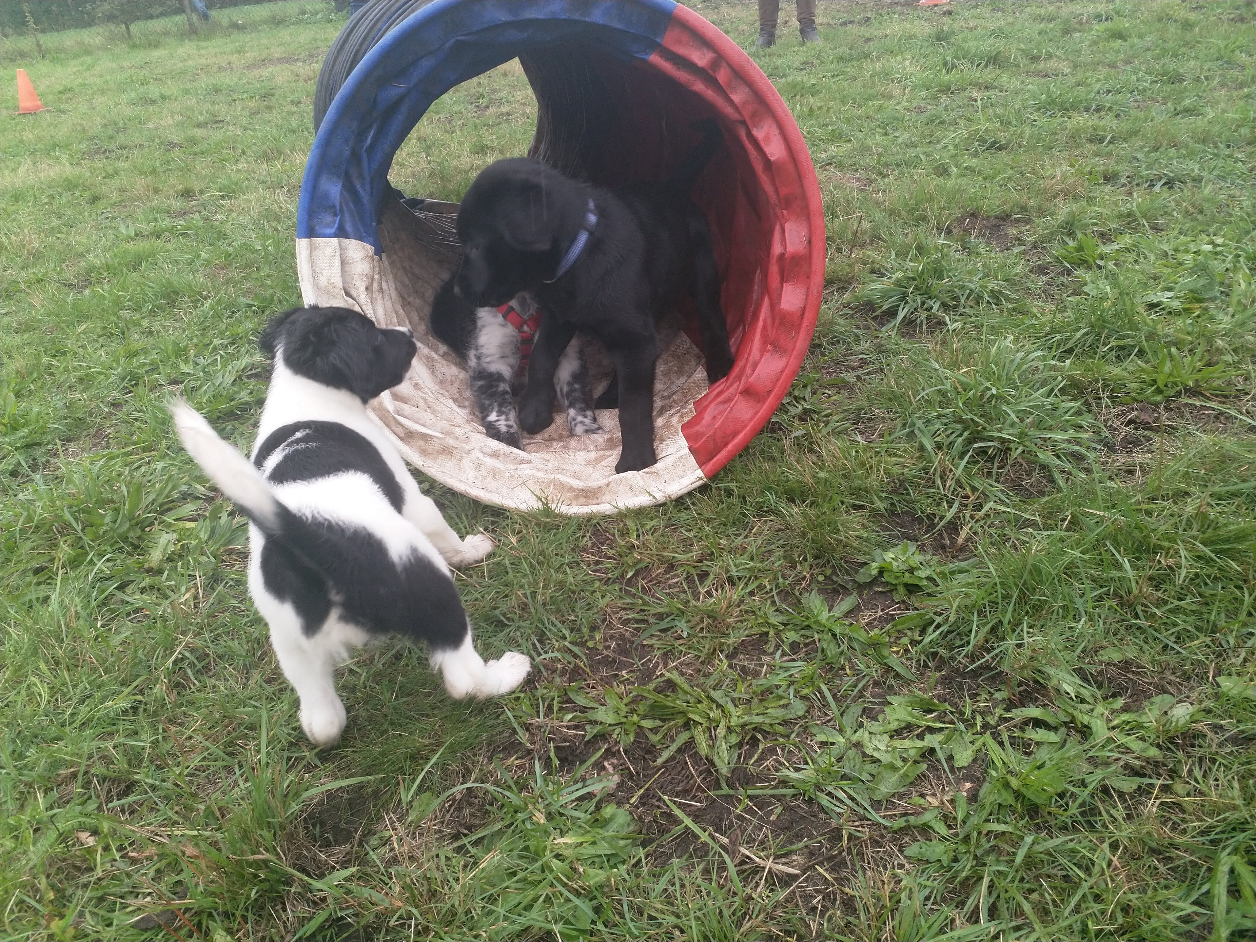 Puppycursus: Ik ben ook met Otto naar puppycursus geweest. Helaas verliep die iets anders dan ik me voorgesteld had. De 1e twee lessen verliep normaal met 9 à 10 pups. Toen kwamen er corona regels en mocht je nog maar met maximaal 4 mensen bij elkaar komen en volgden er 2 lessen met 4 pups. Daarna werden de regels nog strenger en mocht er helemaal geen les meer zijn maar konden we wel met 4 pups komen die dan 20min. met elkaar konden spelen. Zelf moeten we buiten het veld blijven. Dat waren de laatste 2 lessen voor Otto, daarna vertrok hij naar de UK. Otto speelde vrij wild met zijn puppyvriendjes, Stabij, Duitse Staander en Toller. Pups van zijn eigen formaat. Ik denk dat, dat ligt aan zijn opvoeding met en door 3 Wetterhounen.