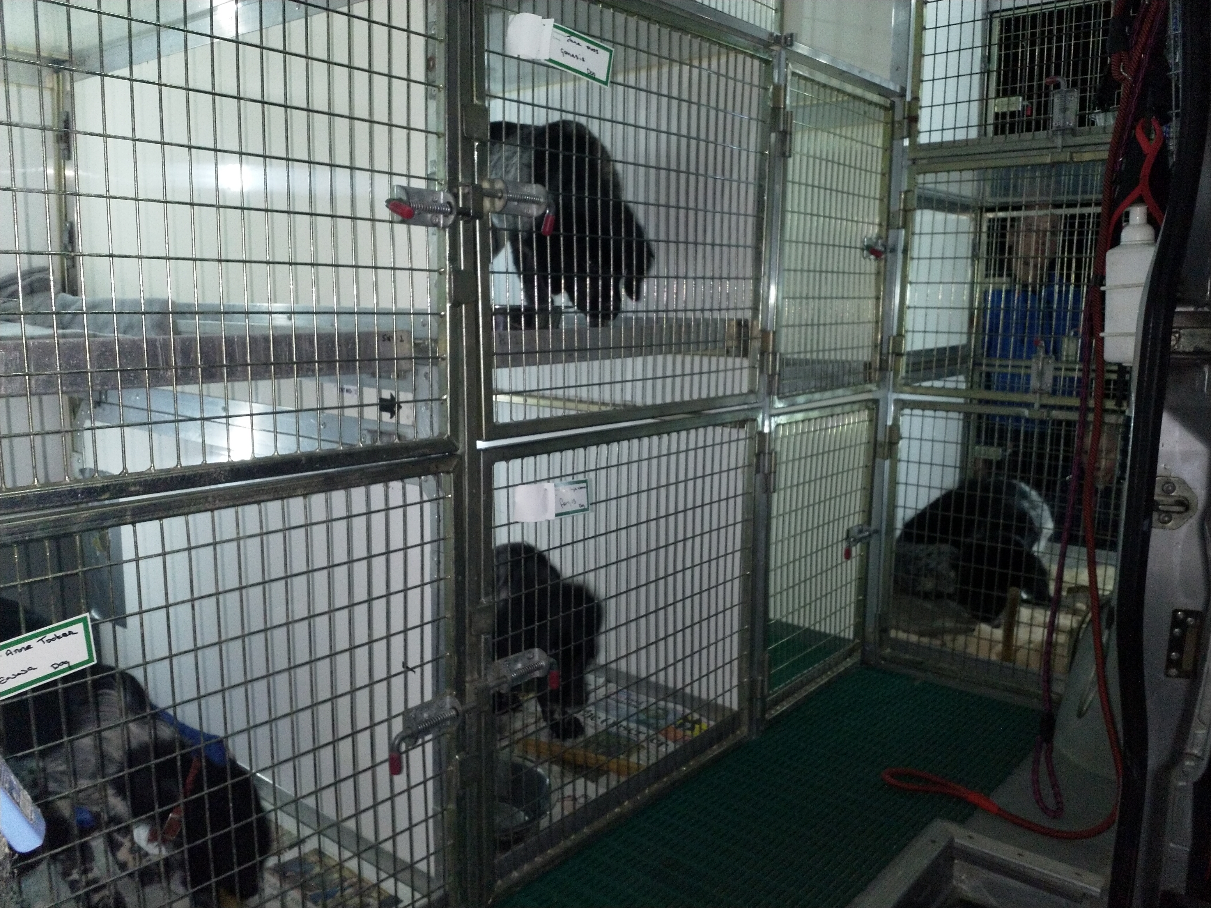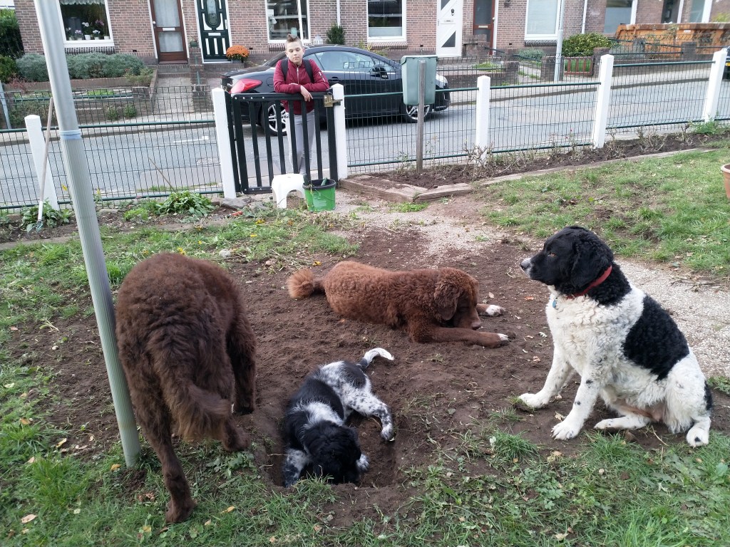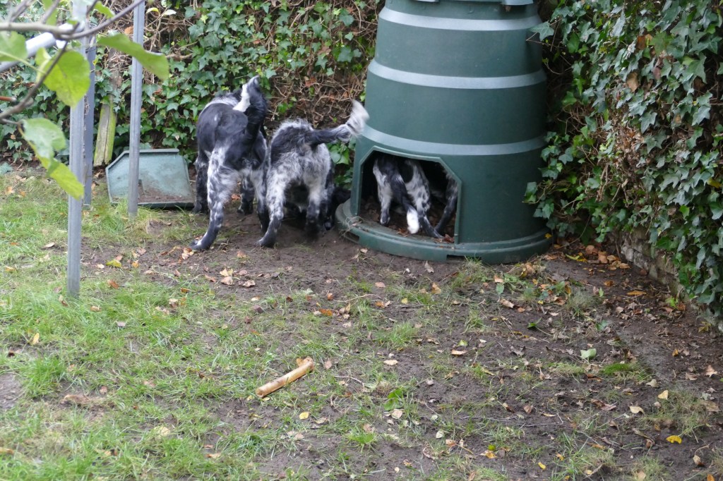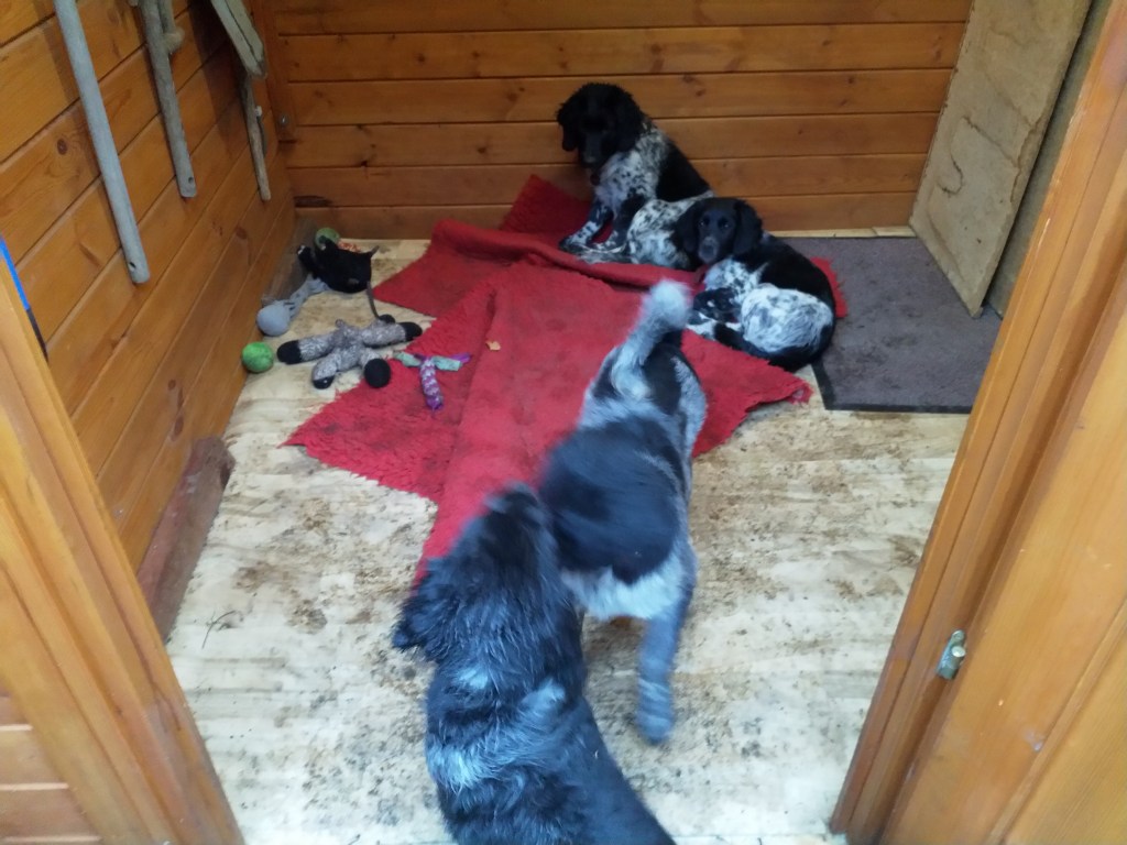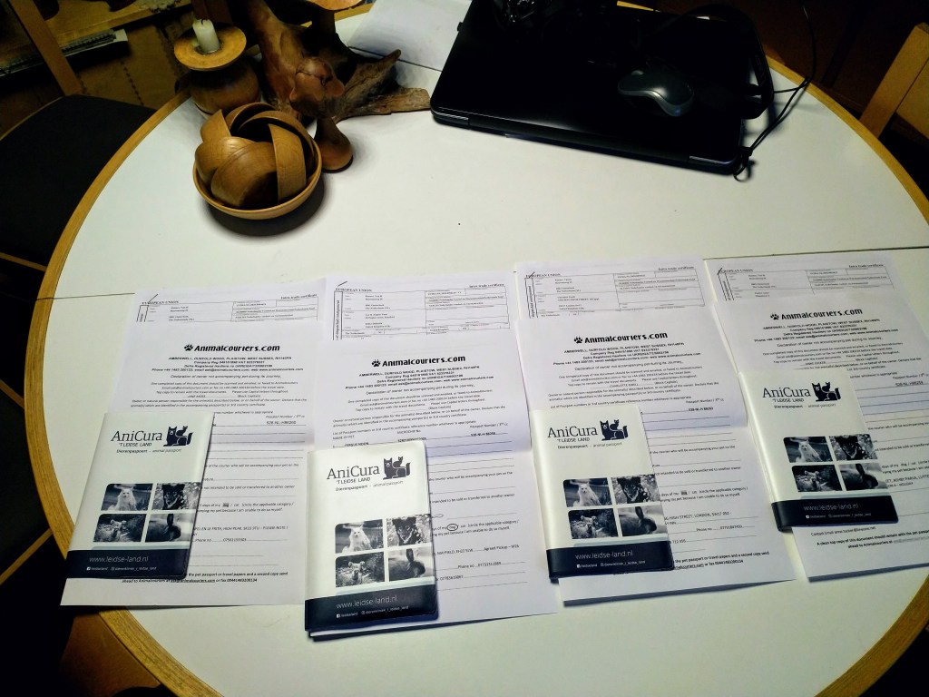 Vertrek: Op 26 oktober is Otto precies 12 weken oud en kan hij tegen Rabiës ingeënt worden. We rijden daarvoor naar Friesland om het door Douwe te laten doen. Hij krijgt ook zijn 12 weken cocktail. Ook de 2 zusjes van Otto, Genesis en Fenna en zijn broertje Fergus zullen op die dag tegen Rabiës ingeënt worden zodat ze allemaal tegelijk naar de UK kunnen verhuizen. Je kunt nog steeds niet vrij reizen op en neer naar de UK zonder 2 weken in quarantaine te moeten. De nieuwe baasjes van de honden kunnen dus niet zelf komen om hun pup op te halen in Nederland. Net als afgelopen zomer met Aafke moeten deze hondjes ook door een diertransporteur opgehaald worden. Er wordt weer gekozen voor Animal Couriers UK net als bij Aafke. Dus is er ook weer een TRACES certificaat nodig. Om de kosten te drukken stel ik voor om de pups op één plek te verzamelen waar ze gecheckt kunnen worden door de NVWA dierenarts en opgehaald door de koerier. Dan heb je maar 1x voorrij kosten. Aangezien niemand zich aanbiedt gebeurt het dus bij ons. Op maandag 16 november worden er aan het einde van de ochtend 3 Stabij pups bij ons gebracht en komt de dierenarts om 14.00uur. Die controleert de chip, de paspoorten en de formulieren. Omdat ik niet zeker weet of Tyske de 3 pups niet als indringers beschouwd houd ik haar apart en doe ik de hondjes in de “puppytuin”. Daar kunnen ze volop met elkaar spelen en ravotten en graven, dat doen ze dan ook vol overgave. Het is een beetje druilerig weer en ik heb het “hutje” weer tot puppykamer omgebouwd met een schone vloer en vetbedden tegen de kou en speelgoed. Daar kunnen ze gaan liggen als ze moe zijn. Door het vochtige weer worden de pups hartstikke smerig en ook de vloer van het “hutje” blijft niet schoon maar ze vermaken zich prima. Om 18.00uur staat Animal Couriers bij ons voor de deur. Alle formulieren en de paspoorten worden nogmaals gecheckt en dan gaan ze, ieder in een ruime kooi met water en schone kleedjes en in gezelschap van een kat, hun nieuwe toekomst tegemoet. Het is niet leuk om ze op deze manier te laten vertrekken maar het is zo wel het beste geregeld nu je niet zelf kunt reizen. De koerier rijdt naar Calais en zal in Frankrijk nog een hondje oppikken. In Calais gaat hij met de honden in een “pet friendly” hotel en probeert de volgende dag zo vroeg mogelijk te boot te nemen naar de overkant. Hij heeft met de eigenaren van de pups afgesproken op een parkeerplaats aan de M6 om de honden daar te overhandigen want ze gaan naar verschillende plaatsen in de UK. Otto gaat naar Londen, Fergus gaat in Schotland wonen, Genesis in het Peak District en Fenna ergens in de buurt van Birmingham. De volgende dag horen we heel laat dat de pups op de boot zitten, om half acht ’s avonds pas. Het blijkt erg druk te zijn, lange files voor de boot en de tunnel i.v.m. de naderende Brexit. De pups hebben hier niet zoveel last van gehad, er was volop gelegenheid om ze uit te laten in Calais. Om half elf ’s avonds krijgen we bericht dat de pups hun baasjes gevonden hebben. Sommige baasjes hebben al vanaf half een op de parkeerplaats gewacht en moeten dan nog een hele reis maken terug naar huis.