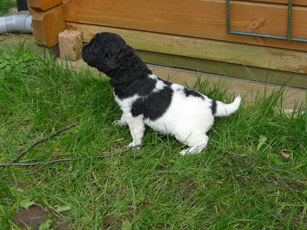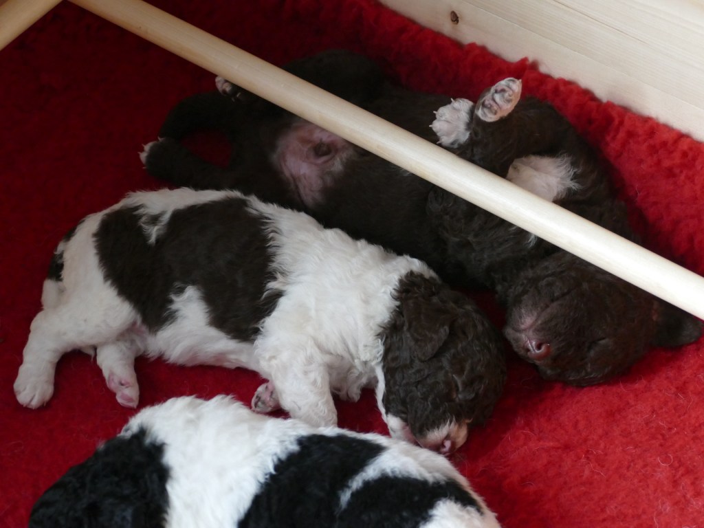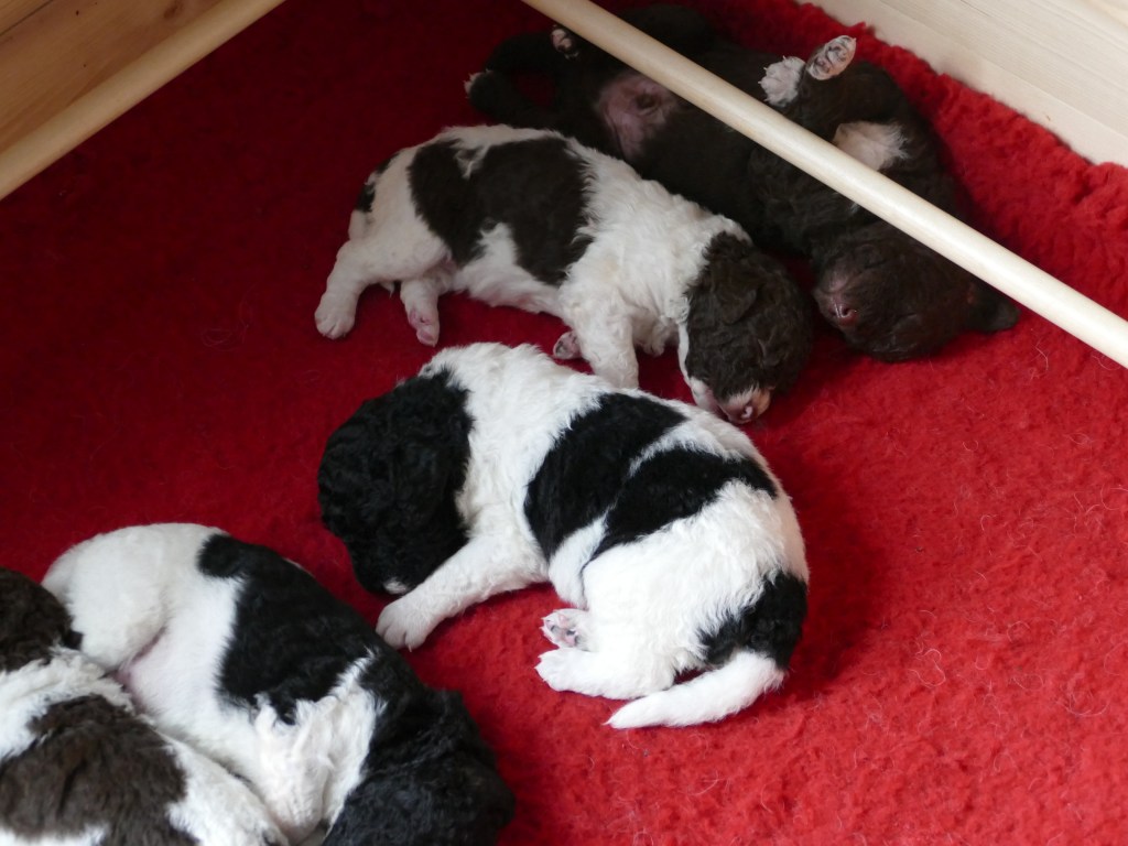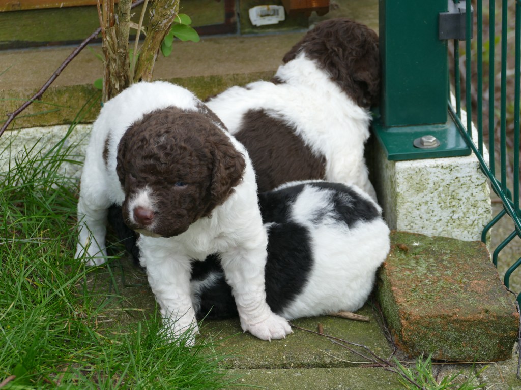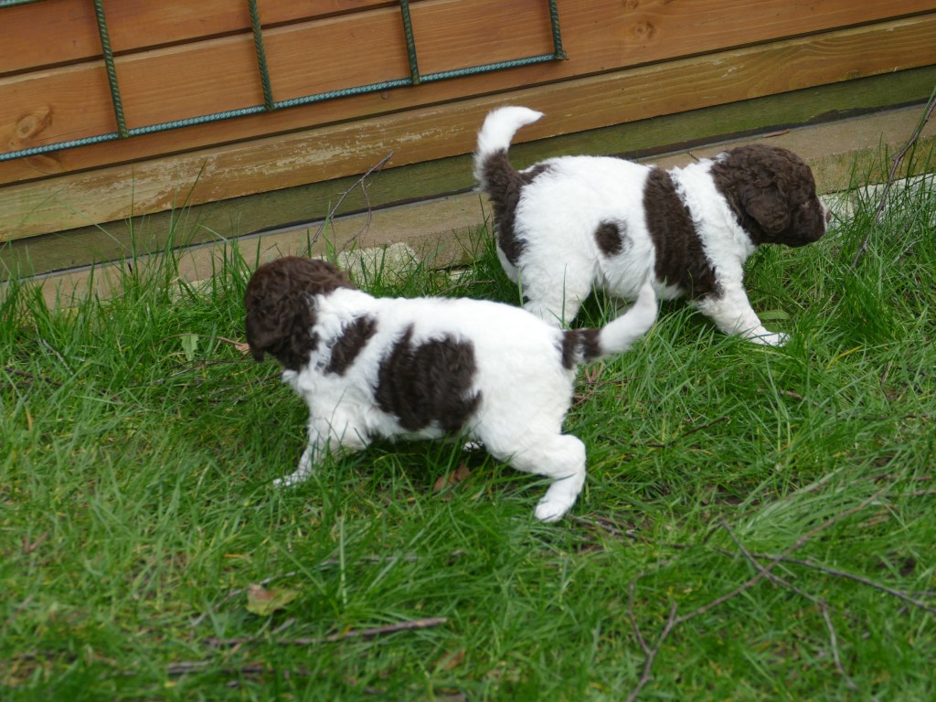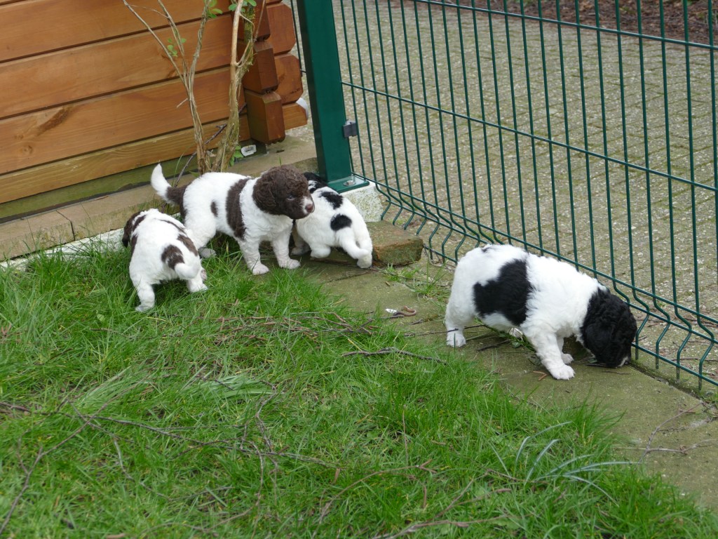 De 4e week gaat in. Ze zijn alweer 3 weken oud en het beginnen al echte hondjes te worden met blafjes en grommetjes. Als ze allemaal tegelijk aan het woord zijn is het een hels kabaal. Ze lopen door de kist, zijn al wat meer wakker en beginnen met elkaar te spelen. Kleine worstelpartijen en spelbogen zijn te zien. Er wordt in oren en poten gehapt. Fimme ligt op zijn rug met zijn poten naar zijn broertjes te maaien, anderen zijn actiever en Aafke probeert het gedoe van haar broers te negeren. De tandjes zijn bij allen doorgekomen. Ook beginnen ze meer op ons en onze stem te reageren. Als het hele stel in diepe rust is en je begint tegen ze te praten zijn ze in een mum van tijd in beweging. Tyske moet snel in de kist in gaan liggen anders zijn er al een paar buiten de kist. Vaak is ze eerst bezig de zaak schoon te maken want ze is wel erg netjes, die meid van ons. Ze kunnen er nu ook uitklimmen maar als we de ingang verhogen durft Tyske er niet meer in. Ze wil er niet in springen bang dat ze op een van haar kinderen springt. Soms hangen ze zo snel aan haar tepels dat ze niet meer de kans krijgt om te gaan zitten of liggen.