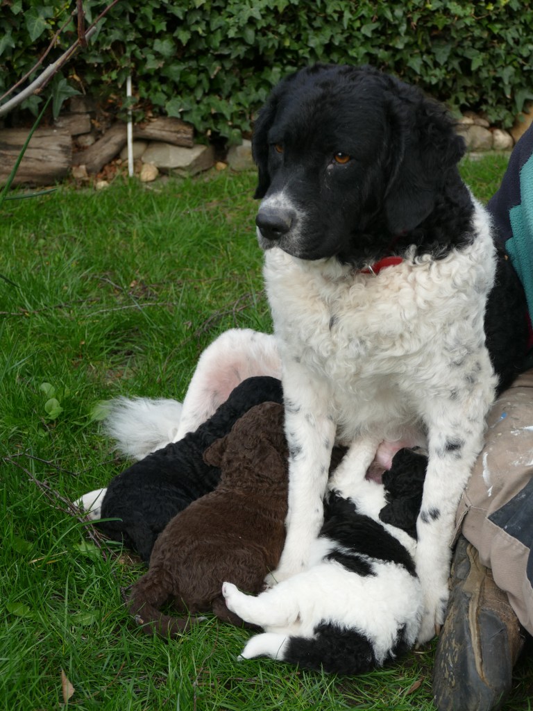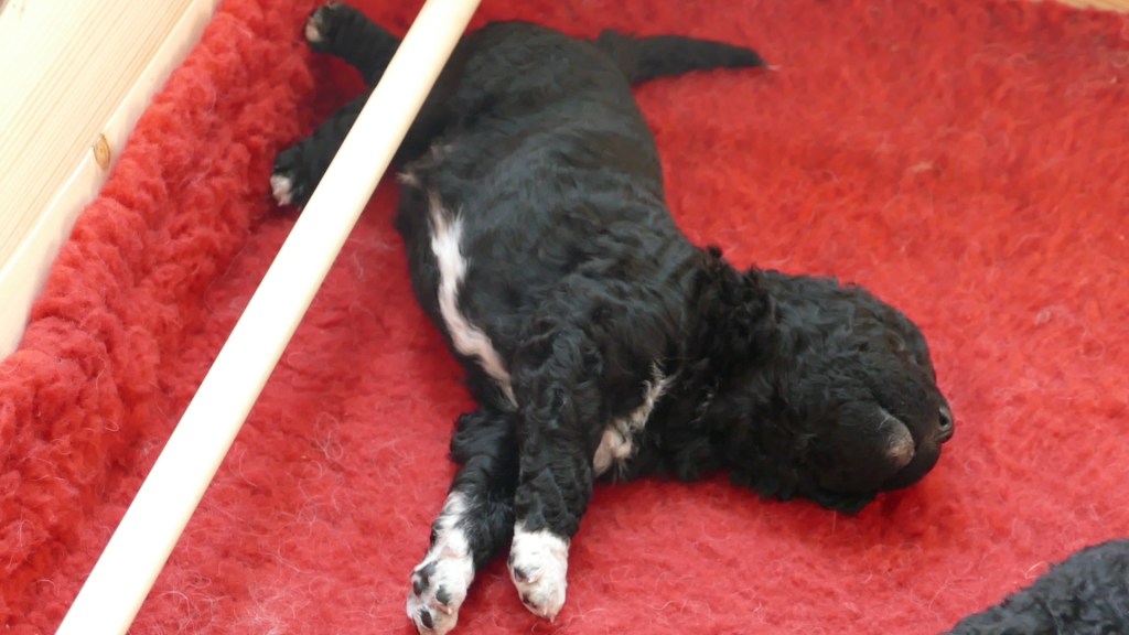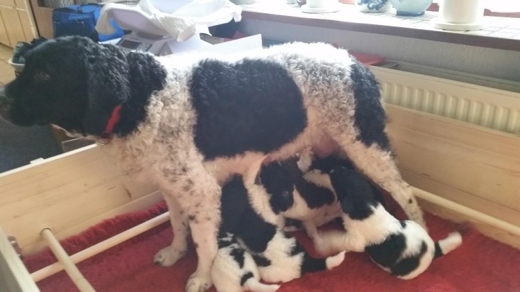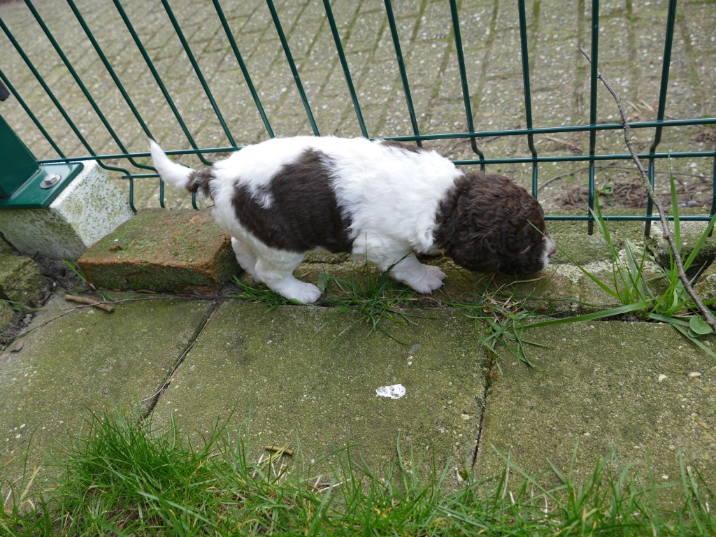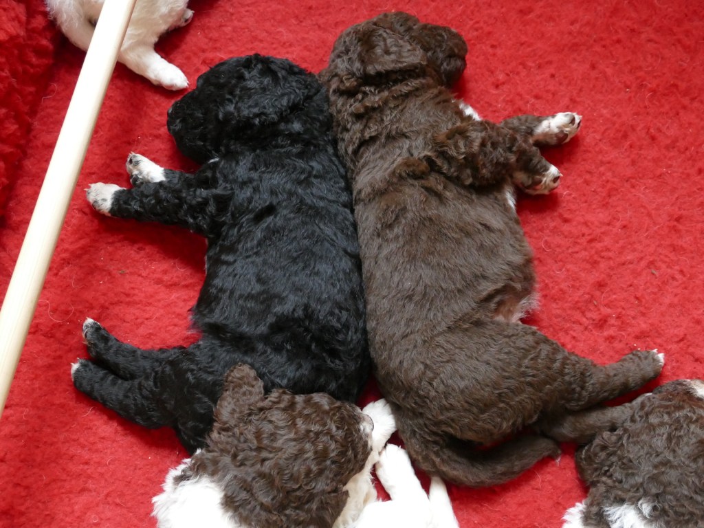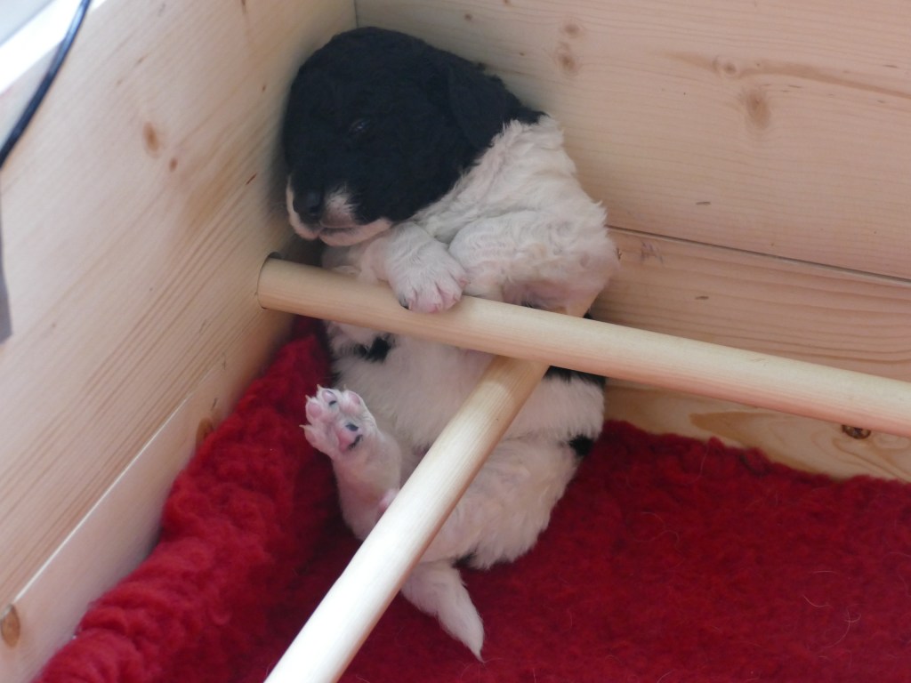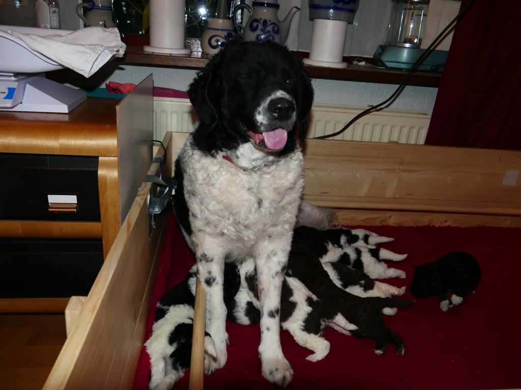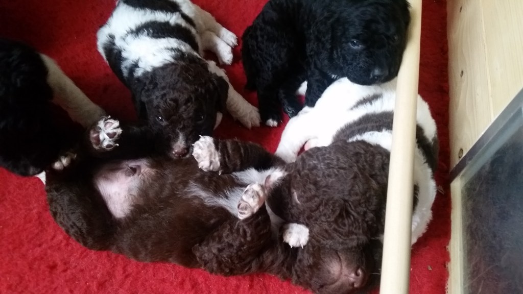 De 4e week gaat in. Ze zijn alweer 3 weken oud en het beginnen al echte hondjes te worden met blafjes en grommetjes. Als ze allemaal tegelijk aan het woord zijn is het een hels kabaal. Ze lopen door de kist, zijn al wat meer wakker en beginnen met elkaar te spelen. Kleine worstelpartijen en spelbogen zijn te zien. Er wordt in oren en poten gehapt. Fimme ligt op zijn rug met zijn poten naar zijn broertjes te maaien, anderen zijn actiever en Aafke probeert het gedoe van haar broers te negeren. De tandjes zijn bij allen doorgekomen. Ook beginnen ze meer op ons en onze stem te reageren. Als het hele stel in diepe rust is en je begint tegen ze te praten zijn ze in een mum van tijd in beweging. Tyske moet snel in de kist in gaan liggen anders zijn er al een paar buiten de kist. Vaak is ze eerst bezig de zaak schoon te maken want ze is wel erg netjes, die meid van ons. Ze kunnen er nu ook uitklimmen maar als we de ingang verhogen durft Tyske er niet meer in. Ze wil er niet in springen bang dat ze op een van haar kinderen springt. Soms hangen ze zo snel aan haar tepels dat ze niet meer de kans krijgt om te gaan zitten of liggen.