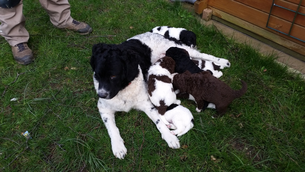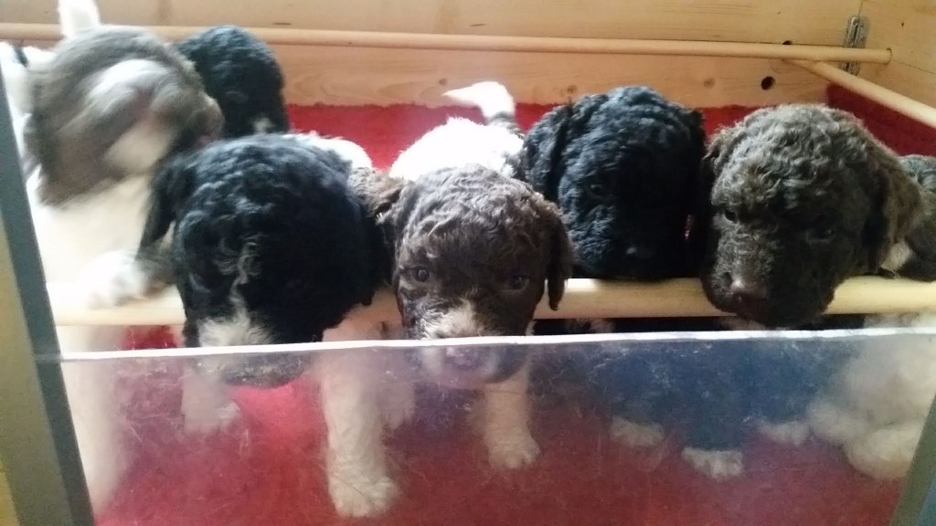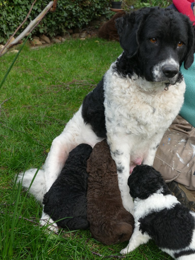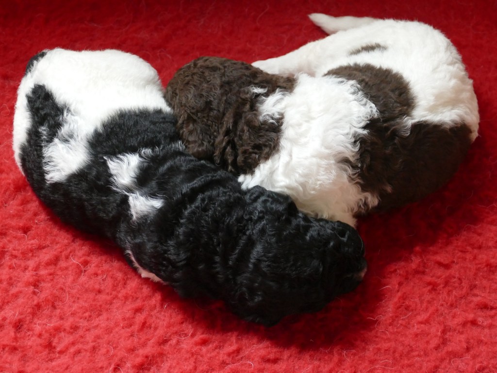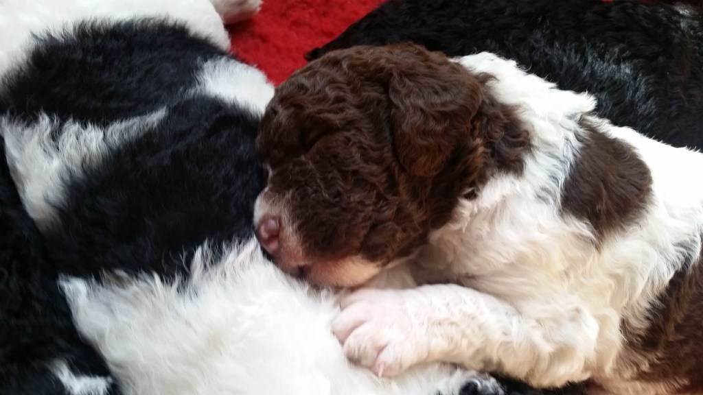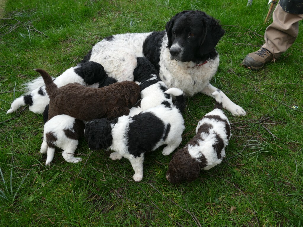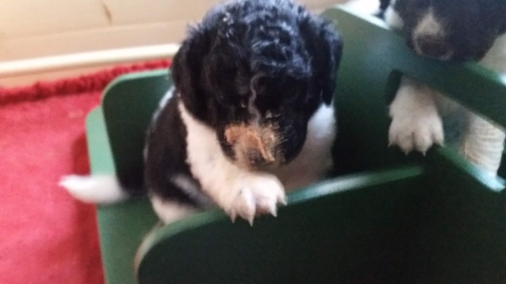 De 4e week gaat in. Ze zijn alweer 3 weken oud en het beginnen al echte hondjes te worden met blafjes en grommetjes. Als ze allemaal tegelijk aan het woord zijn is het een hels kabaal. Ze lopen door de kist, zijn al wat meer wakker en beginnen met elkaar te spelen. Kleine worstelpartijen en spelbogen zijn te zien. Er wordt in oren en poten gehapt. Fimme ligt op zijn rug met zijn poten naar zijn broertjes te maaien, anderen zijn actiever en Aafke probeert het gedoe van haar broers te negeren. De tandjes zijn bij allen doorgekomen. Ook beginnen ze meer op ons en onze stem te reageren. Als het hele stel in diepe rust is en je begint tegen ze te praten zijn ze in een mum van tijd in beweging. Tyske moet snel in de kist in gaan liggen anders zijn er al een paar buiten de kist. Vaak is ze eerst bezig de zaak schoon te maken want ze is wel erg netjes, die meid van ons. Ze kunnen er nu ook uitklimmen maar als we de ingang verhogen durft Tyske er niet meer in. Ze wil er niet in springen bang dat ze op een van haar kinderen springt. Soms hangen ze zo snel aan haar tepels dat ze niet meer de kans krijgt om te gaan zitten of liggen.