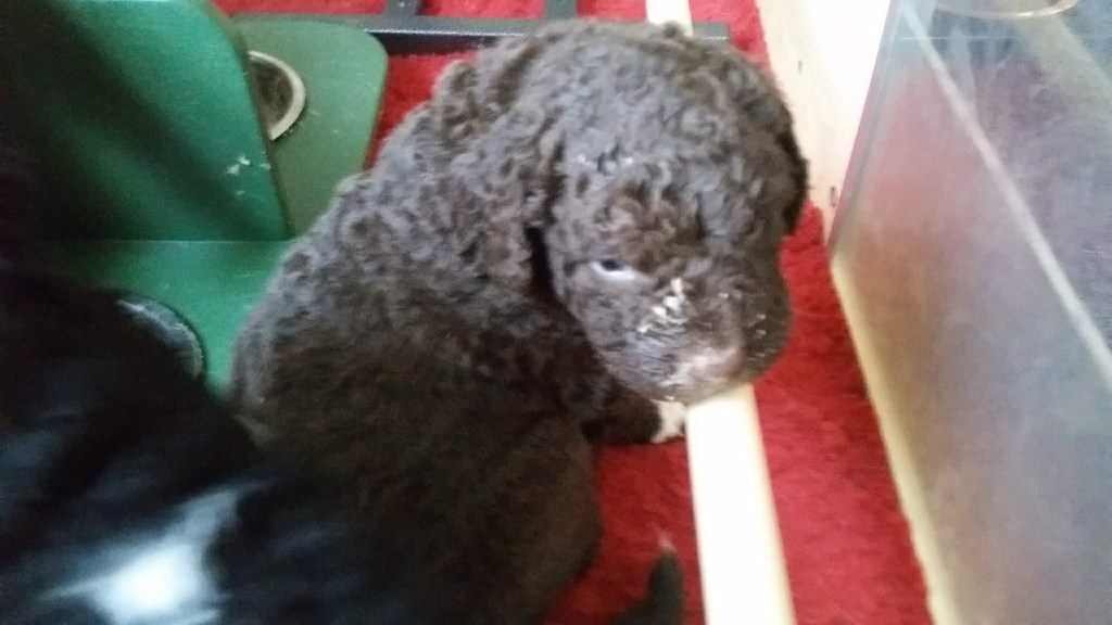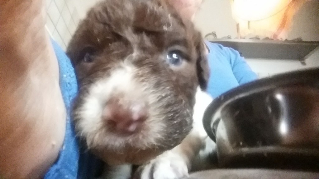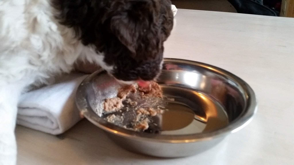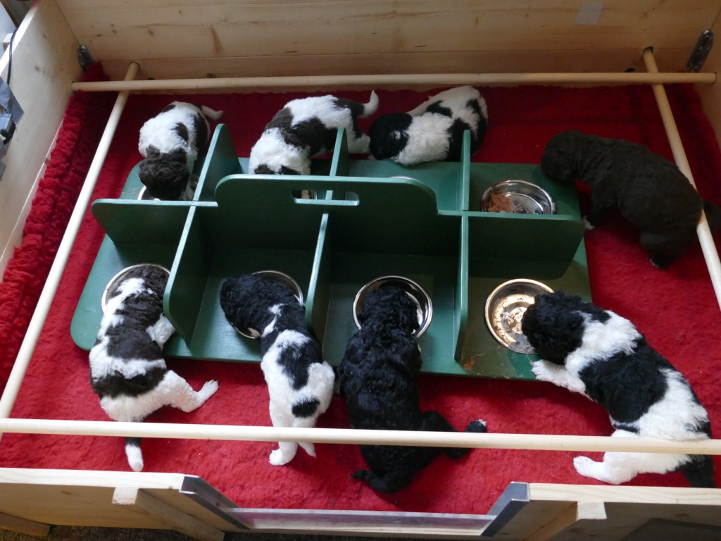 Donderdag is er ook weer een nieuwe stap in een puppyleven. Vast voer. We beginnen met een starters mousse voor pups. Een zachte vlees paté die ze makkelijk kunnen eten. Maar eerst moeten ze leren eten. Ik verdeel 1 blikje over 8 pups en geef het 3x per dag om te beginnen. De eerste keer ’s ochtends om 11 uur. Sommige snappen vrij snel wat de bedoeling is anderen moeten even aangespoord worden. Allemaal stoppen ze hun voorpootjes in het bakje met gevolg een grote smeerboel. Ik voer ze op schoot 1 voor 1 en ik zit zelf ook helemaal onder. Het duurt een uur voordat ze allemaal gegeten hebben. “s Middags hebben sommige al door wat ze moeten doen en het gaat al een stuk beter. De buurkinderen komen binnenvallen en die zet ik maar gelijk aan het werk. Joop is een mooie standaard aan het maken voor 8 voerbakjes, die is binnenkort klaar. Ik hoop dat ze dan zelf kunnen eten.