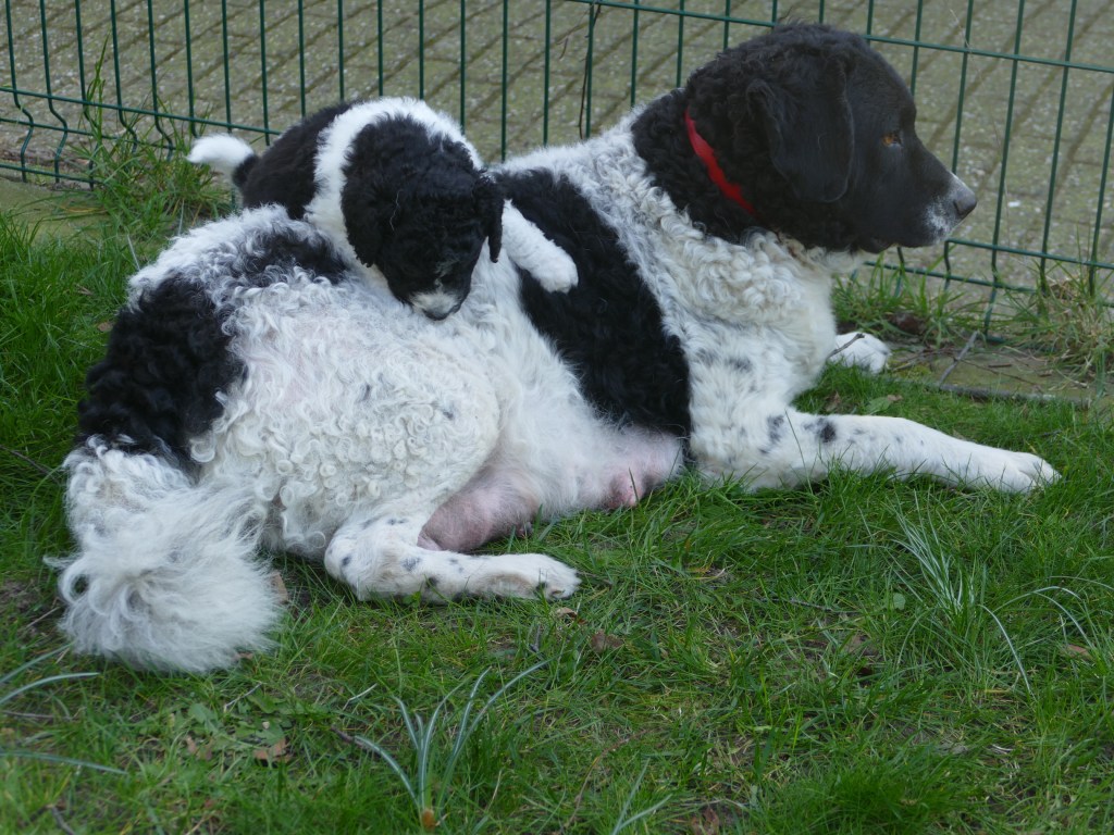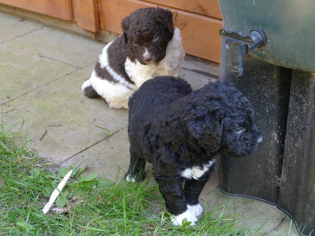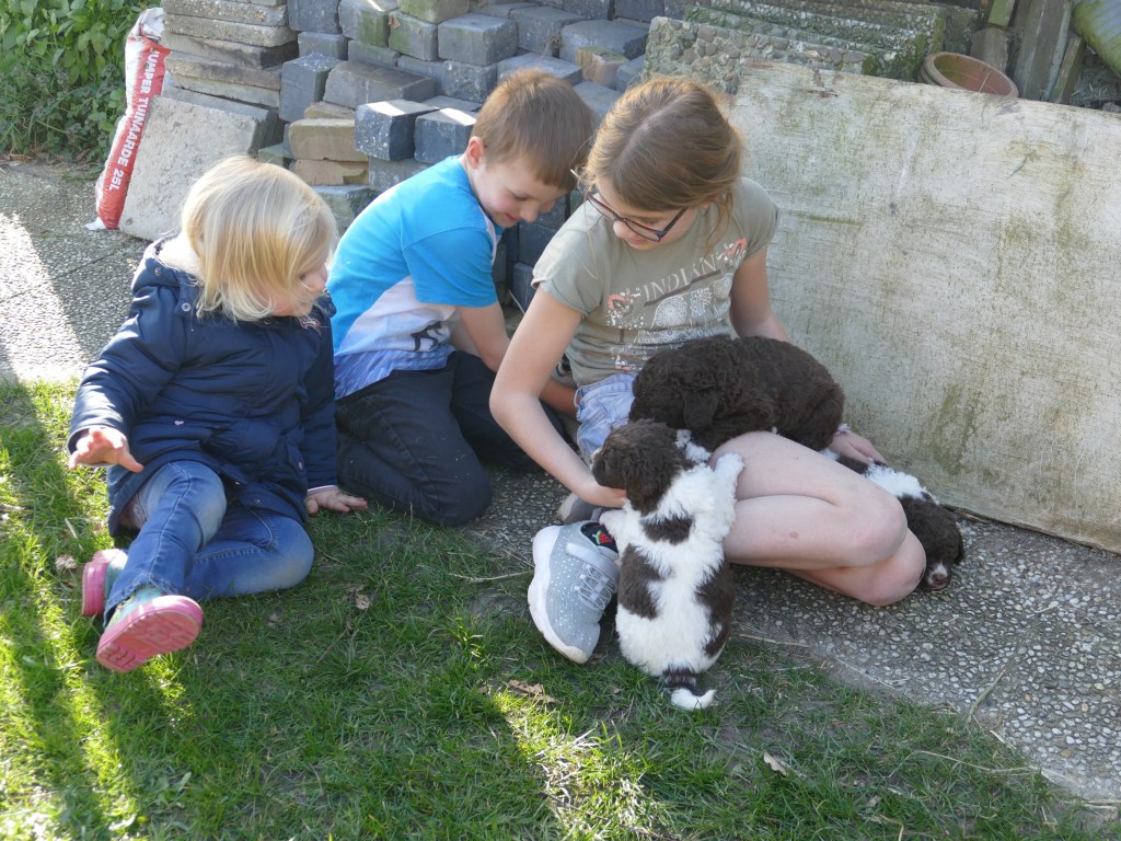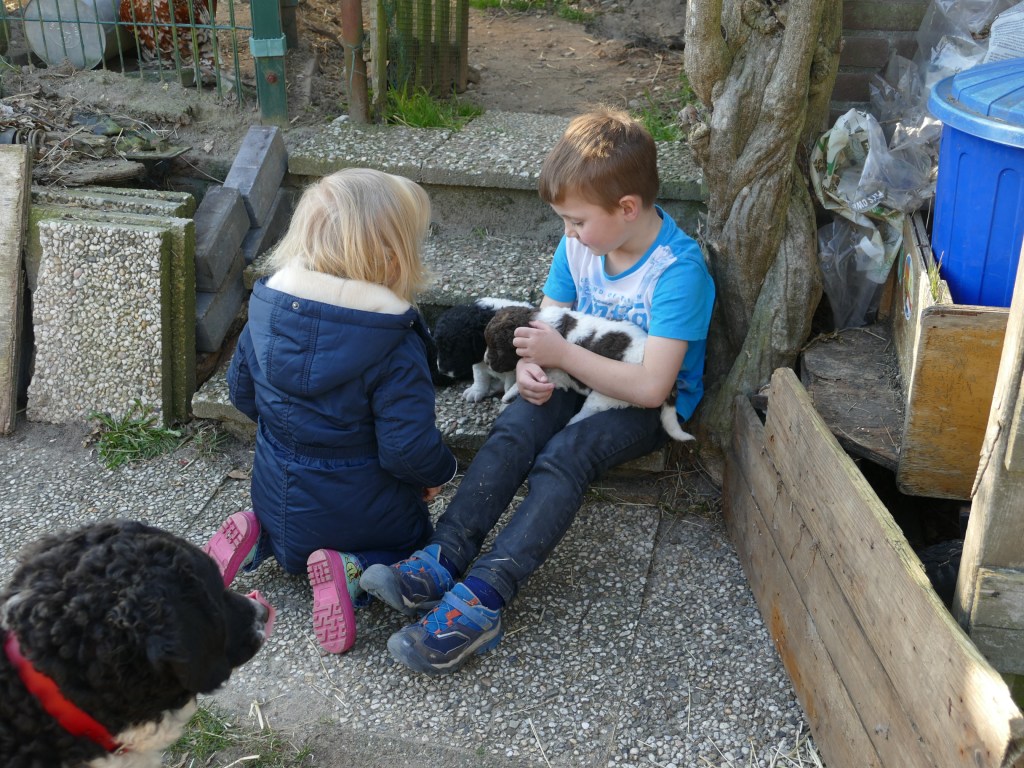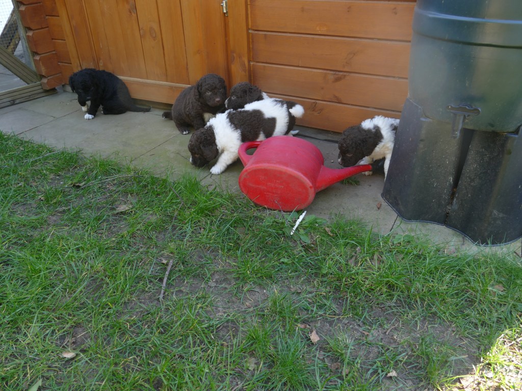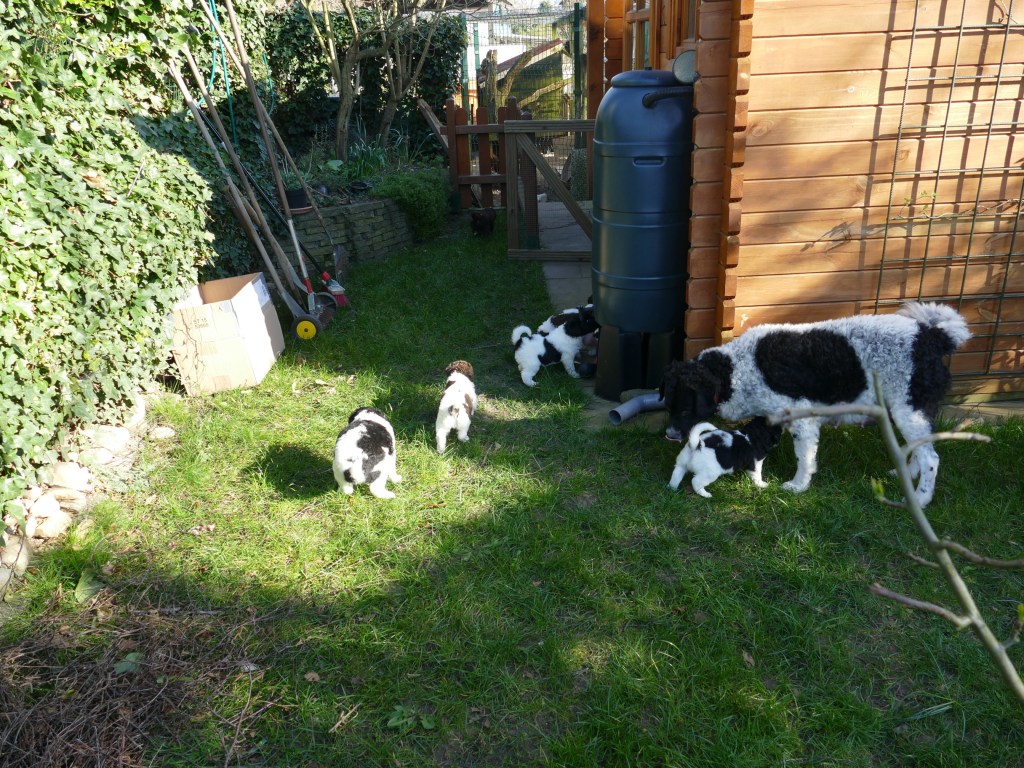 Op maandag zijn de pups al weer 4 weken oud. Het gaat hard en tijd voor de 2e wormkuur. Dat gaat nu een stuk beter dan 2 weken geleden. Nu hebben ze leren eten. Dus de pasta wordt ook naar binnen gesmikkeld. Veel minder een knoeiboel dan de vorige keer. Deze keer geen diarree maar ze liggen de hele middag te slapen. Het is heel zonnig buiten maar er staat een koude oostenwind dus toch niet naar buiten. Op dinsdag proberen we het wel. We dachten de tuin mooi afgezet te hebben zodat ze nergens naar toe kunnen maar ze hebben ontdekt dat ze tussen de spijlen van het hek door passen en dat heeft een onweerstaanbare aantrekkingskracht. Dus we blijven bezig om ze terug in de tuin te zetten. Ondertussen is daar de zon weg dus we zetten ze in een ander stuk tuin waar wel zon is. De buurkinderen krijgen er lucht van dat ze buiten zijn en komen puppy knuffelen. Als ze weg kruipen om een dutje te doen gaan ze weer naar binnen. Daar is het te koud voor. Woensdag gaan ze eerder naar buiten, net na het middag maaltje. Dat is handig want dan poepen ze in de tuin en hebben we het niet in de kist. Dat scheelt weer een hoop kranten want daar begint een chronisch tekort aan te ontstaan. De temperatuur is ook lekkerder want er is minder wind. Oh, wat worden ze al groot, ze rennen door de tuin. Buiten is zo veel afleiding dan is het ieder voor zich maar in de kist wordt er heel wat af gestoeid en er klinken af en toe harde kreten omdat ze elkaar pijn doen. Ook dat moeten ze leren “hoe hard kun je in een broertje of zusje bijten zonder dat ze geluid geven”. Na zoveel activiteit is het weer een hele tijd rustig en slapen ze en………… groeien dat ze doen. Nu, met vast voer, zijn ze duidelijk versneld aan het groeien. Tyske komt af en toe de kist in om “gemolken” te worden. We zijn het nu bij haar aan het afbouwen. Ze woog vorige week nog maar 23,9kg ondanks al het extra voer wat ze kreeg. Nu weer gewogen en ze is al weer ruim 2kg aangekomen: 26,2kg. We gaan haar weer de gewone adult brokken geven zodat de melkproductie ook af gaat nemen. Aan het einde van de week is de tuin ook niet meer spannend en interessant en stoeien en spelen ze ook met elkaar in de tuin.