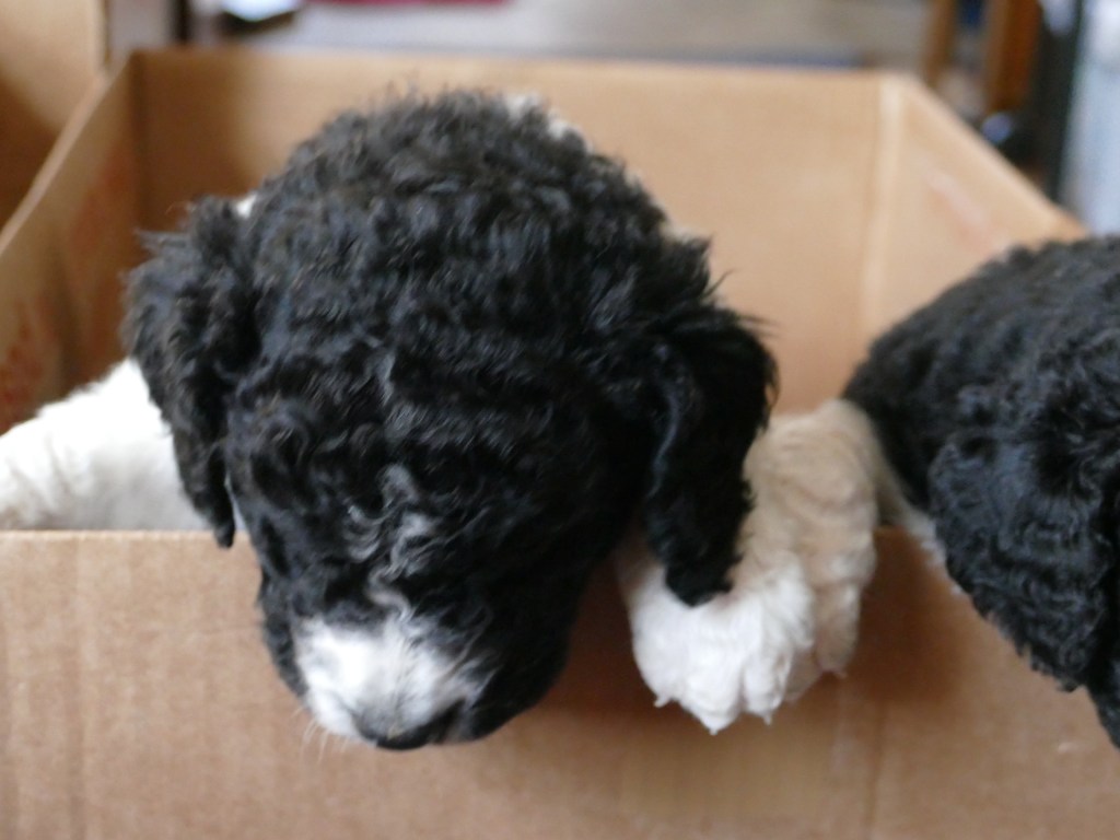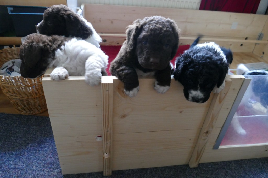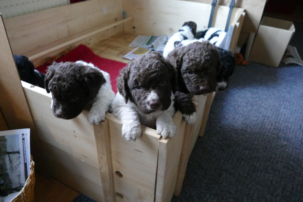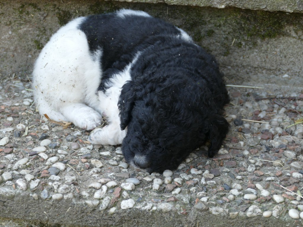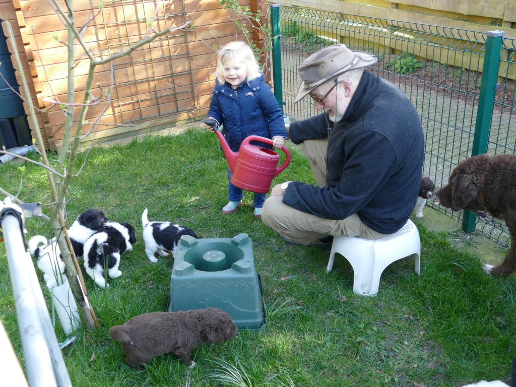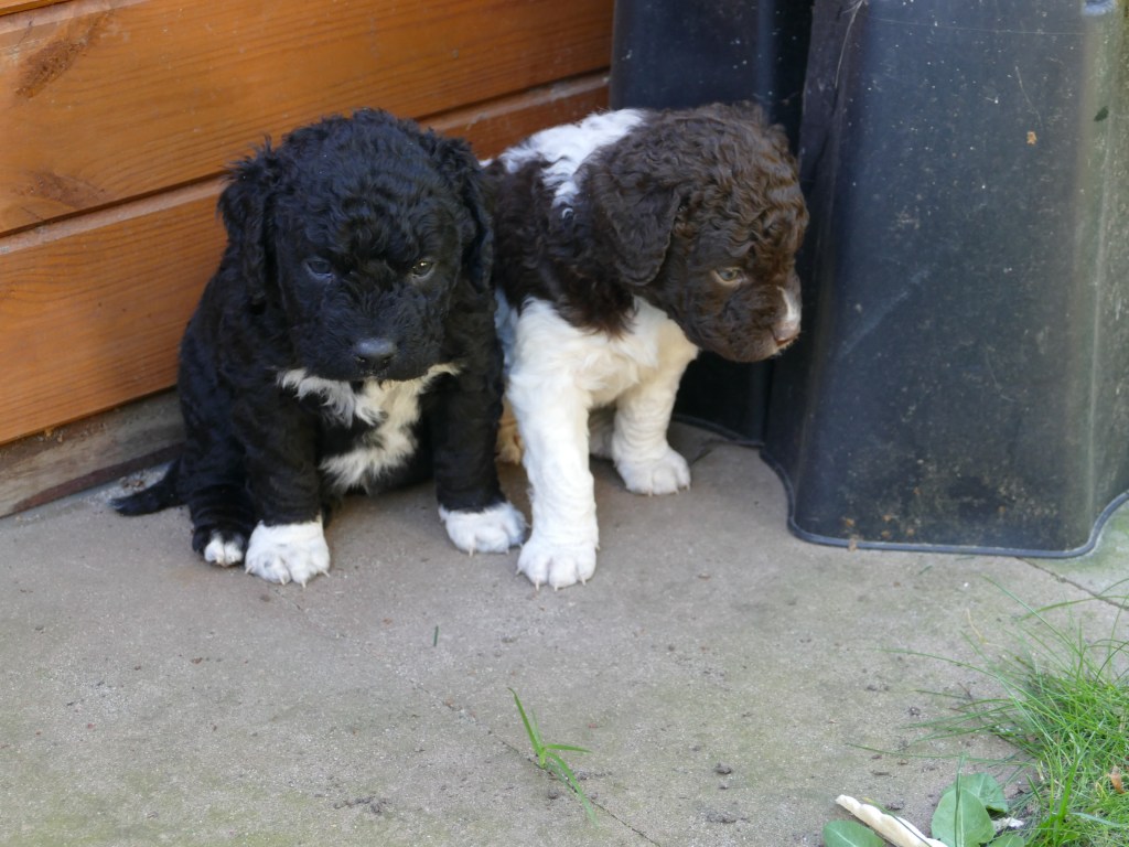Op maandag zijn de pups al weer 4 weken oud. Het gaat hard en tijd voor de 2e wormkuur. Dat gaat nu een stuk beter dan 2 weken geleden. Nu hebben ze leren eten. Dus de pasta wordt ook naar binnen gesmikkeld. Veel minder een knoeiboel dan de vorige keer. Deze keer geen diarree maar ze liggen de hele middag te slapen. Het is heel zonnig buiten maar er staat een koude oostenwind dus toch niet naar buiten. Op dinsdag proberen we het wel. We dachten de tuin mooi afgezet te hebben zodat ze nergens naar toe kunnen maar ze hebben ontdekt dat ze tussen de spijlen van het hek door passen en dat heeft een onweerstaanbare aantrekkingskracht. Dus we blijven bezig om ze terug in de tuin te zetten. Ondertussen is daar de zon weg dus we zetten ze in een ander stuk tuin waar wel zon is. De buurkinderen krijgen er lucht van dat ze buiten zijn en komen puppy knuffelen. Als ze weg kruipen om een dutje te doen gaan ze weer naar binnen. Daar is het te koud voor. Woensdag gaan ze eerder naar buiten, net na het middag maaltje. Dat is handig want dan poepen ze in de tuin en hebben we het niet in de kist. Dat scheelt weer een hoop kranten want daar begint een chronisch tekort aan te ontstaan. De temperatuur is ook lekkerder want er is minder wind. Oh, wat worden ze al groot, ze rennen door de tuin. Buiten is zo veel afleiding dan is het ieder voor zich maar in de kist wordt er heel wat af gestoeid en er klinken af en toe harde kreten omdat ze elkaar pijn doen. Ook dat moeten ze leren “hoe hard kun je in een broertje of zusje bijten zonder dat ze geluid geven”. Na zoveel activiteit is het weer een hele tijd rustig en slapen ze en………… groeien dat ze doen. Nu, met vast voer, zijn ze duidelijk versneld aan het groeien. Tyske komt af en toe de kist in om “gemolken” te worden. We zijn het nu bij haar aan het afbouwen. Ze woog vorige week nog maar 23,9kg ondanks al het extra voer wat ze kreeg. Nu weer gewogen en ze is al weer ruim 2kg aangekomen: 26,2kg. We gaan haar weer de gewone adult brokken geven zodat de melkproductie ook af gaat nemen. Aan het einde van de week is de tuin ook niet meer spannend en interessant en stoeien en spelen ze ook met elkaar in de tuin.