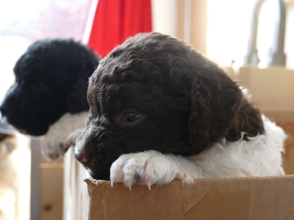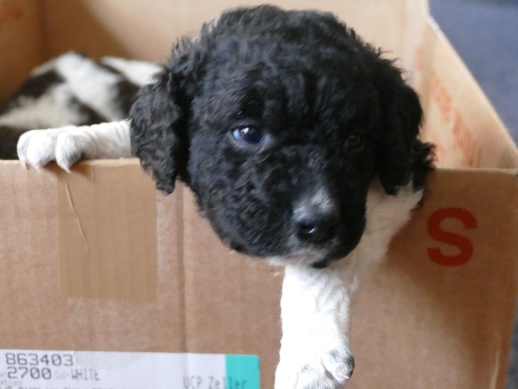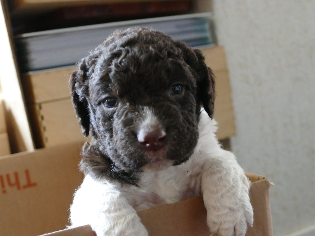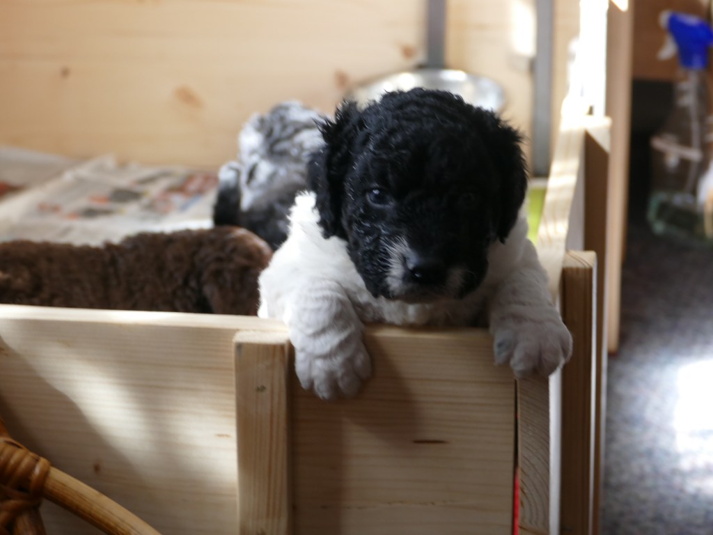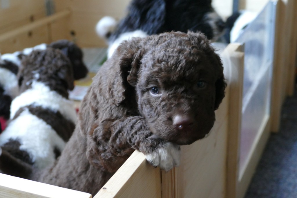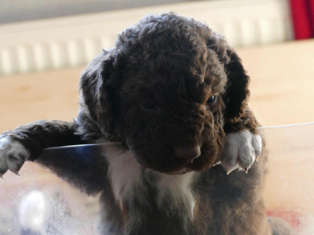 Op maandag zijn de pups al weer 4 weken oud. Het gaat hard en tijd voor de 2e wormkuur. Dat gaat nu een stuk beter dan 2 weken geleden. Nu hebben ze leren eten. Dus de pasta wordt ook naar binnen gesmikkeld. Veel minder een knoeiboel dan de vorige keer. Deze keer geen diarree maar ze liggen de hele middag te slapen. Het is heel zonnig buiten maar er staat een koude oostenwind dus toch niet naar buiten. Op dinsdag proberen we het wel. We dachten de tuin mooi afgezet te hebben zodat ze nergens naar toe kunnen maar ze hebben ontdekt dat ze tussen de spijlen van het hek door passen en dat heeft een onweerstaanbare aantrekkingskracht. Dus we blijven bezig om ze terug in de tuin te zetten. Ondertussen is daar de zon weg dus we zetten ze in een ander stuk tuin waar wel zon is. De buurkinderen krijgen er lucht van dat ze buiten zijn en komen puppy knuffelen. Als ze weg kruipen om een dutje te doen gaan ze weer naar binnen. Daar is het te koud voor. Woensdag gaan ze eerder naar buiten, net na het middag maaltje. Dat is handig want dan poepen ze in de tuin en hebben we het niet in de kist. Dat scheelt weer een hoop kranten want daar begint een chronisch tekort aan te ontstaan. De temperatuur is ook lekkerder want er is minder wind. Oh, wat worden ze al groot, ze rennen door de tuin. Buiten is zo veel afleiding dan is het ieder voor zich maar in de kist wordt er heel wat af gestoeid en er klinken af en toe harde kreten omdat ze elkaar pijn doen. Ook dat moeten ze leren “hoe hard kun je in een broertje of zusje bijten zonder dat ze geluid geven”. Na zoveel activiteit is het weer een hele tijd rustig en slapen ze en………… groeien dat ze doen. Nu, met vast voer, zijn ze duidelijk versneld aan het groeien. Tyske komt af en toe de kist in om “gemolken” te worden. We zijn het nu bij haar aan het afbouwen. Ze woog vorige week nog maar 23,9kg ondanks al het extra voer wat ze kreeg. Nu weer gewogen en ze is al weer ruim 2kg aangekomen: 26,2kg. We gaan haar weer de gewone adult brokken geven zodat de melkproductie ook af gaat nemen. Aan het einde van de week is de tuin ook niet meer spannend en interessant en stoeien en spelen ze ook met elkaar in de tuin.
