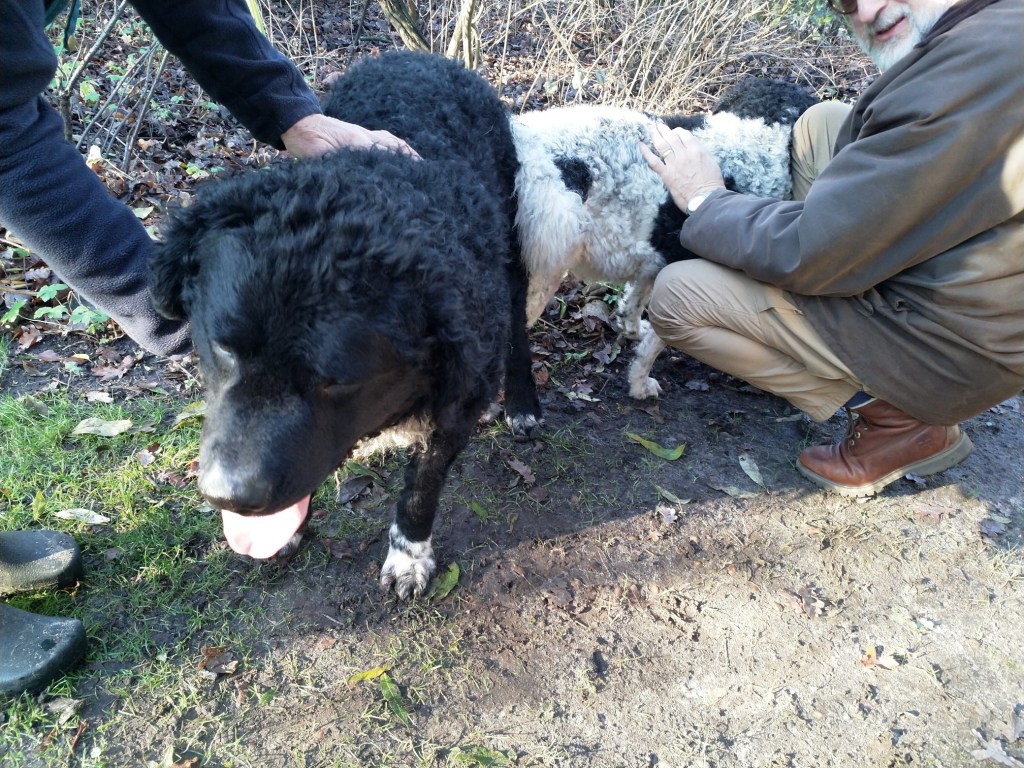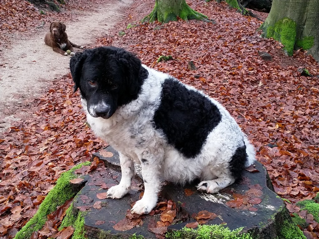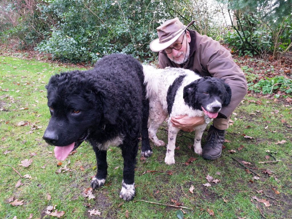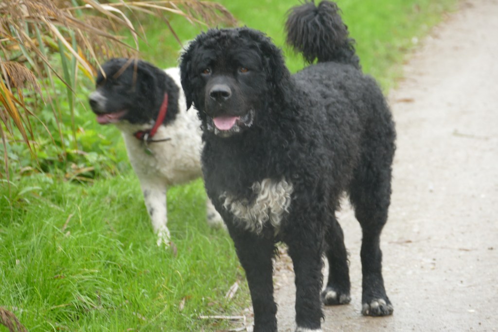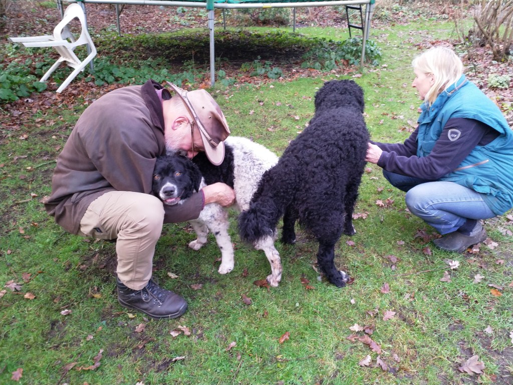 Op papier had ik hem allang uitgezocht. Hij en zijn broer waren in mijn ogen de beste match voor Tyske. Tyske is met een schofthoogte van 53cm een klein teefje. Daarom wilde ik een niet zo kleine reu want naar mijn mening moet een Wetterhoun toch wel een beetje formaat hebben. Verder wilde ik een effen reu bruin of zwart maar dan wel bruin verervend en ook bont verervend. Dan zou ik kans hebben om alle kleuren in het nest te krijgen. Het allerbelangrijkste is dat de reu SCID-vrij is want Tyske is drager van het gen. Verder moet de inteeltcoëfficiënt zo laag mogelijk zijn. Dat zijn veel wensen en dat maakt de keuze beperkt. Er waren wel een paar geschikte kandidaten maar eentje had net 2 nestjes gedekt dus die was nog niet aan de beurt. Op de Fokkersdag in oktober deed Fimme mee aan de dekreuen parade en ik vond hem een mooie hond. Ik raakte met zijn bazin aan de praat en zij vond het ook een erg leuk idee. Het is niet alleen belangrijk dat het tussen de honden klikt maar ook tussen de bazen. En klikken tussen de honden doet het. Op 1 november gaan we op kennismakingsbezoek bij Fimme. Fimme daagt Tyske al gauw uit tot een spelletje en Tyske gaat daar graag op in. Vervolgens maken de twee honden samen de tuin onveilig en gaan wij maar naar binnen om koffie te drinken. Het is een regenachtige dag en als het even droog is gaan we ook nog een wandeling maken met z’n allen. Het is een geslaagde 1e ontmoeting geweest. Dat belooft veel goeds.