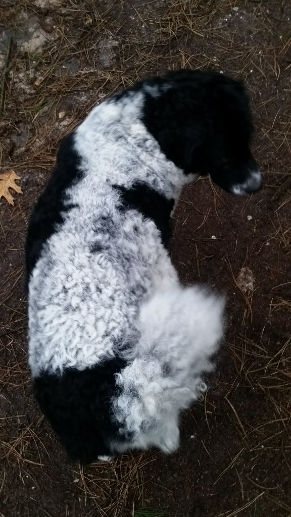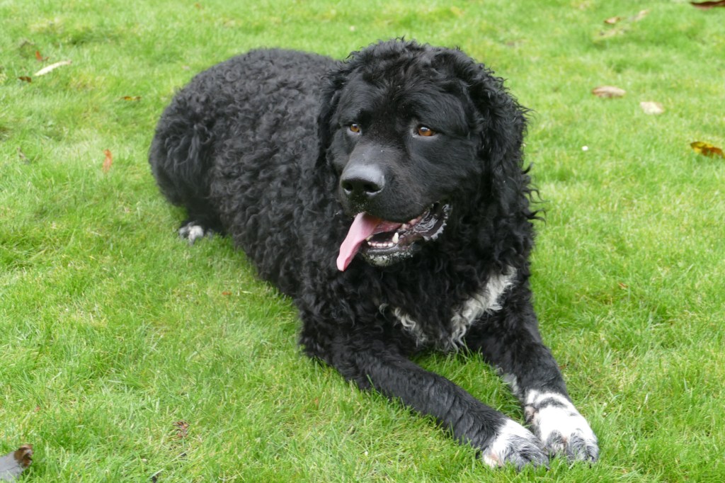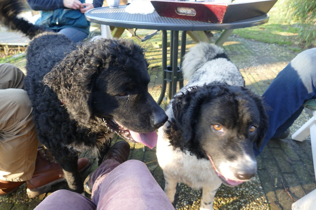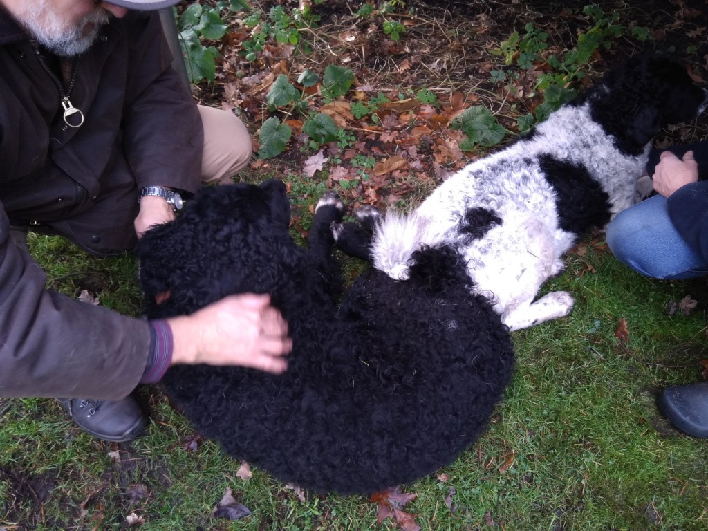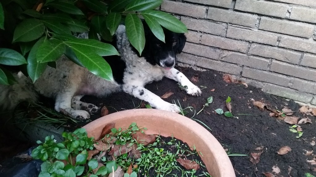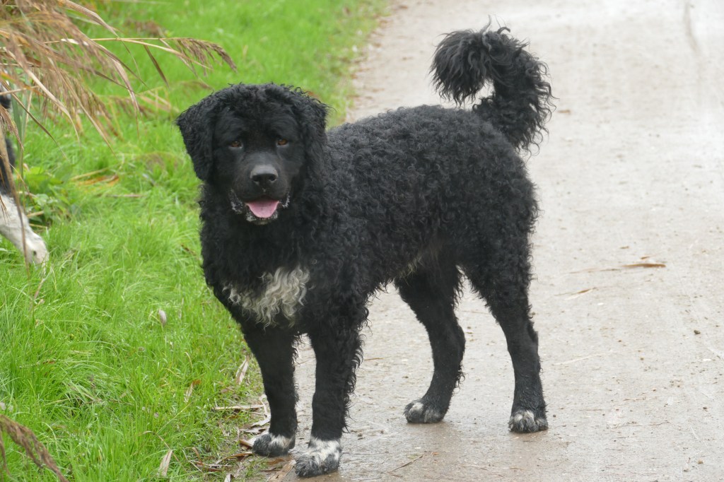 Op papier had ik hem allang uitgezocht. Hij en zijn broer waren in mijn ogen de beste match voor Tyske. Tyske is met een schofthoogte van 53cm een klein teefje. Daarom wilde ik een niet zo kleine reu want naar mijn mening moet een Wetterhoun toch wel een beetje formaat hebben. Verder wilde ik een effen reu bruin of zwart maar dan wel bruin verervend en ook bont verervend. Dan zou ik kans hebben om alle kleuren in het nest te krijgen. Het allerbelangrijkste is dat de reu SCID-vrij is want Tyske is drager van het gen. Verder moet de inteeltcoëfficiënt zo laag mogelijk zijn. Dat zijn veel wensen en dat maakt de keuze beperkt. Er waren wel een paar geschikte kandidaten maar eentje had net 2 nestjes gedekt dus die was nog niet aan de beurt. Op de Fokkersdag in oktober deed Fimme mee aan de dekreuen parade en ik vond hem een mooie hond. Ik raakte met zijn bazin aan de praat en zij vond het ook een erg leuk idee. Het is niet alleen belangrijk dat het tussen de honden klikt maar ook tussen de bazen. En klikken tussen de honden doet het. Op 1 november gaan we op kennismakingsbezoek bij Fimme. Fimme daagt Tyske al gauw uit tot een spelletje en Tyske gaat daar graag op in. Vervolgens maken de twee honden samen de tuin onveilig en gaan wij maar naar binnen om koffie te drinken. Het is een regenachtige dag en als het even droog is gaan we ook nog een wandeling maken met z’n allen. Het is een geslaagde 1e ontmoeting geweest. Dat belooft veel goeds.