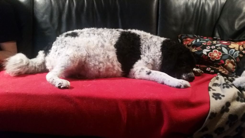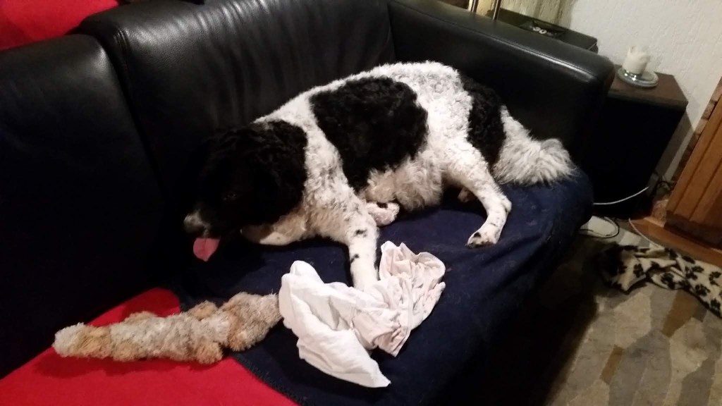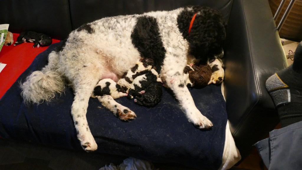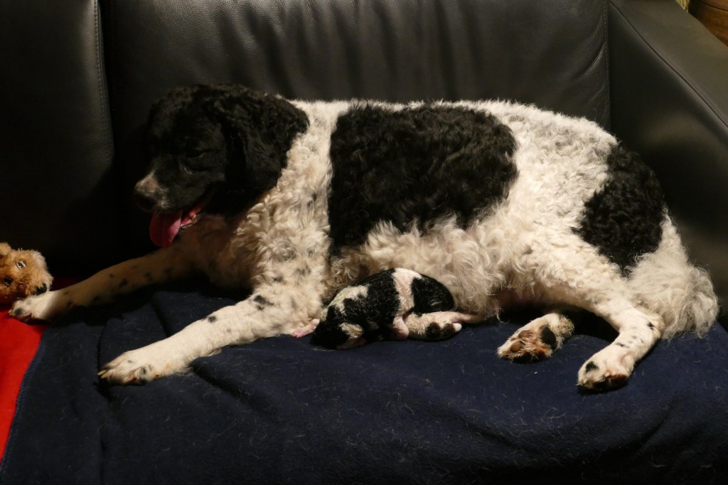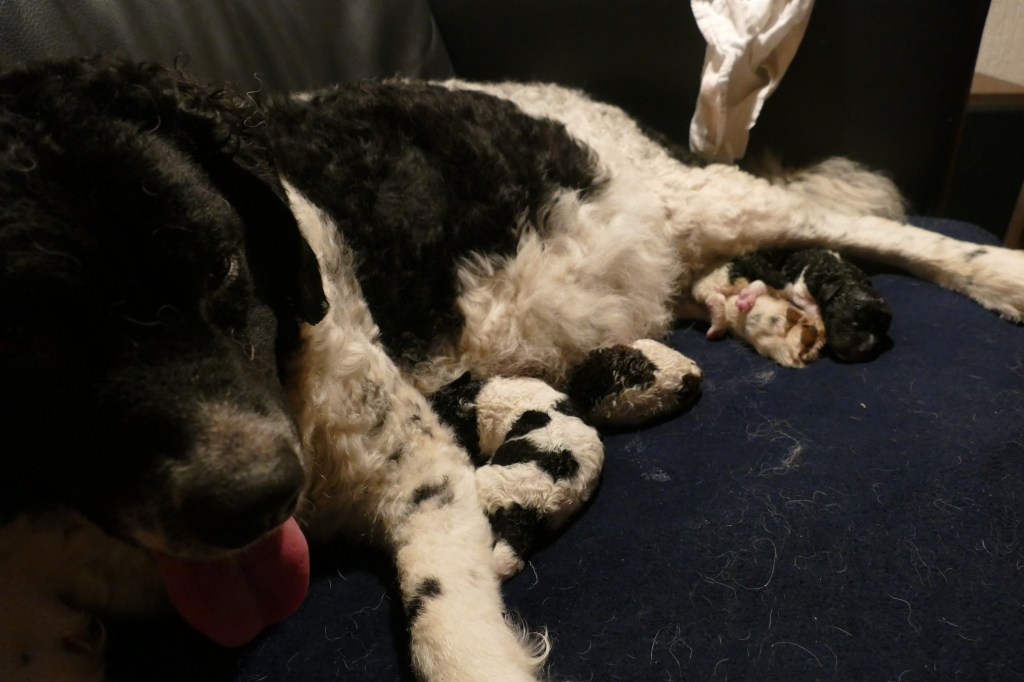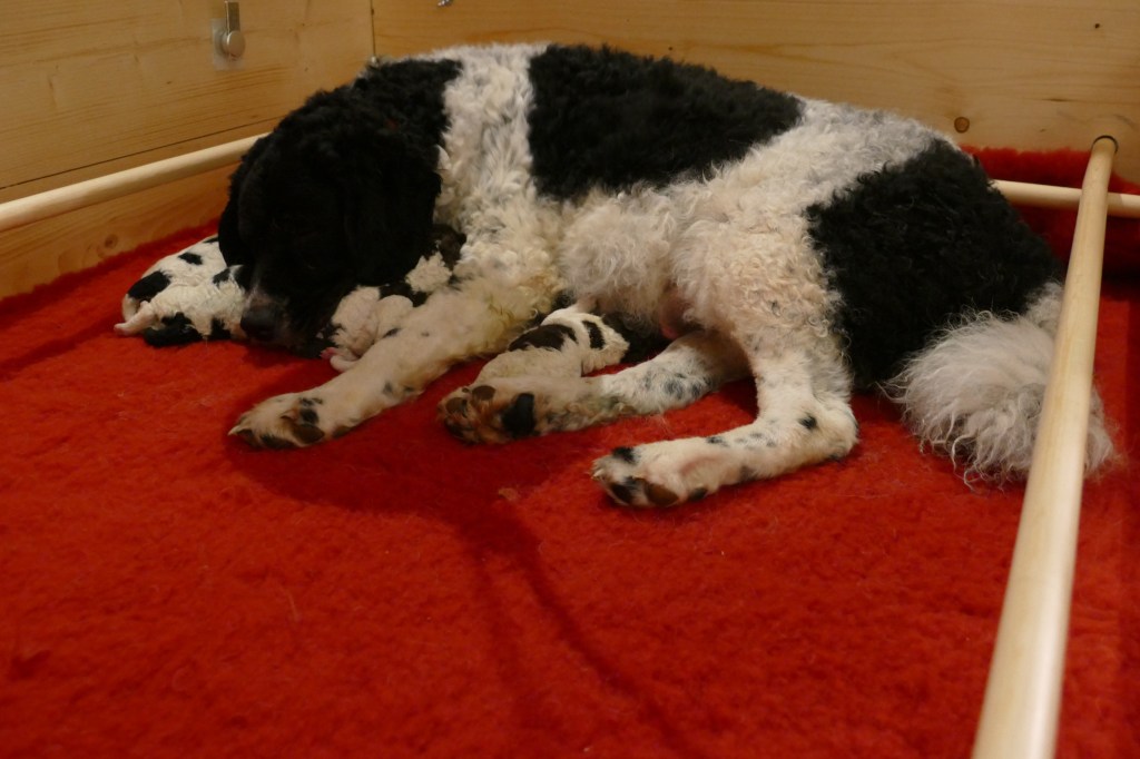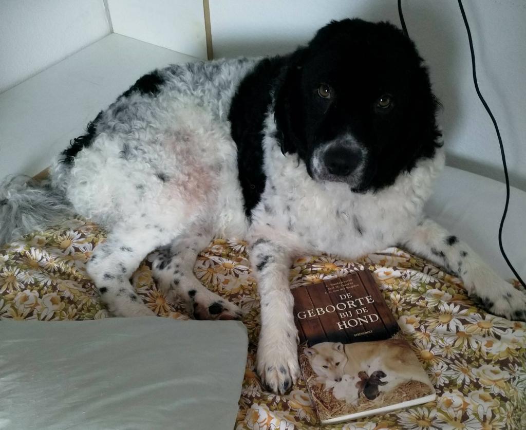 Omdat Tyske op zondagavond onrustig is met iedere keer hijgen, besluit ik om ’s nachts bij haar te blijven. Met een slaapzak lig ik op de bank. De bank is groot genoeg en Tyske past er ook bij. Ze ligt bij mijn voeten. ’s Nachts gaat ze iedere keer rechtop zitten om te hijgen. Ook ruik ik op een gegeven moment een typische metaalachtige geur. Vruchtwater? Zou er ontsluiting zijn? Al met al een onrustige nacht. Ook gaat ze ’s nachts even van de bank af om water te drinken en komt terug met het “vosje” in haar bek. Ze legt het op de bank en begint het hevig te likken. Is ze vast aan het oefenen? ’s Morgens om acht uur is er nog niets aan de hand en ik dut weer in. Een half uur later wordt ik wakker omdat Tyske iets zit te eten, op de bank. Het duurt even voordat het tot me doordringt. Het lijkt erg taai te zijn want ze moet er flink op kauwen. Als ik beter kijk zie ik het eerste pupje tussen haar voorpoten liggen en wordt net het laatste stukje placenta naar binnen gewerkt. Het pupje zit nog helemaal in de vliezen. Ik maak het snel het vlies open en laat Tyske het snuitje likken. Het bekje gaat open en er komt een geluidje uit. Hij/zij doet het! Wat een wonder, wat een opluchting. Ik laat het pupje aan Tyske over en ik ga Douwe bellen en verdere maatregelen treffen. Na een poosje bijt ze de navelstreng door en kan ik het wegen. Ik vergeet te kijken of het een reutje of een teefje is maar dat komt later wel, dat verandert niet. Ik wil de pup niet weer van Tyske afpakken. Ik leg het in de werpkist met de bedoeling dat de rest van de bevalling daar plaats zal vinden maar mevrouw denkt daar anders over. Na een hoop gedraai en gedoe, waarbij wij bang zijn dat ze er op gaat staan of liggen, neemt ze de pup in de bek en neemt het mee terug naar de bank. Ze legt het op de bank en gaat er zelf bij liggen. Blijkbaar vindt ze de bank toch een betere plek om te bevallen. Dat laten we dan maar zo. Alles voor de rust van de moeder. De geboorte van pup 2 vindt om 10:10 plaats, Douwe is net gearriveerd. Nr 3 volgt een uur later en nr 4 een half uur daarna. Alle geboorten zijn heel duidelijk en Tyske reageert daar ook gelijk op. Nr 2 zit in het vlies maar 3 en 4 worden met de kop eerst geboren en het vlies is al open. De geboorte van pup nr 5 gaat zo ongemerkt dat we te laat ontdekken dat het al geboren is. Tyske heeft er ook niet op gereageerd. Het heeft te lang in het vlies gezeten en gaat niet meer uit zich zelf ademen, het zwarte reutje sterft helaas. Een samenloop van omstandigheden, een zwarte pup, een donkere bank, Tyske die helemaal in de hoek ligt en er niet op gereageerd heeft en een dikke pluimstaart die er ook voor ligt. Bij de volgende 4 letten we nog beter op. Zo worden alle pups op de bank geboren en om kwart over drie komt de laatste. Tyske heeft alle placenta’s opgegeten en alle navelstrengen zelf doorgebeten. Als ze rustig ligt breng ik de 8 pups naar de werpkist en zij gaat erbij liggen. Ze drinkt water waar ik wat druivensuiker in heb gegaan voor de energie en later eet ze ook haar vlees, een dubbel portie. Ze ligt ontspannen in de kist. Er zijn geboren, 1 bruinbont teefje en 8 reutjes, 2x bruinbont, 3x zwartbont, 1x bruin en 2x zwart. Omdat ik het allemaal nog wel spannend vind blijf ik de volgende nacht ook nog op de bank slapen. Voor mij is het de eerste keer en voor Tyske ook. Bij iedere kik sta je naast de kist, bang dat ze een pupje plet. Ik dut af en toe in maar realiseer me op een gegeven moment dat ze heel erg aan het likken is. Ik zie een kletsnatte zwartbonte pup waar ze heel druk mee bezig is. Het is duidelijk dat het niet meer leeft. Welke van de drie zwartbonte pups vraag ik me af? Ik begin te tellen maar tel gewoon 8 droge pups in de kist. Er is een 10e geboren, een reutje en het is kwart voor twee ’s nachts, ruim 10 uur later. Die heeft geen schijn van kans gehad. Ik weeg hem en hij heeft een perfect gewicht van 414gr. Ik haal hem maar weg, bang dat Tyske hem nog opeet, zo druk als ze er mee bezig is om hem tot leven te krijgen maar dat gaat toch echt niet lukken. De volgende 2 dagen is ze hem nog steeds aan het zoeken. Opeens ligt er een wit met zwart knuffeltje in de kist, die heeft ze er zelf in gelegd. Beschouwt ze dat als het verloren pupje? We zullen het nooit weten. Ook niet of Wetters kunnen tellen.