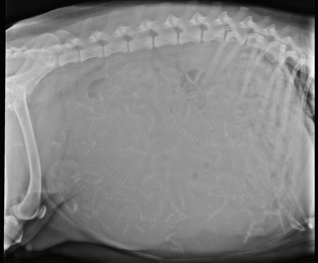 Ze is op het laatst tonnetjes-rond en kan ook niet meer mee naar het bos. Ze wil het ook niet meer. Op 19 februari maakt Douwe nog een röntgenfoto om te kijken hoeveel pups er werkelijk in zitten. Het is een drukke boel daar binnen en moeilijk te tellen. Alle assistentes komen mee helpen tellen en we komen uit op 9 pups. Alles wordt thuis in gereedheid gebracht en dan is het wachten op de eerste signalen dat de bevalling aanstaande is. We temperaturen haar gedurende een week al meerdere keren per dag. Haar temperatuur is redelijk laag voor een hond, tussen 37,7°C en 38,2°C. De temperatuurdaling die er op duidt de bevalling er aan komt missen we.