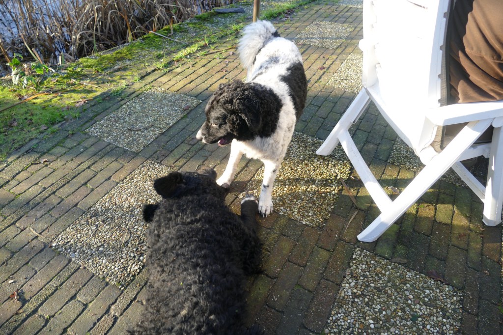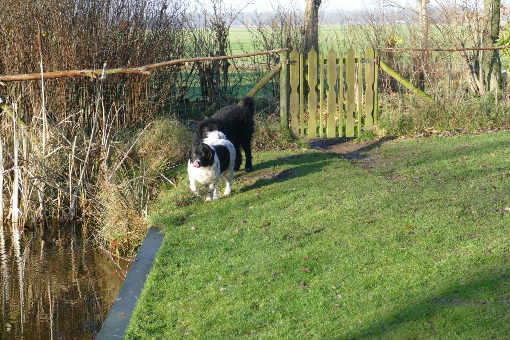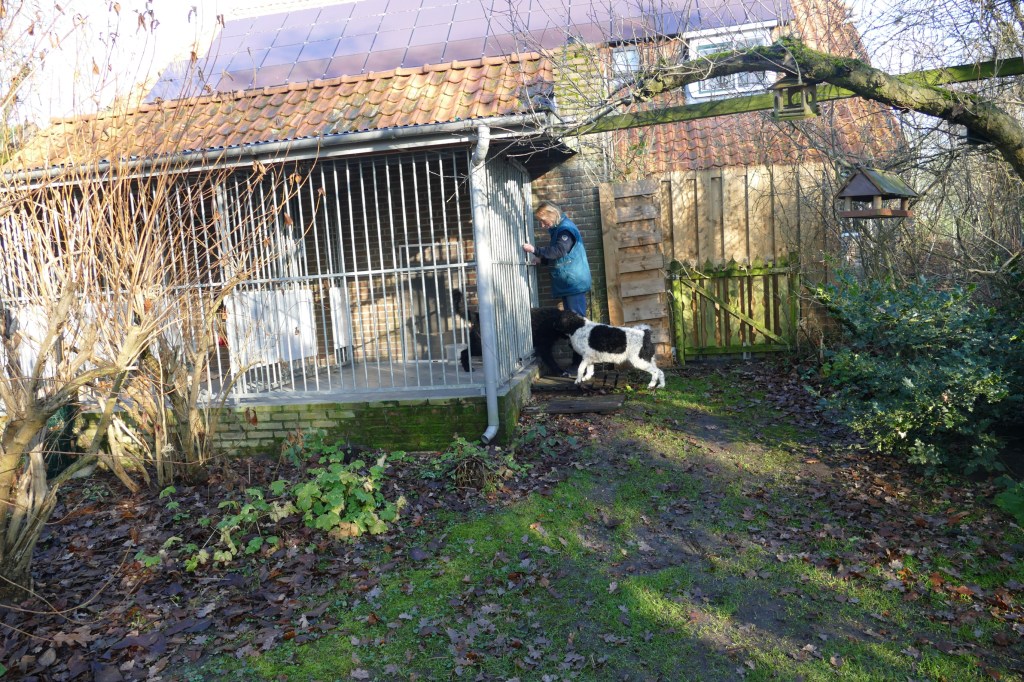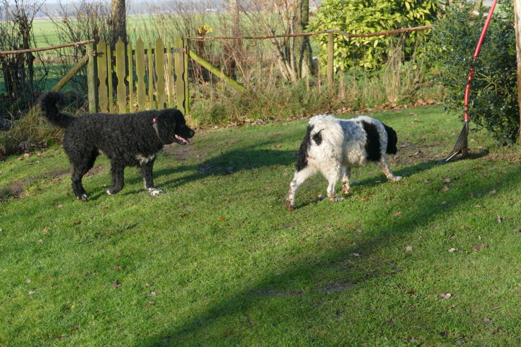 Tyske wordt op 14 december loops en dan wordt het rekenen. Ayke is daar een aardige maatstaf in, wanneer Tyske dekrijp is. Bij de vorige loopsheden heb ik dat precies bijgehouden en dat is op dag 13. We zouden dan uitkomen op 2e Kerstdag. De bazen van Fimme zijn op vakantie en Fimme is gelogeerd in Drenthe bij de fokker van Ayke. Als Tyske 9 dagen loops is gaat ze er bijna van door met een hond uit de buurt en ’s avonds is haar uitvloeiing ook van kleur veranderd. Ik wilde eigenlijk dinsdag voor Kerst de progesteron test laten doen om het juiste tijdstip van de dekking te bepalen. Ik had de afspraak al gemaakt bij de Dierenkliniek in Dieren want daar bepalen ze het zelf en heb je dezelfde dag de uitslag. Ik verzet de afspraak naar maandag en dat is geen probleem. Rond het middag uur wordt de uitslag doorgebeld, die is 4,16. Dat is nog niet hoog genoeg maar al wel aan het stijgen. Het advies zou zijn om over 2 dagen nog eens te testen maar dan is het 1e Kerstdag. Ik zeg tegen de dierenarts dat ik ook naar de reu kan gaan en kijken wat er gebeurt. Zo wordt het afgesproken met de fokker waar Fimme gelogeerd is onder het motto, beter te vroeg dan te laat. Dus 1e Kerstdag met Tyske naar Drenthe. Fimme zit nog in de kennel en Tyske mag eerst een plasje doen in de tuin. Daar haalt hij heel veel informatie uit, zegt de fokker. Dan laat ze Fimme erbij. Fimme snuffelt aan Tyske en in de tuin maar Tyske wil spelen. Het voorspel begint en duurt zo’n 9 min. Dan staan ze gekoppeld en dat duurt bijna een half uur. Tijdens de koppeling is het belangrijk dat het teefje stil blijft staan anders bezeerd ze de reu. Daar zijn wij voor, dat het stel op de plaats blijft. Als ze weer los zijn brengen ze zichzelf in fatsoen en daarna zijn ze onafscheidelijk en gaan ze samen de tuin verkennen. Wij drinken samen met de fokker en haar man koffie met taart, buiten op het terras bij de vijver en het is 1e Kerstdag, héél bijzonder. De dekking is gegaan zoals ik dat voor ogen had, natuurlijk en zonder dwang. Als Tyske nog niet gedekt had willen worden dan zouden we het na 1 of 2 dagen nog een keer proberen. Als ze er nog helemaal niet aan toe was geweest dan zouden we gewacht hebben tot de volgende loopsheid. Ik heb aan alle scenario’s gedacht. Als we weer thuis zijn wordt ze helemaal afgesnuffeld door Ayke maar hij is nog steeds niet in haar geïnteresseerd. Dat is ’s avonds wel anders, dan begint hij heel erg avances te maken en wordt hij gruwelijk afgesnauwd door Tyske. Anders zijn ze dikke maatjes maar nu moet hij op afstand blijven. Dat is erg frustrerend voor Ayke. Ze moeten fysiek gescheiden blijven en Ayke reageert zijn frustraties op ons af. Normaal gesproken gaat hij uit logeren bij onze zoon Douwe in Friesland maar die is nu over voor Kerstmis. Het is behelpen maar het is maar een dag of 4-5. We hebben besloten, in overleg met de fokker om vrijdag de 27e nog een keer terug te komen omdat we misschien iets te vroeg waren. Vrijdag wordt er nog een keer gedekt en het gaat weer op dezelfde manier. Als ze gekoppeld staan wil Tyske gaan liggen maar Fimme staat nog en hij begint te piepen. Ik hijs Tyske weer op haar poten en dan is het weer goed. Hij probeert wel los te komen maar dat lukt pas na 20min. Daarna is Tyske er klaar mee. Als Fimme dan nog toenadering zoekt wordt hij afgewezen. Spelen is oké maar verder niet. Toch kunnen ze maar moeilijk afscheid nemen, ik krijgt Tyske bijna niet mee. Wij hebben het gevoel dat het wel goed gegaan is maar je moet nog een maand wachten voordat je een echo kan laten maken, dan heb je pas zekerheid.