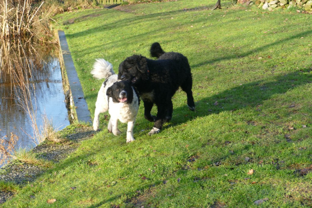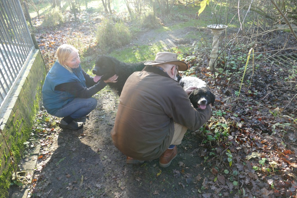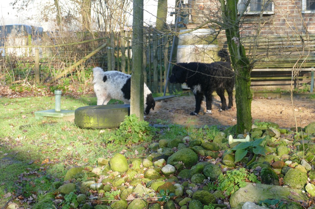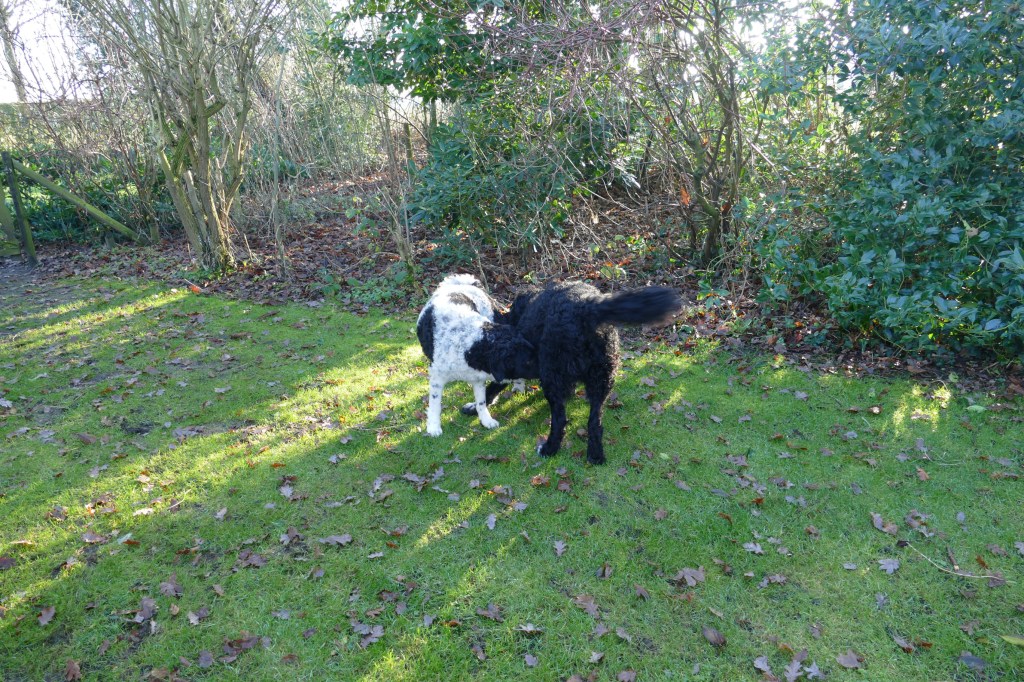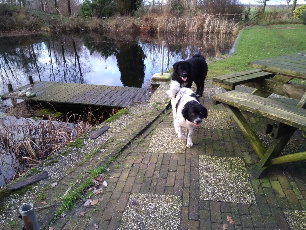 Tyske wordt op 14 december loops en dan wordt het rekenen. Ayke is daar een aardige maatstaf in, wanneer Tyske dekrijp is. Bij de vorige loopsheden heb ik dat precies bijgehouden en dat is op dag 13. We zouden dan uitkomen op 2e Kerstdag. De bazen van Fimme zijn op vakantie en Fimme is gelogeerd in Drenthe bij de fokker van Ayke. Als Tyske 9 dagen loops is gaat ze er bijna van door met een hond uit de buurt en ’s avonds is haar uitvloeiing ook van kleur veranderd. Ik wilde eigenlijk dinsdag voor Kerst de progesteron test laten doen om het juiste tijdstip van de dekking te bepalen. Ik had de afspraak al gemaakt bij de Dierenkliniek in Dieren want daar bepalen ze het zelf en heb je dezelfde dag de uitslag. Ik verzet de afspraak naar maandag en dat is geen probleem. Rond het middag uur wordt de uitslag doorgebeld, die is 4,16. Dat is nog niet hoog genoeg maar al wel aan het stijgen. Het advies zou zijn om over 2 dagen nog eens te testen maar dan is het 1e Kerstdag. Ik zeg tegen de dierenarts dat ik ook naar de reu kan gaan en kijken wat er gebeurt. Zo wordt het afgesproken met de fokker waar Fimme gelogeerd is onder het motto, beter te vroeg dan te laat. Dus 1e Kerstdag met Tyske naar Drenthe. Fimme zit nog in de kennel en Tyske mag eerst een plasje doen in de tuin. Daar haalt hij heel veel informatie uit, zegt de fokker. Dan laat ze Fimme erbij. Fimme snuffelt aan Tyske en in de tuin maar Tyske wil spelen. Het voorspel begint en duurt zo’n 9 min. Dan staan ze gekoppeld en dat duurt bijna een half uur. Tijdens de koppeling is het belangrijk dat het teefje stil blijft staan anders bezeerd ze de reu. Daar zijn wij voor, dat het stel op de plaats blijft. Als ze weer los zijn brengen ze zichzelf in fatsoen en daarna zijn ze onafscheidelijk en gaan ze samen de tuin verkennen. Wij drinken samen met de fokker en haar man koffie met taart, buiten op het terras bij de vijver en het is 1e Kerstdag, héél bijzonder. De dekking is gegaan zoals ik dat voor ogen had, natuurlijk en zonder dwang. Als Tyske nog niet gedekt had willen worden dan zouden we het na 1 of 2 dagen nog een keer proberen. Als ze er nog helemaal niet aan toe was geweest dan zouden we gewacht hebben tot de volgende loopsheid. Ik heb aan alle scenario’s gedacht. Als we weer thuis zijn wordt ze helemaal afgesnuffeld door Ayke maar hij is nog steeds niet in haar geïnteresseerd. Dat is ’s avonds wel anders, dan begint hij heel erg avances te maken en wordt hij gruwelijk afgesnauwd door Tyske. Anders zijn ze dikke maatjes maar nu moet hij op afstand blijven. Dat is erg frustrerend voor Ayke. Ze moeten fysiek gescheiden blijven en Ayke reageert zijn frustraties op ons af. Normaal gesproken gaat hij uit logeren bij onze zoon Douwe in Friesland maar die is nu over voor Kerstmis. Het is behelpen maar het is maar een dag of 4-5. We hebben besloten, in overleg met de fokker om vrijdag de 27e nog een keer terug te komen omdat we misschien iets te vroeg waren. Vrijdag wordt er nog een keer gedekt en het gaat weer op dezelfde manier. Als ze gekoppeld staan wil Tyske gaan liggen maar Fimme staat nog en hij begint te piepen. Ik hijs Tyske weer op haar poten en dan is het weer goed. Hij probeert wel los te komen maar dat lukt pas na 20min. Daarna is Tyske er klaar mee. Als Fimme dan nog toenadering zoekt wordt hij afgewezen. Spelen is oké maar verder niet. Toch kunnen ze maar moeilijk afscheid nemen, ik krijgt Tyske bijna niet mee. Wij hebben het gevoel dat het wel goed gegaan is maar je moet nog een maand wachten voordat je een echo kan laten maken, dan heb je pas zekerheid.