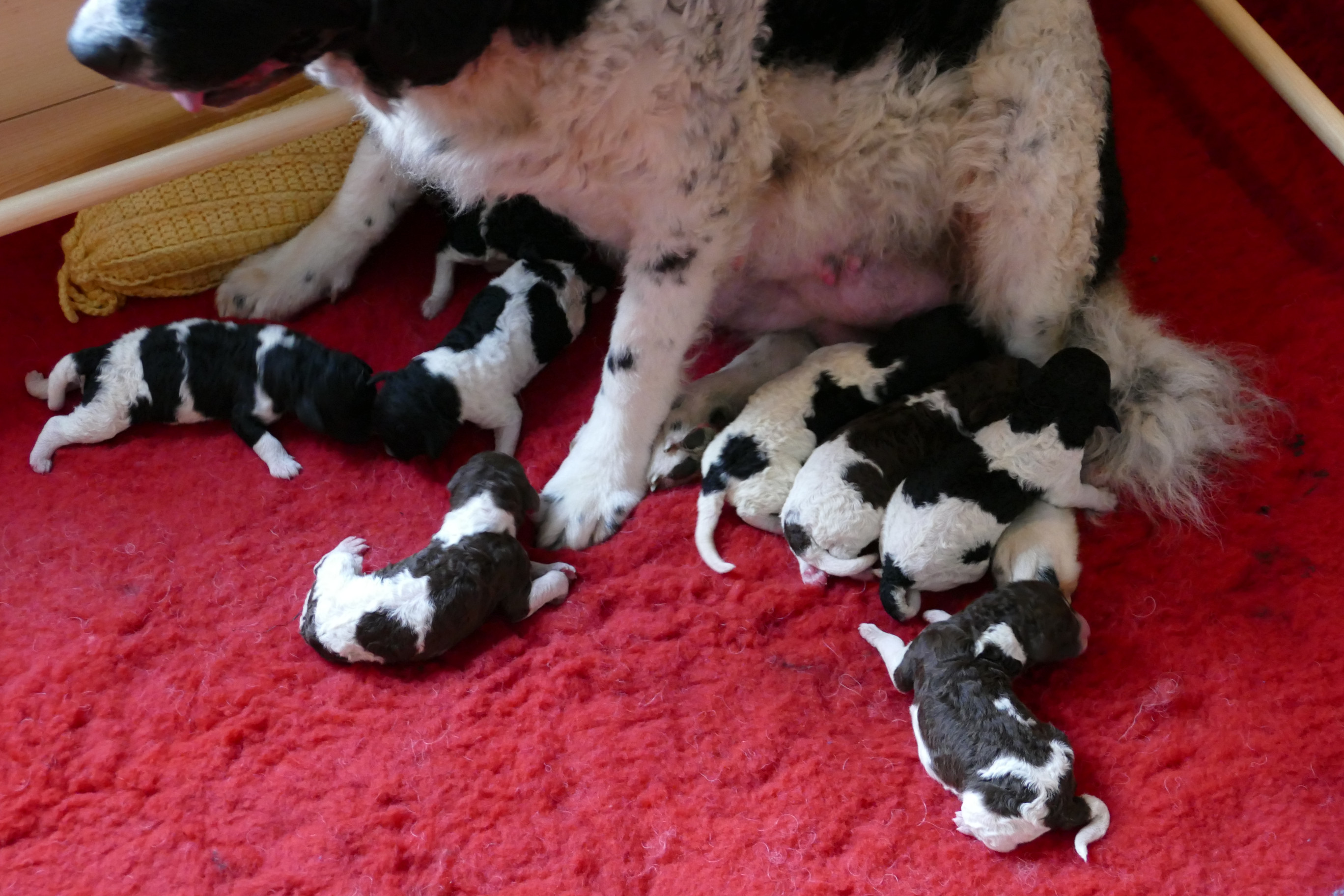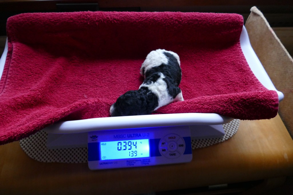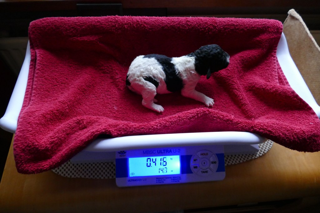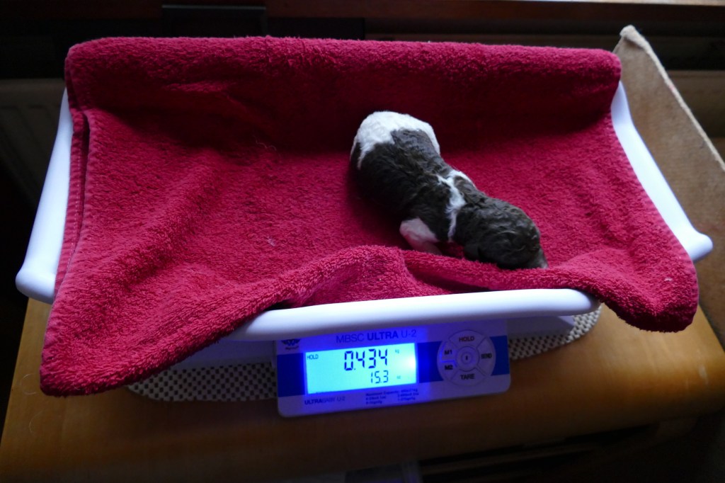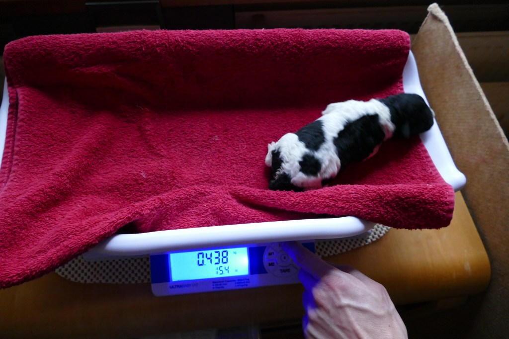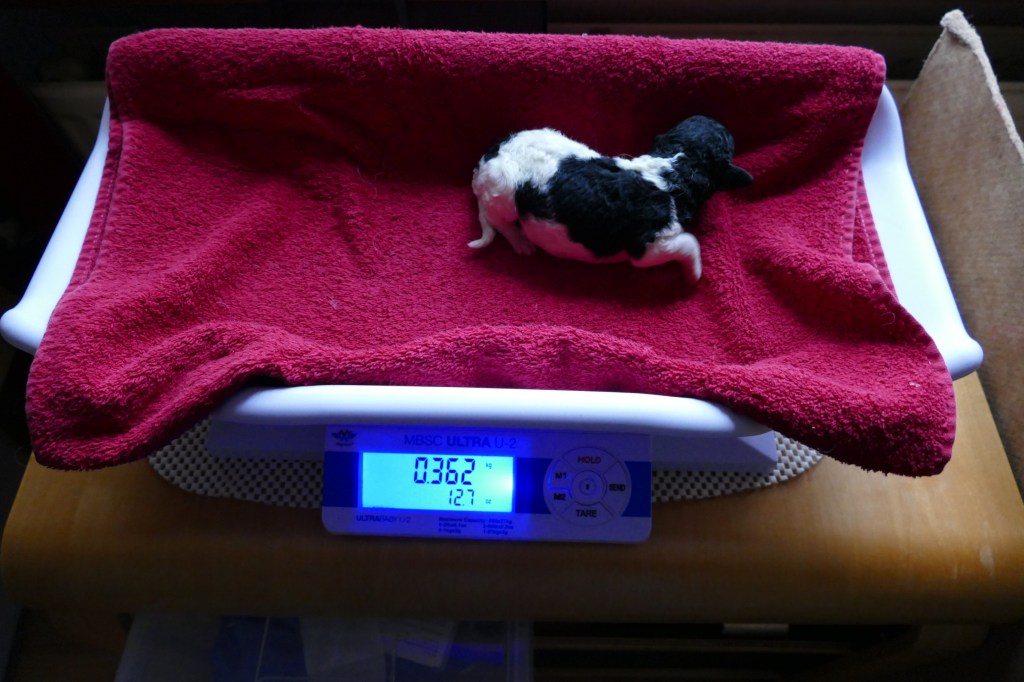 De 1e dag na hun geboorte zijn de pups, op 1 teefje na, allemaal toegenomen in hun gewicht. Dat betekent dat de melk bij Tyske goed opgang is gekomen en dat ze van goede kwaliteit is. Het is voornamelijk slapen-drinken-slapen en groeien.