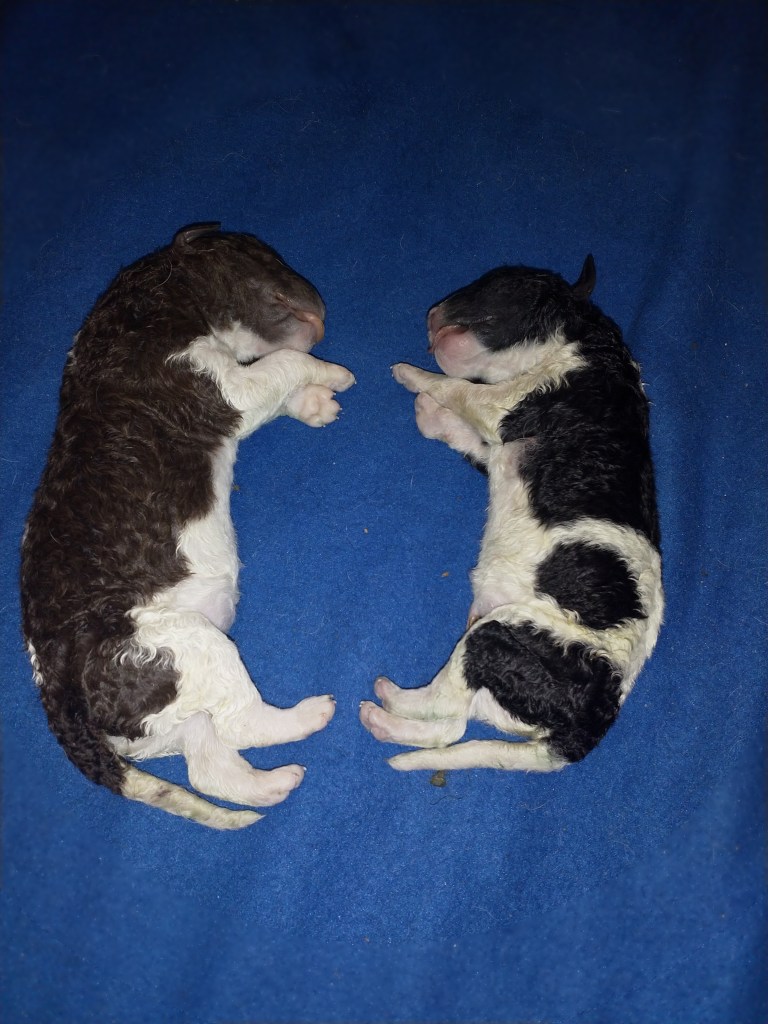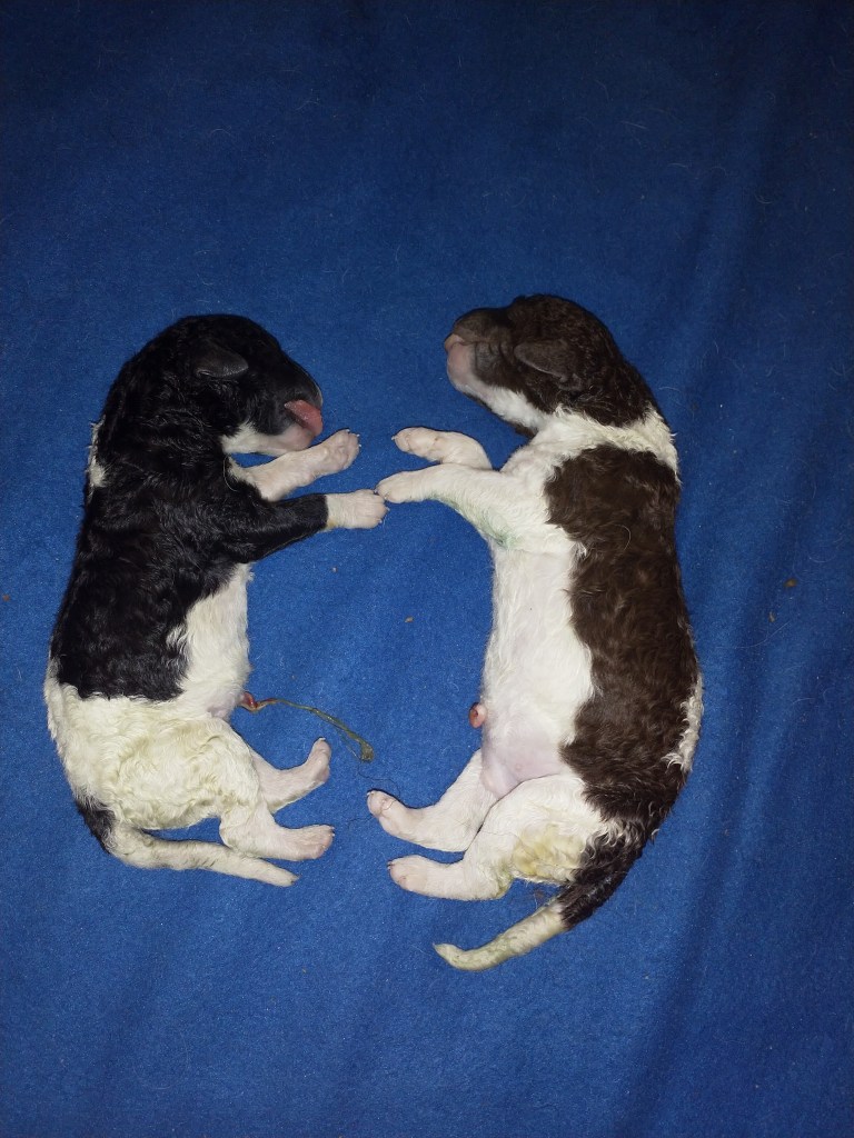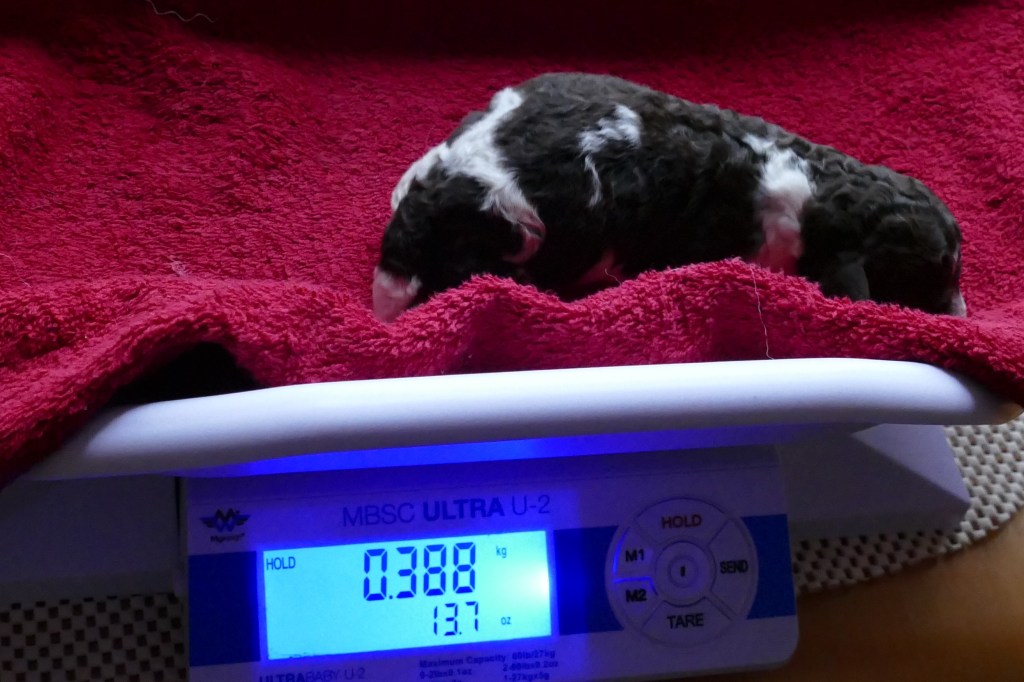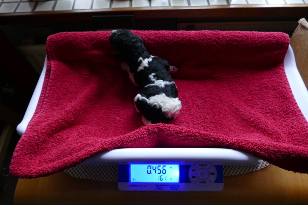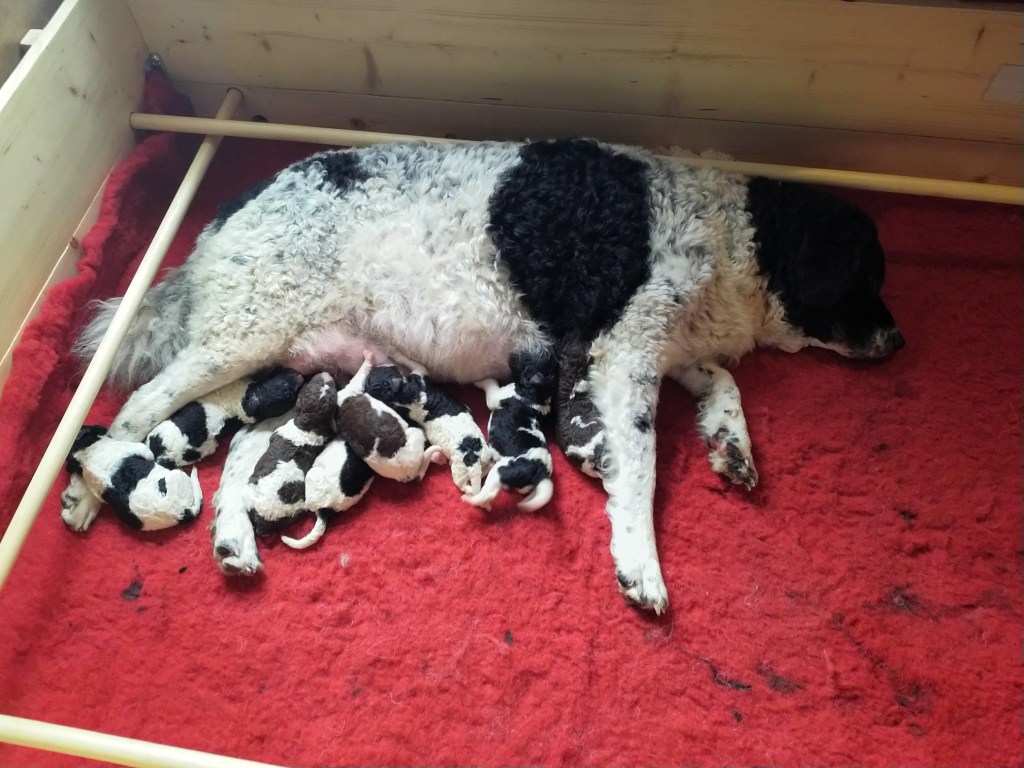 De 1e dag na hun geboorte zijn de pups, op 1 teefje na, allemaal toegenomen in hun gewicht. Dat betekent dat de melk bij Tyske goed opgang is gekomen en dat ze van goede kwaliteit is. Het is voornamelijk slapen-drinken-slapen en groeien.