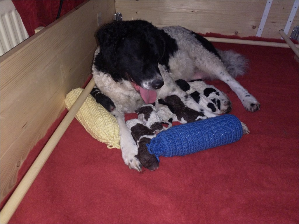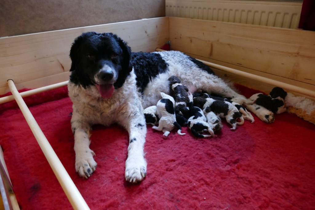 Tyske is een hele goede moeder. Ondanks dat ze het in de werpkist veel te warm heeft door de warmtelamp die er boven hangt, komt ze er alleen maar uit om te plassen, poepen en te eten. Als een leeuwin bewaakt zij de pups. Als ik de pups uit de kist haal om te wegen, houdt ze me argwanend in de gaten.