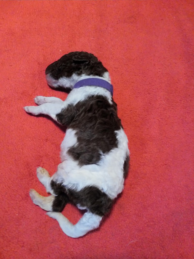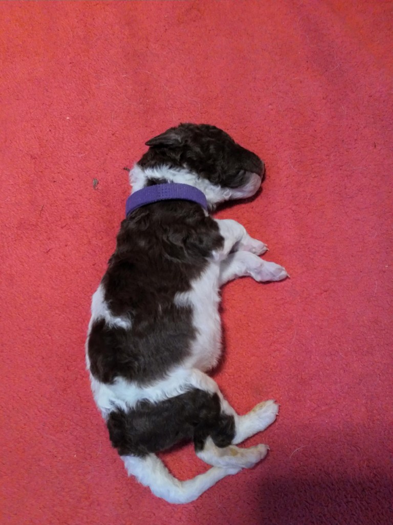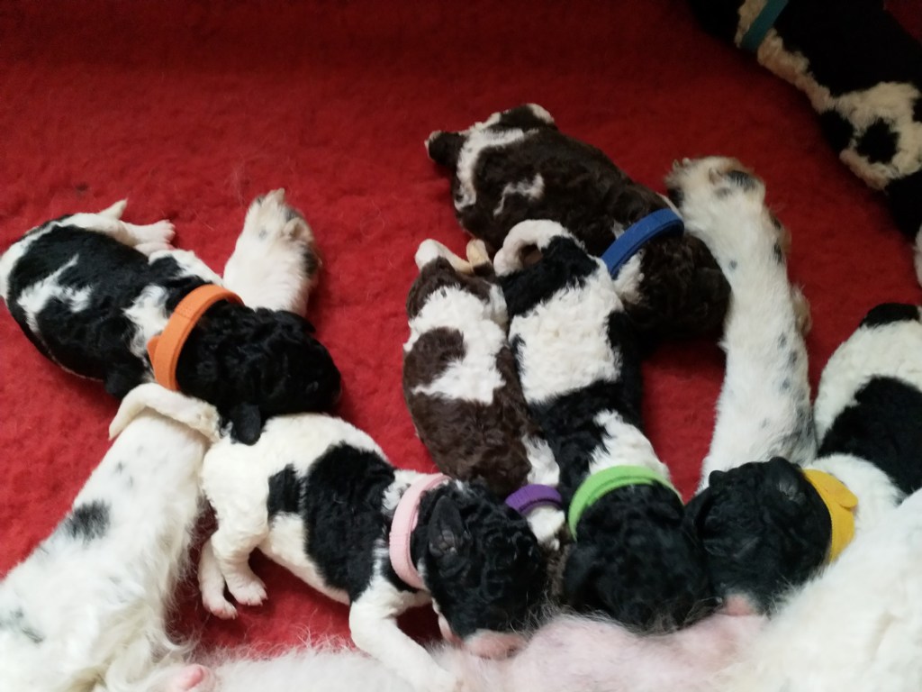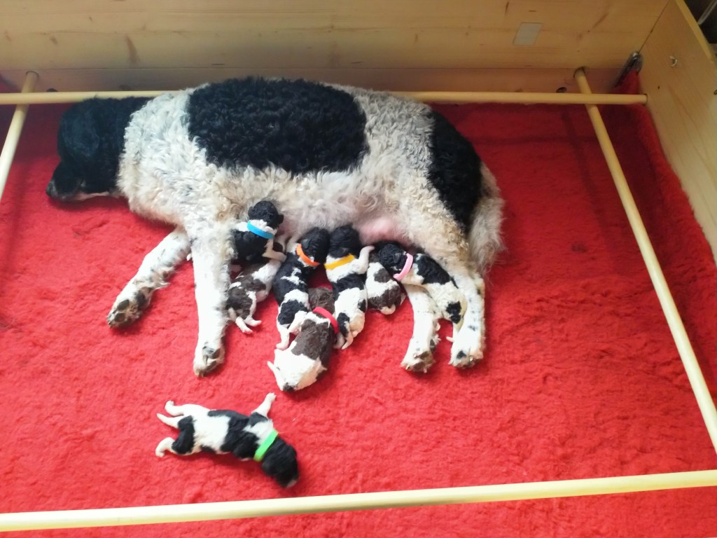 Er komt meer rust en we kunnen ’s nachts weer doorslapen. Alle aandacht voor de 7 overgebleven pups die het gelukkig allemaal heel goed doen. Ondertussen hebben ze allemaal gekleurde bandjes om. Dan kunnen we ze beter uit elkaar houden.