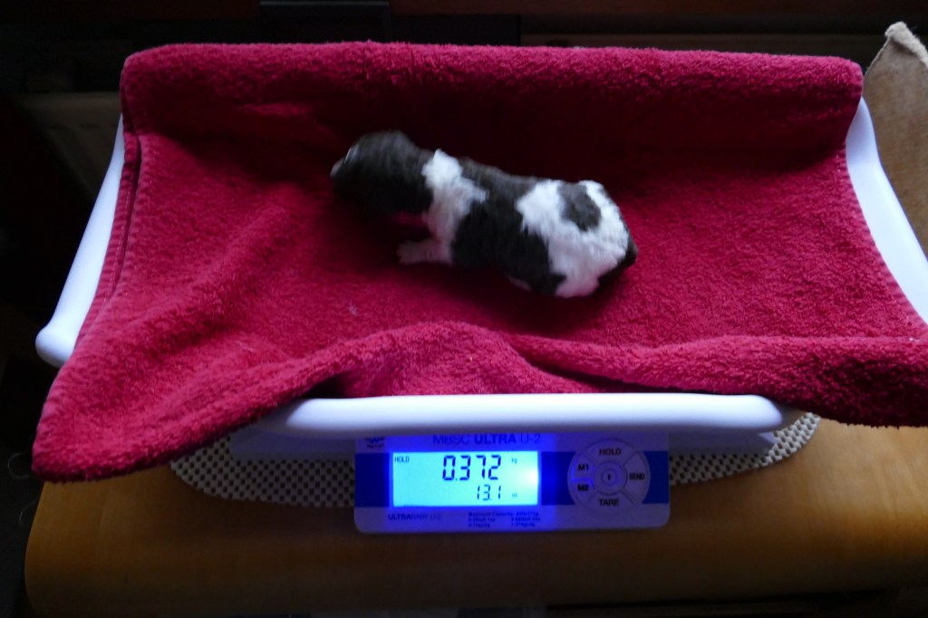 Nog een zorgen pupje: Het laatste reutje zit aanvankelijk de volgende dag na zijn geboorte 8gr boven zijn geboortegewicht. Na 2 dagen is hij sterk afgevallen en zit onder zijn geboortegewicht. Als ik hem ’s avonds nog een keer weeg is hij nog verder afgevallen. Ik probeer een flesje maar dat lukt niet, dan maar met de sonde. Ook weer om de 3 uur en ook ’s nachts 2 keer. Het is alleen niet zo succesvol als bij het teefje. Er gaat maar weinig puppymelk in, dan is hij overvol, loopt hij over of heeft hij diarree. Eerst denken we dat hij ook bij Tyske drinkt maar het gaat niet beter met hem. Hij groeit maar 10gr per dag en na het voeden schreeuwt hij. Ik maak me zorgen en ben bang dat er een onderliggend probleem is. Op maandag, 5 dagen na de geboorte kijkt Douwe hem nog eens goed na en ontdekt wat er aan de hand is. Hij kan niet poepen. Zijn anus is onderontwikkeld en er komt wat diarree uit zijn plassertje. Hij zit verstopt, kan zijn ontlasting niet kwijt en heeft waarschijnlijk erge buikpijn. Hier valt niets aan te doen. Ik bel de dierenarts om hem te laten inslapen. Thuis begraven we hem bij zijn 2 dode broertjes.