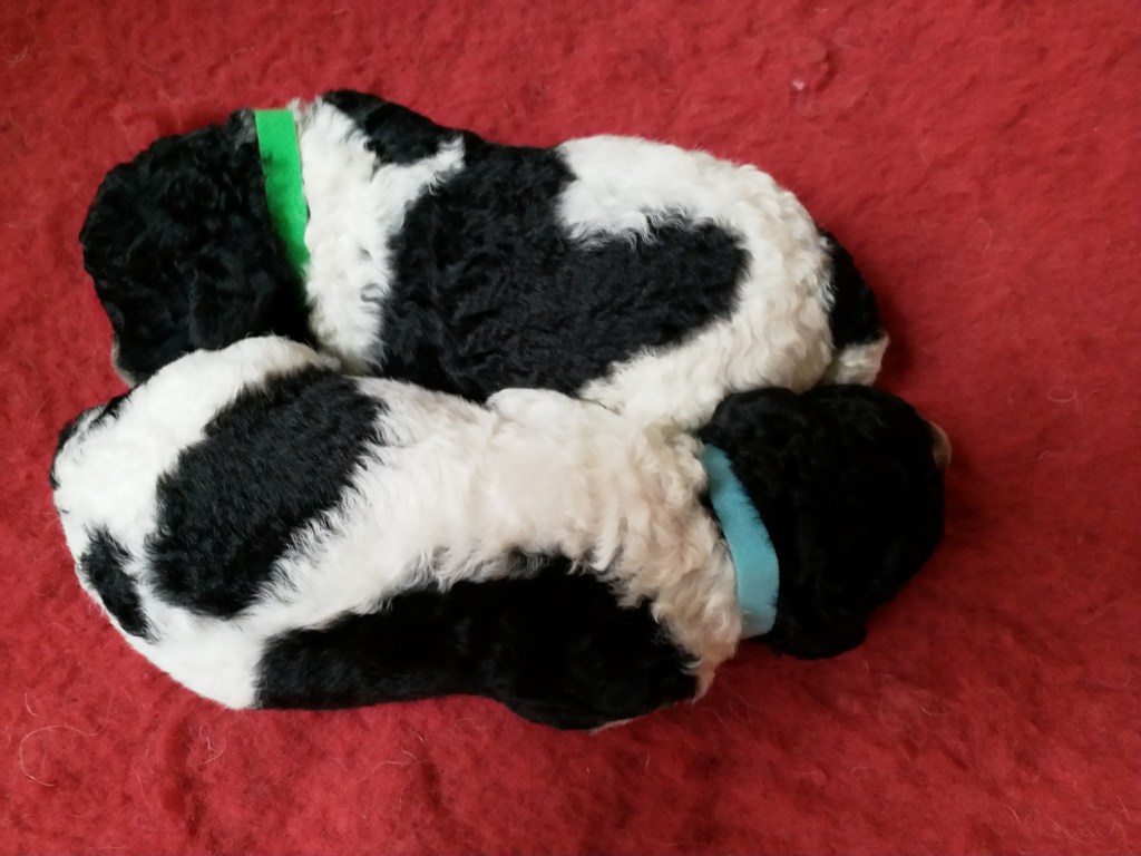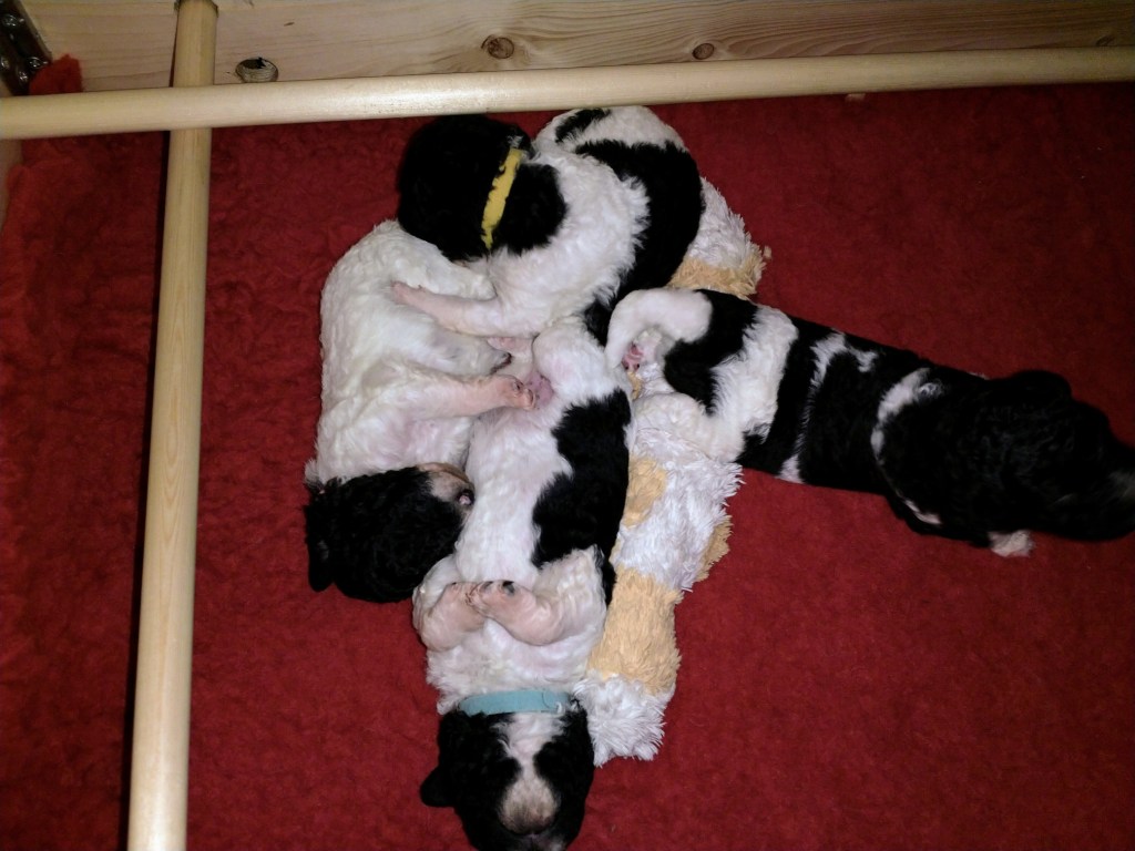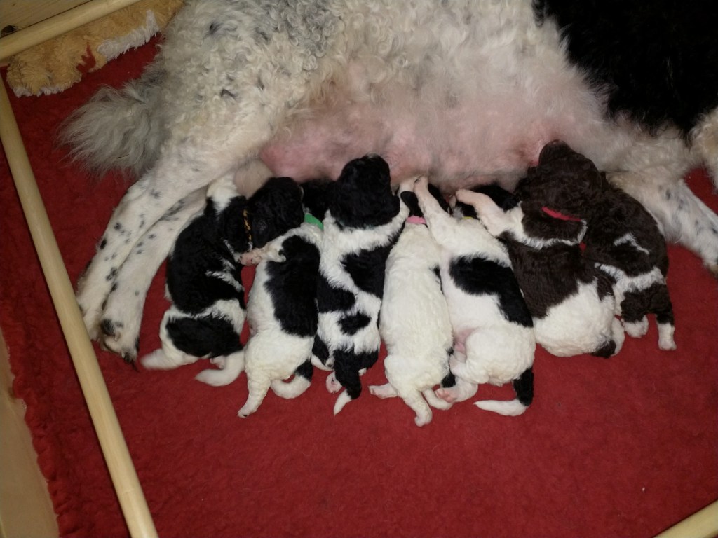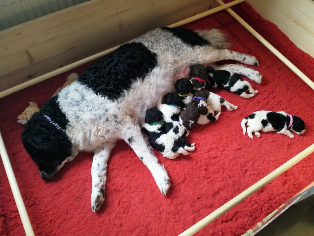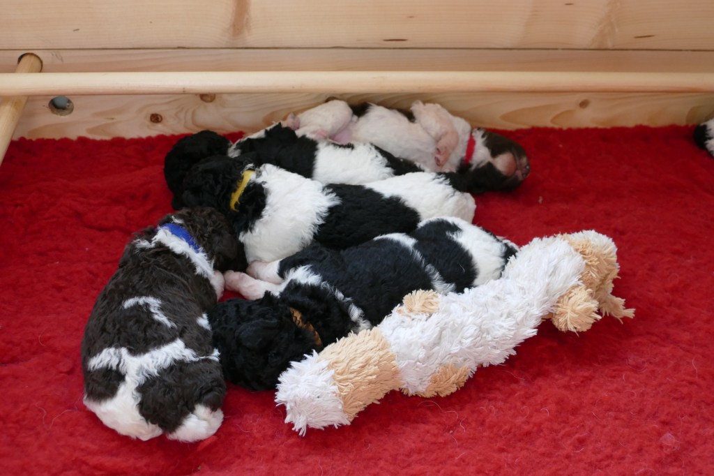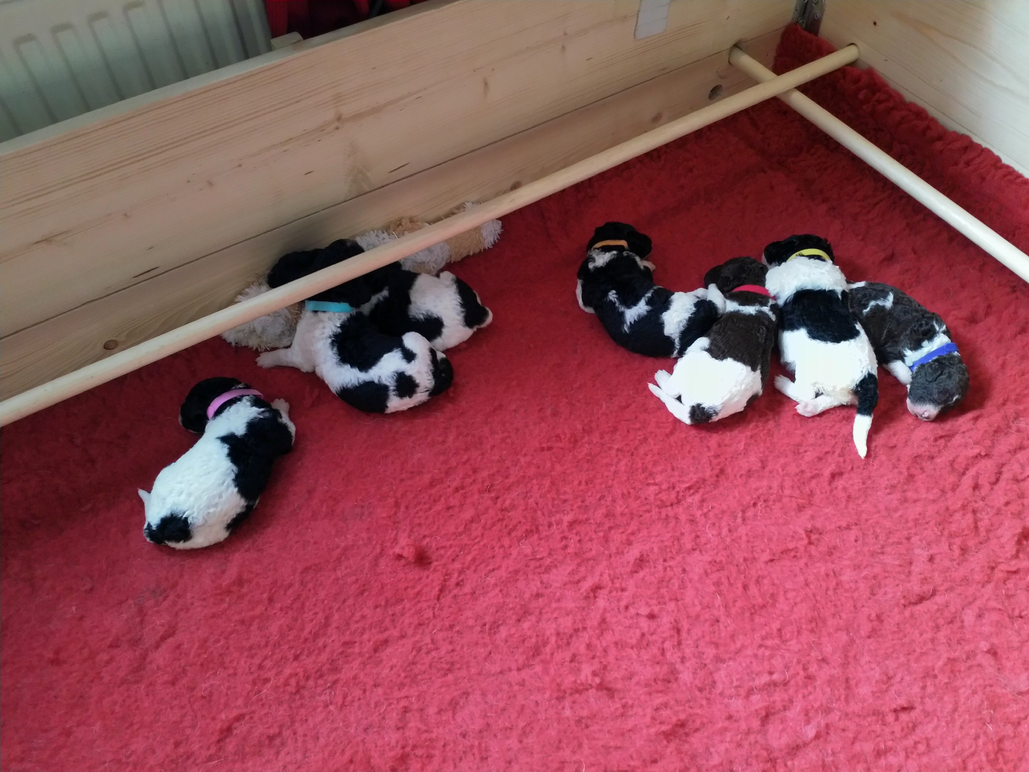 Een week van de eerste mijlpalen. Allereerst de verdubbeling van het geboorte gewicht. Tussen dag 9 en dag 11 hebben 6 van de 7 pups het geboorte gewicht verdubbeld. Alleen het teefje met de startproblemen doet er nog 4 dagen langer over. De oogjes gaan open, bij 1 reutje op dag 11 en bij de rest zijn de oogjes de volgende dag ook open. Ze gaan lopen, eerst wankele stapjes en vallen nog veel om, op dag 13 en 14. Het kleine teefje doet er nog 3 dagen langer over voordat ze sterk genoeg is om op haar pootjes te staan.