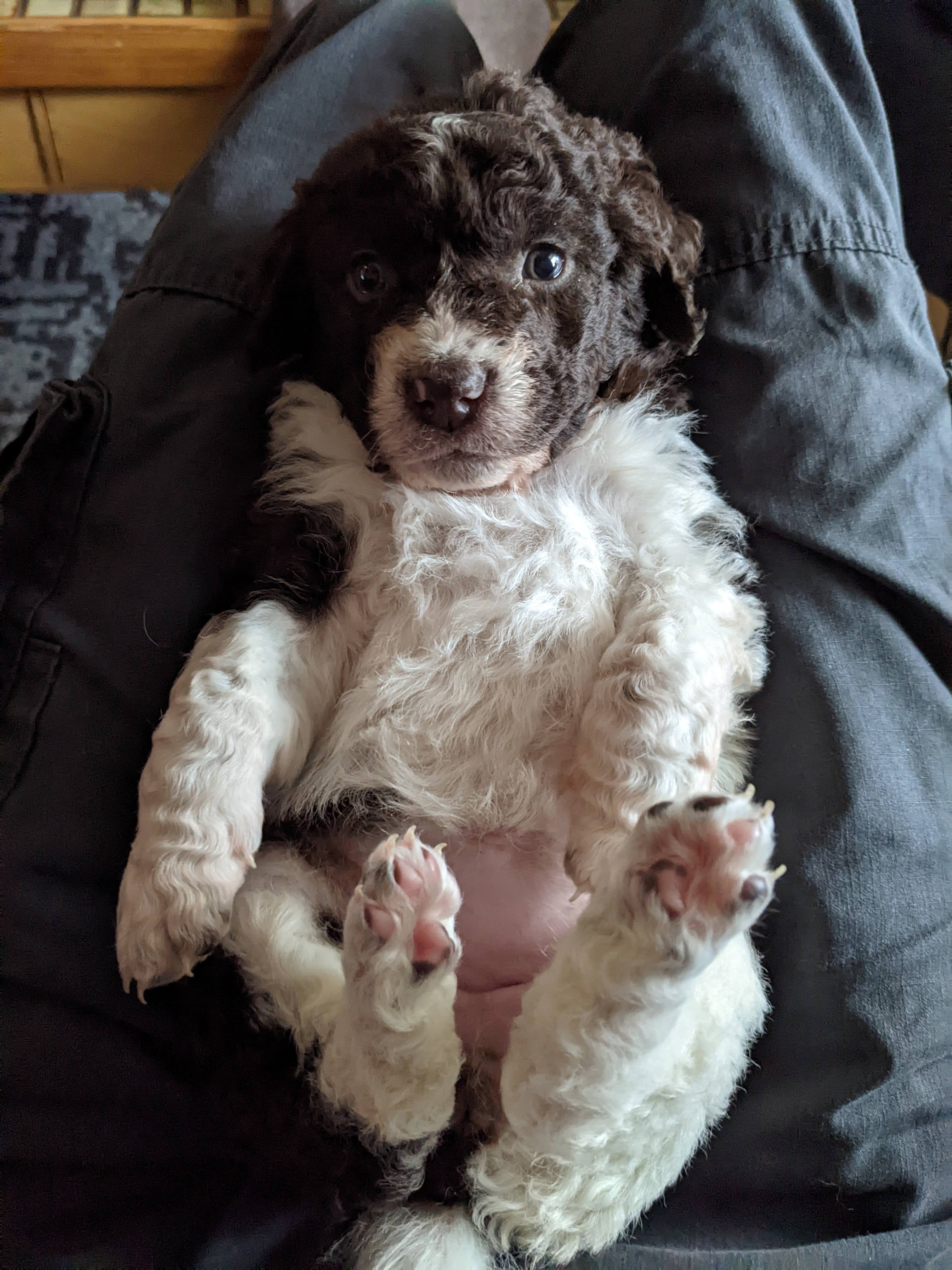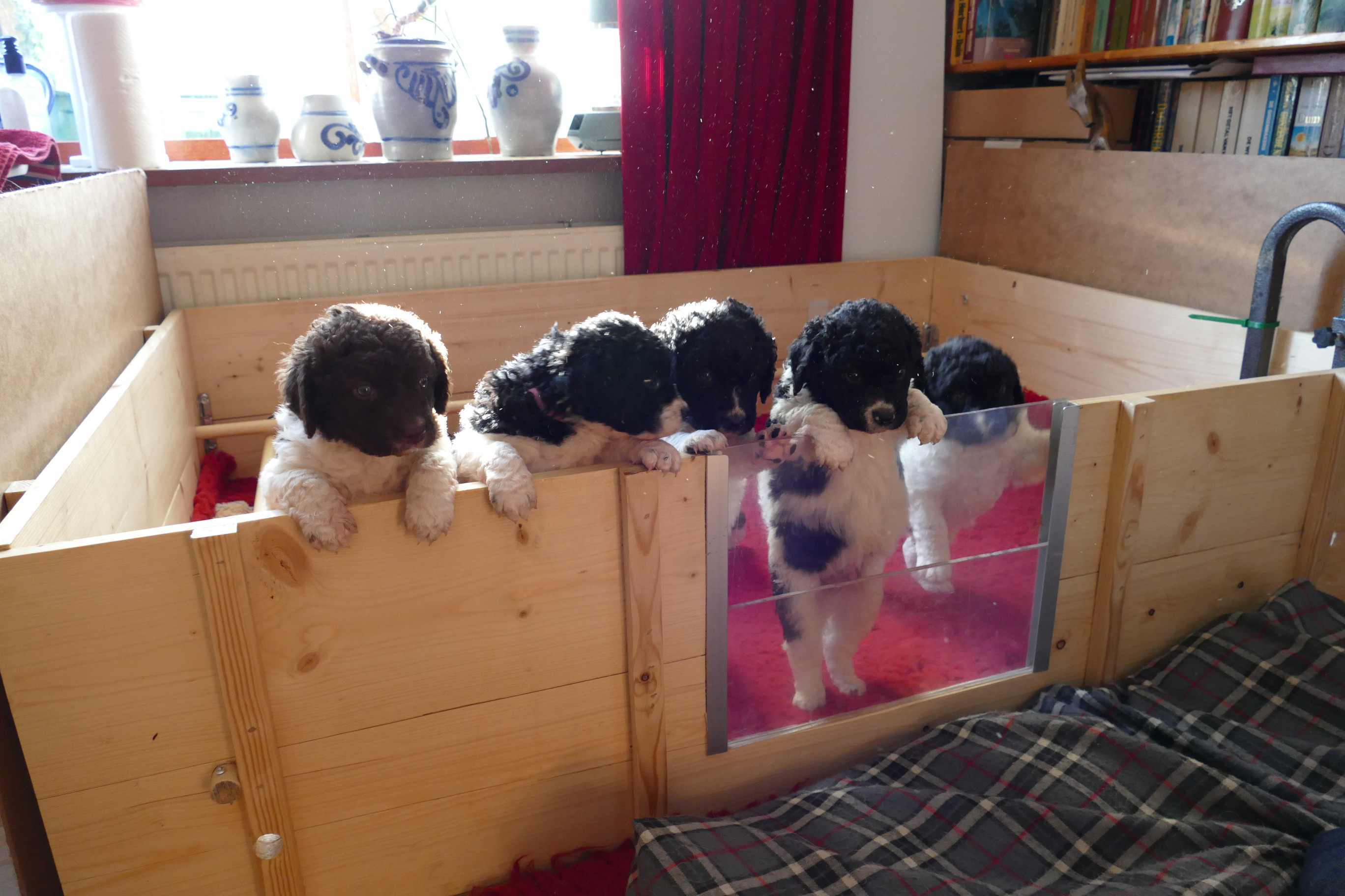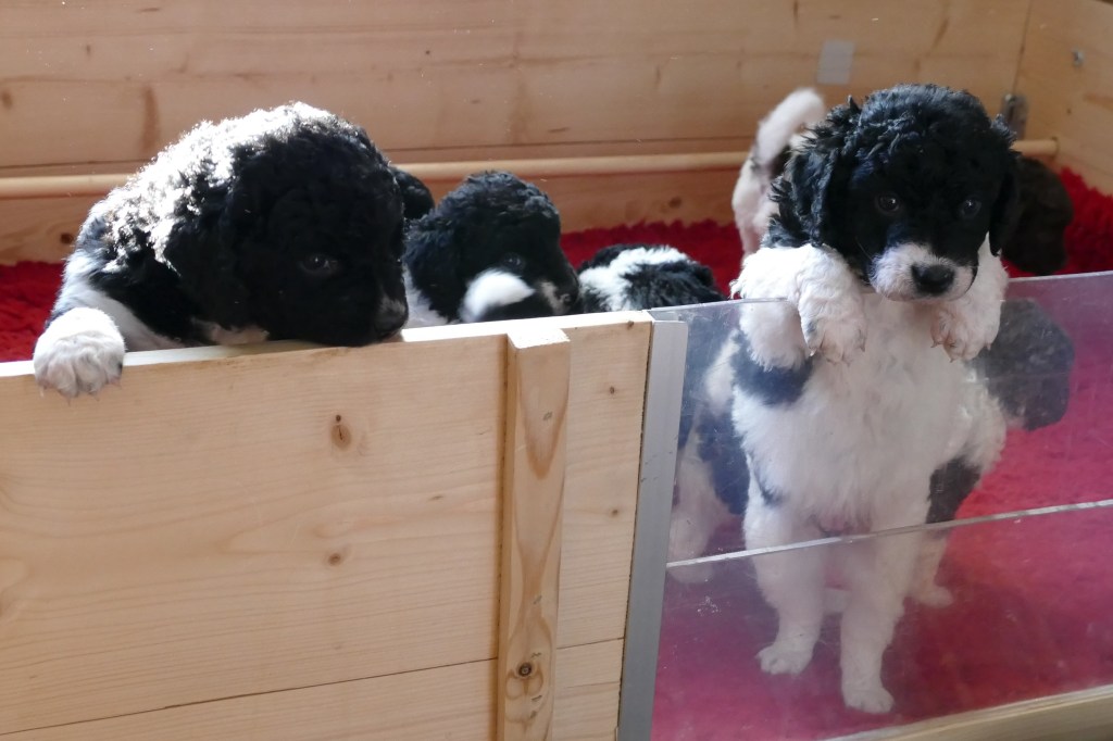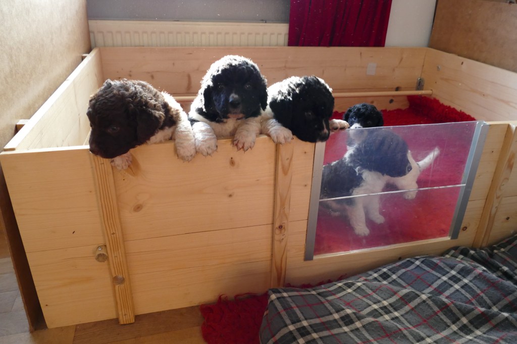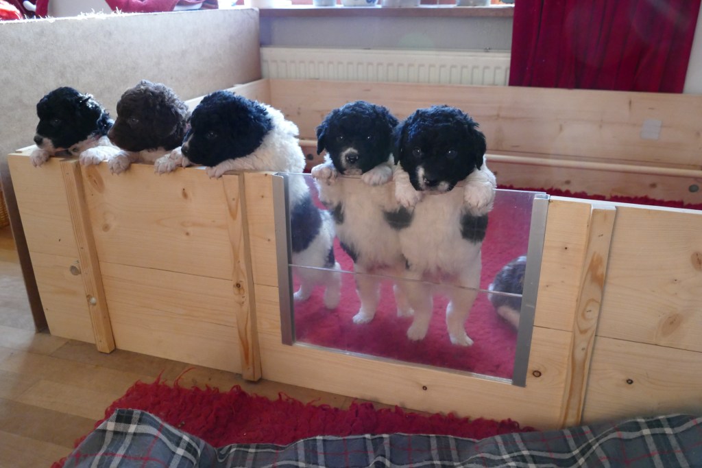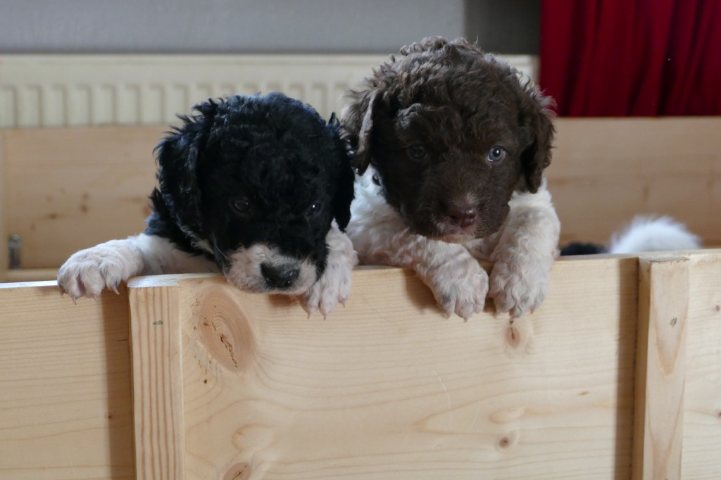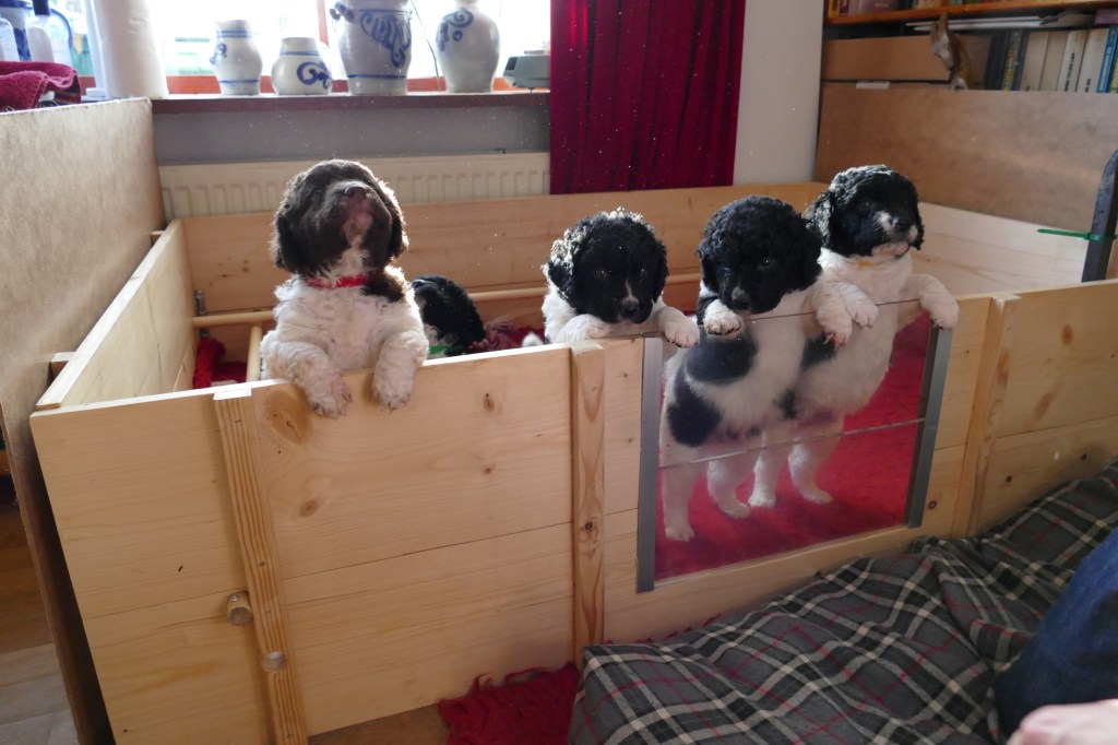 De pups zijn nu 4 weken, we zijn op de helft. Wat vliegt de tijd om en wat worden ze al groot. Ze kunnen nu al over de rand van de kist kijken als ze op hun achterpoten staan en met de voorpootjes over de rand hangen.