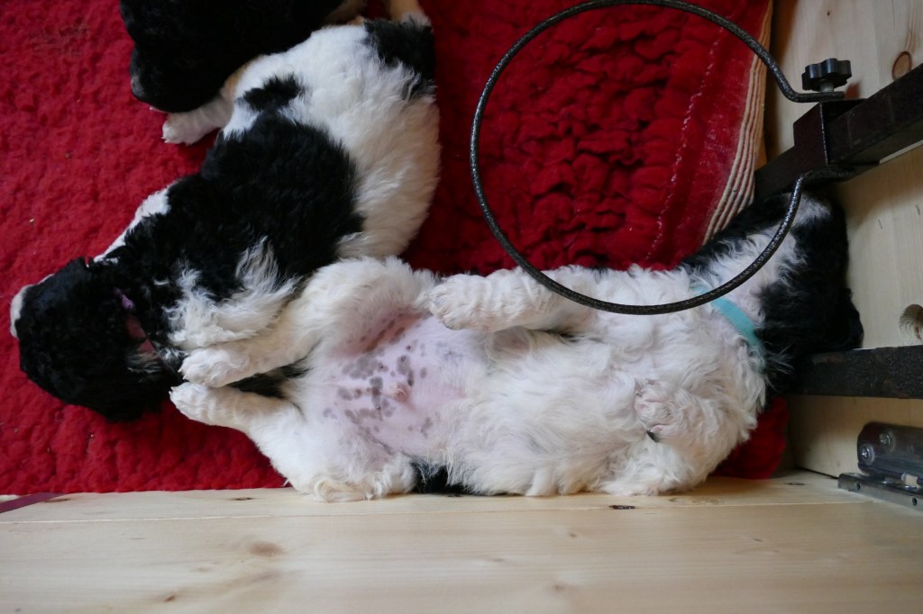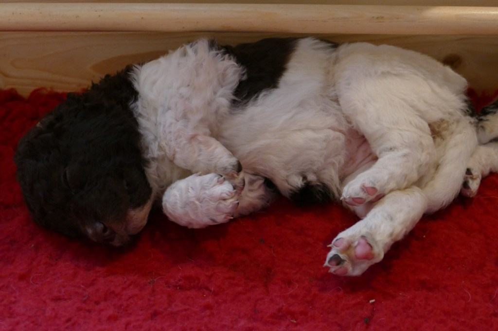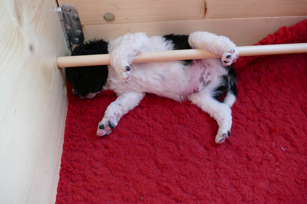 Echte hangjongeren zijn het en een kabaal dat ze kunnen maken als ze allemaal tegelijk aan het woord zijn. Als ze slapen en je begint tegen ze te praten, zijn ze in een mum van tijd in beweging. Ze spelen niet meer alleen met elkaar maar ook met het speelgoed dat in de kist ligt. Aan het eind van de week proberen ze alles uit waar ze bij kunnen, ook mijn gordijnen en zelfs de tiewrap waarmee de waterbak vast zit. Soms klinken ze alsof ze elkaar levend willen opvreten maar dat hoort er allemaal bij. Daar leren ze van. Hoe hard kun je in een broertje of zusje bijten zonder dat die geluid geeft. En die tandjes, die zijn scherp hoor, die proberen ze ook op ons uit. Nog even en ze groeien de kist uit……..en poepen dat ze kunnen!! Als je er niet snel genoeg bij bent gaan er 28 pootjes doorheen. Tyske ziet er af en toe ook geen gat meer in om het allemaal schoon te houden. Maar als ze slapen zijn het schatjes en ze slapen in allerlei standen.