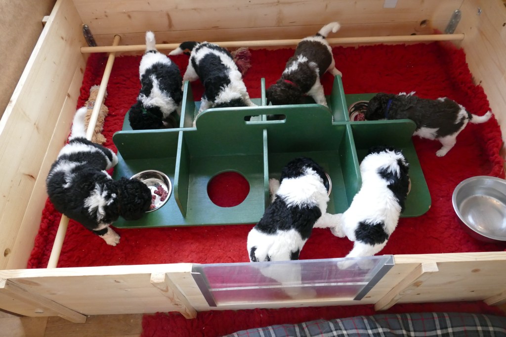 Eten: Eten gaat ook steeds beter en vlotter en ik voer langzaam de hoeveelheid op. Aan het eind van de week zitten ze op 2x 25gr brokjes en 2x 50gr vlees. Ik had een bus vol gemalen brokjes gemaakt en toen die leeg was ben ik overgegaan op hele brokjes, dat gaat ook prima. Als de startersmousse op is krijgen ze hetzelfde vlees als Ayke en Tyske. De eerste dag maak ik het wat fijner in de blender maar eigenlijk is dat niet nodig, ze eten het zo ook wel en ze vinden het héérlijk. De bakjes zijn snel leeg en dan doen ze gezamenlijk de afwas. Er blijft geen snippertje over, de bakjes kunnen zo de kast in. Tyske verbaast me iedere keer weer. Ik heb al een aantal keren gezien dat ze een mondje vol van haar eigen brokjes naar de pups brengt. De pups hebben dat snel door dat mama voer brengt want even later zit er een hele puppy scrum om die paar brokjes. Dat vind ik heel bijzonder want Tyske wil eigenlijk altijd eten en steelt zelfs Ayke zijn eten als ze de kans krijgt. Wat is ze toch een goed moedertje. Zondag had ze zelfs een deel van haar ei, voor de pups in de kist uitgebraakt. Maandagavond zelfs wat van haar vlees. Gelukkig krijgt Tyske dezelfde brokjes en vlees als de pups, dus het maakt niet uit.