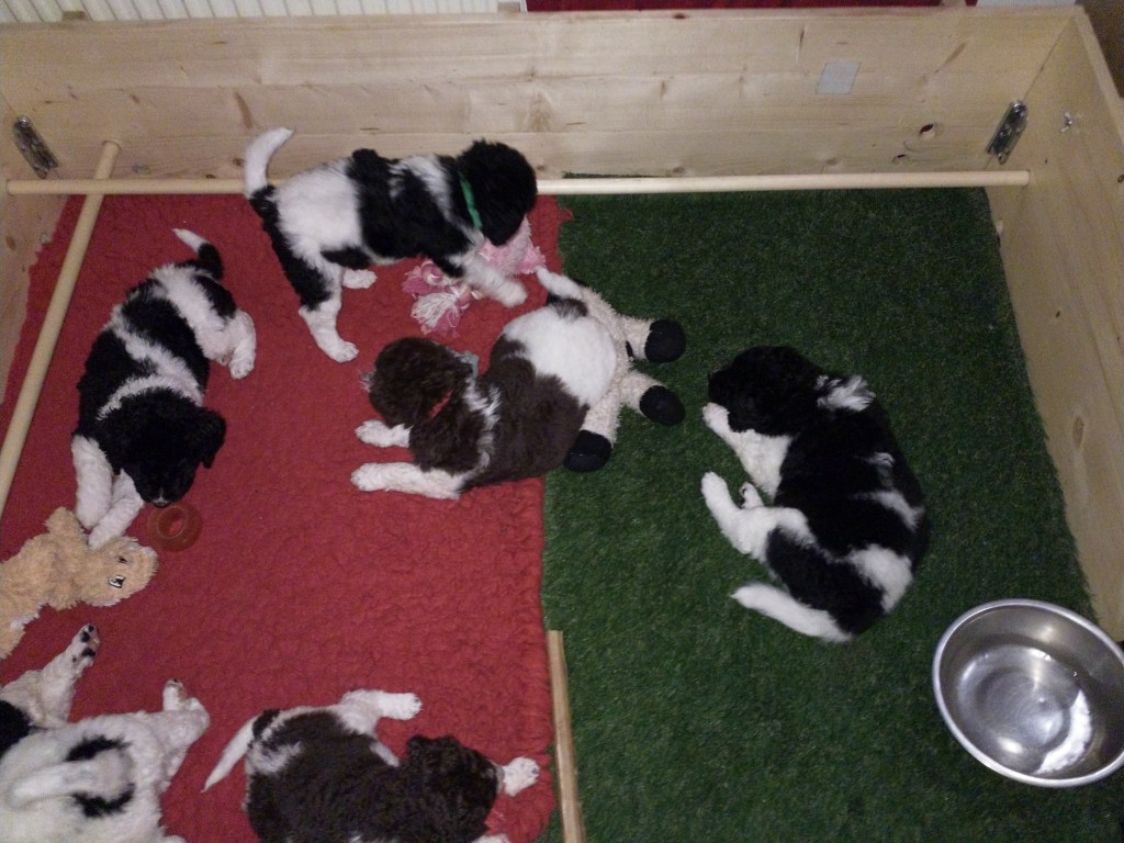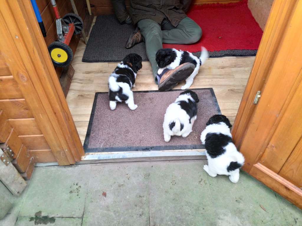 Naar Buiten: De pups gaan nu elke dag naar buiten behalve vrijdag en dinsdag want dan regende het hard ’s middags. Het is erg koud de eerste dagen, zo rond het vriespunt en geen zon. Ze zijn dan ook niet langer dan 10-15minuten buiten. Lobke zit al heel snel te bibberen, we nemen haar nog in bescherming door haar op de arm en onder de jas te houden. We willen niet dat ze weer onderkoeld raakt. Ze is ook zoveel kleiner dan de rest. Molle tilt beurtelings zijn voorpootjes op. Heeft hij last van koude pootjes? We hebben het tuinhuisje ingericht voor de pups. Er ligt isolatie op de vloer met vinyl er overheen. Ook liggen er matten en een dik vetbed. Ze lopen in en uit. Zolang ze in beweging zijn is het goed maar als ze beginnen te bibberen gaan ze weer naar binnen. Het is goed voor de socialisatie om ze elke dag even naar buiten te doen, even een andere omgeving en een andere ondergrond. Ze zijn er al snel aan gewend, ze gaan op onderzoek uit en spelen met elkaar. Jammer dat het weer niet meewerkt, dat het te koud of te nat is. Eenmaal binnen gaan ze allemaal onder zeil van alle buiten avonturen.