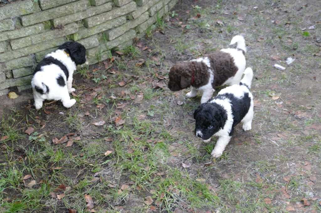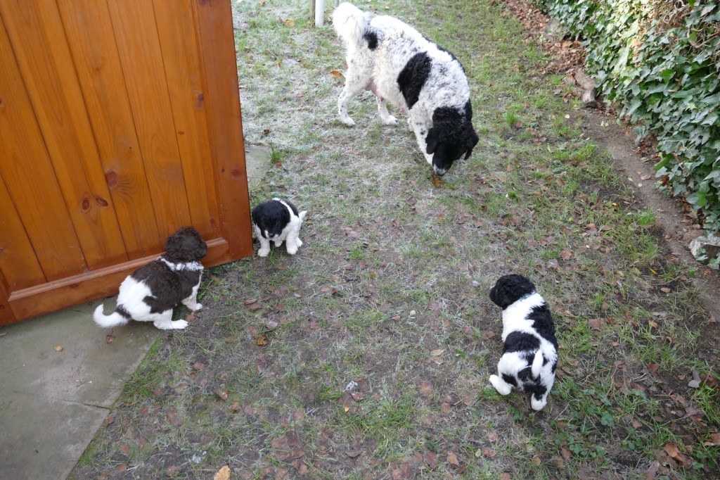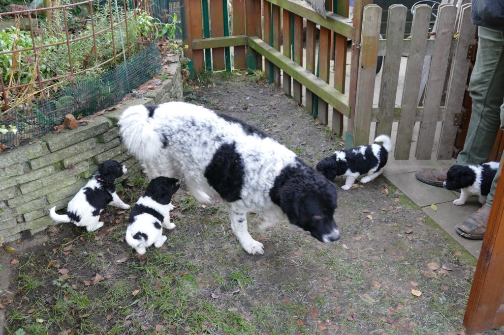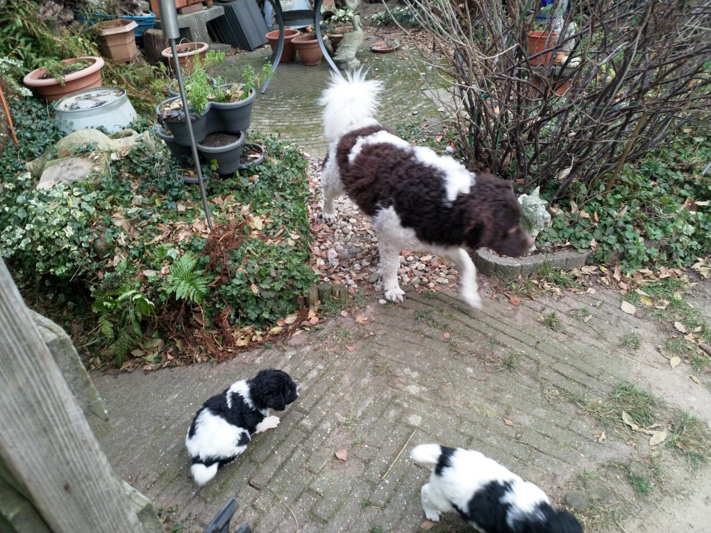 Met de kerstdagen hebben we Gosse te logeren en ook komt Ruurd met Hielke. Zo hebben we 2e Kerstdag 11 Wetterhounen in de tuin lopen, 4 grote honden en 7 kleintjes. Hoewel de zon schijnt staat er een koude wind. De kleintjes hebben er later last van. Ze poepen allemaal vrij dun en erg veel. Toch zijn ze maar 10 minuten buiten geweest. Ze worden steeds vrijer in de tuin en gaan op onderzoek uit. Er valt veel te beleven in dit stuk tuin.