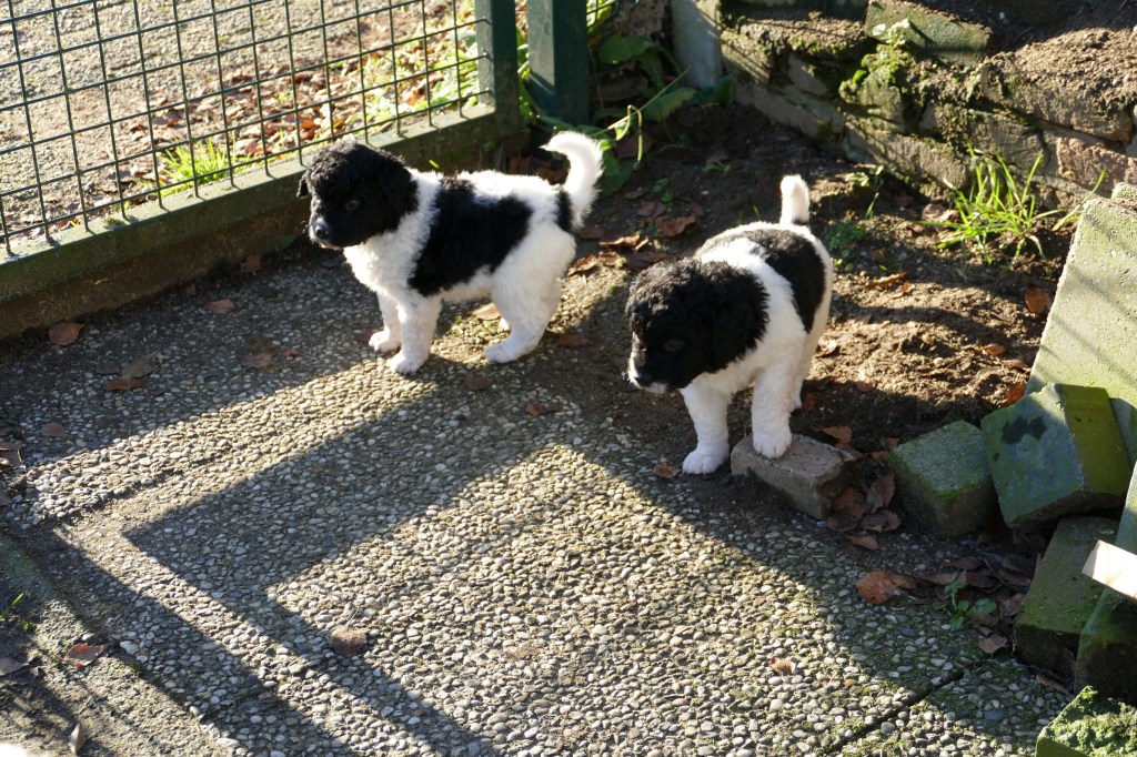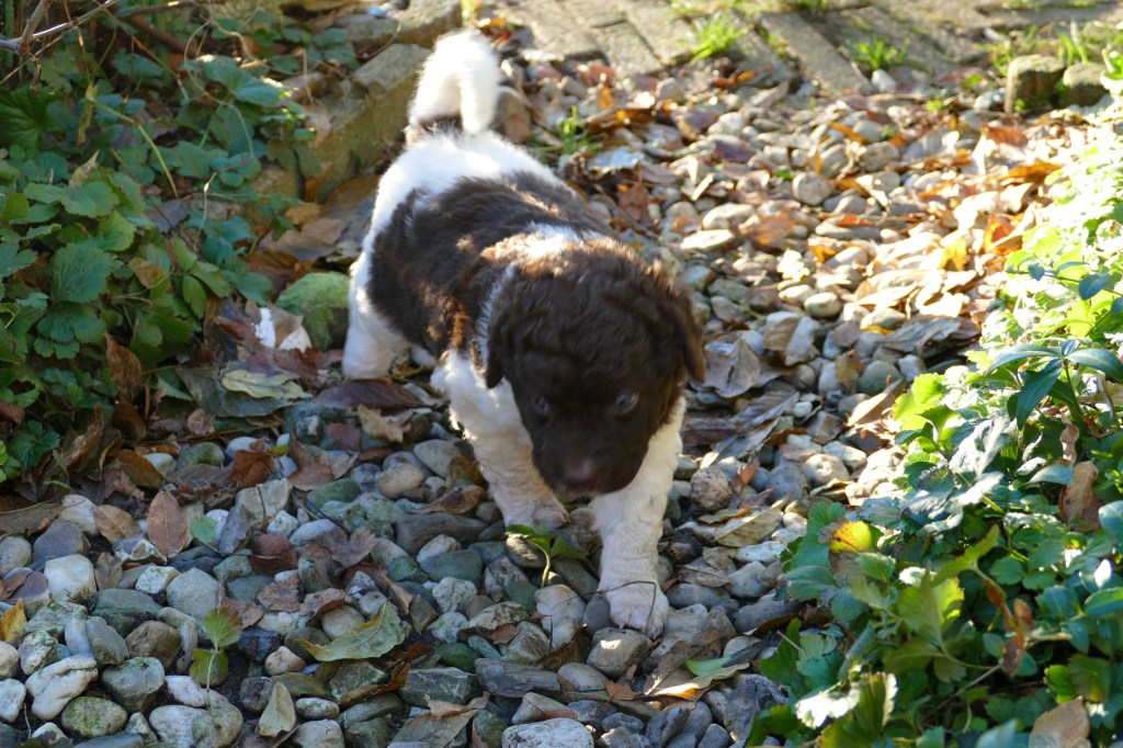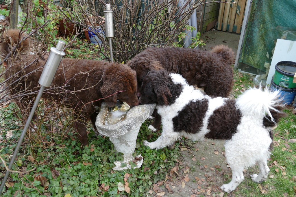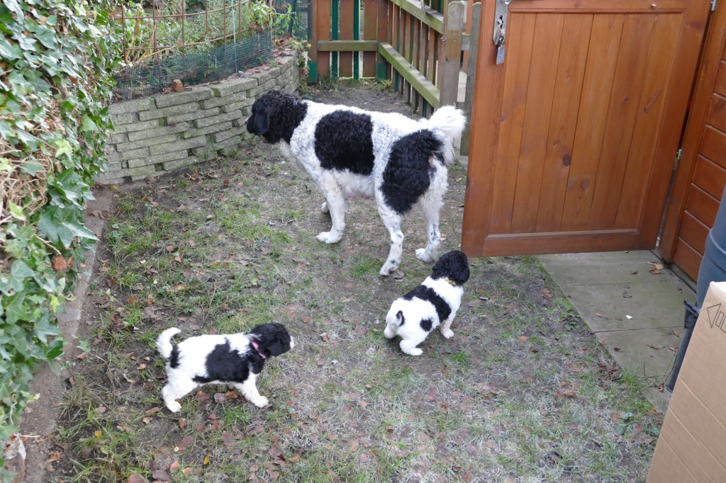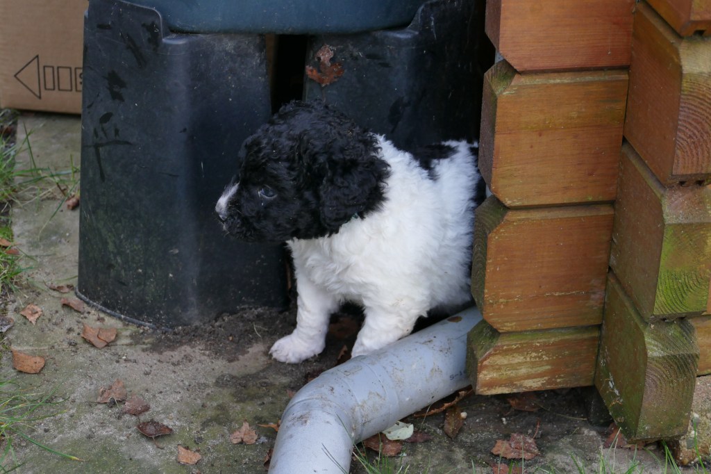 Met de kerstdagen hebben we Gosse te logeren en ook komt Ruurd met Hielke. Zo hebben we 2e Kerstdag 11 Wetterhounen in de tuin lopen, 4 grote honden en 7 kleintjes. Hoewel de zon schijnt staat er een koude wind. De kleintjes hebben er later last van. Ze poepen allemaal vrij dun en erg veel. Toch zijn ze maar 10 minuten buiten geweest. Ze worden steeds vrijer in de tuin en gaan op onderzoek uit. Er valt veel te beleven in dit stuk tuin.