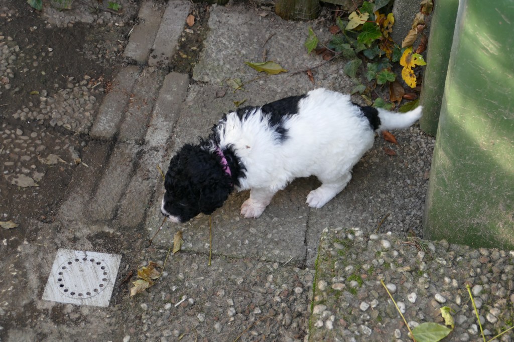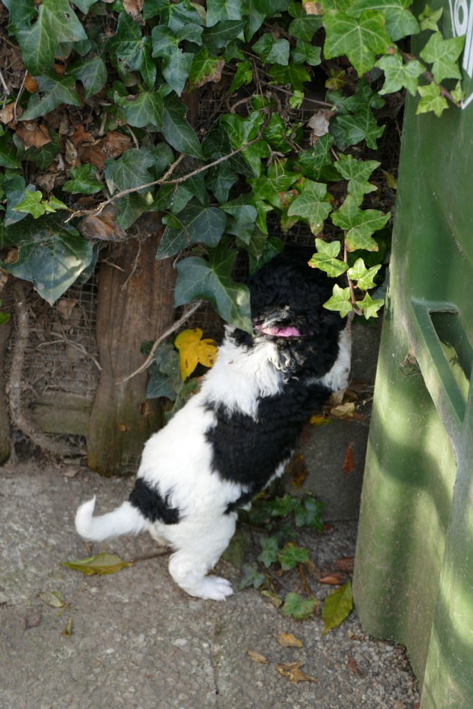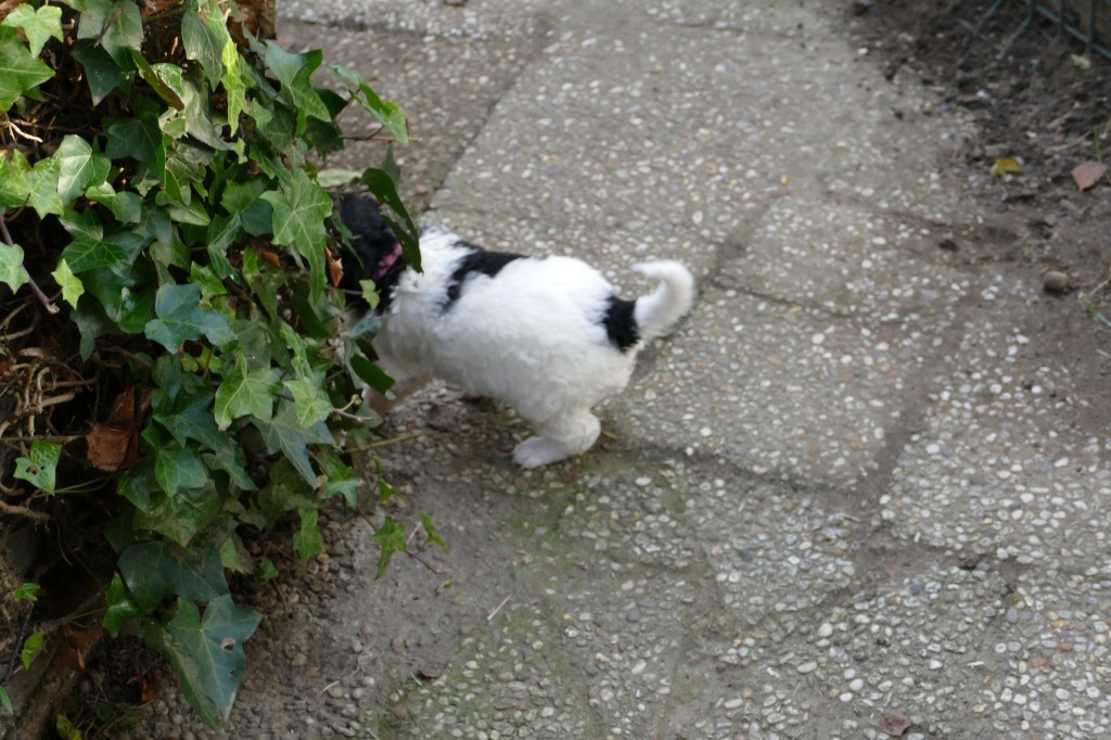 Nynke is de meest ondernemende pup van het stel. Al gauw heeft ze een gaatje gevonden waar ze door past en loopt in een ander gedeelte van de tuin. Ze kijkt bij de kippen en onderzoekt de klimop.