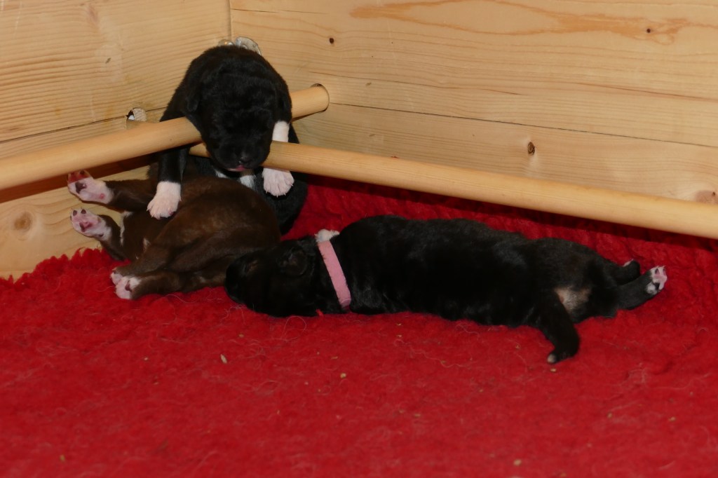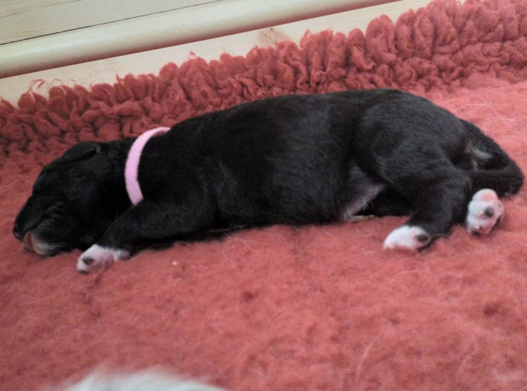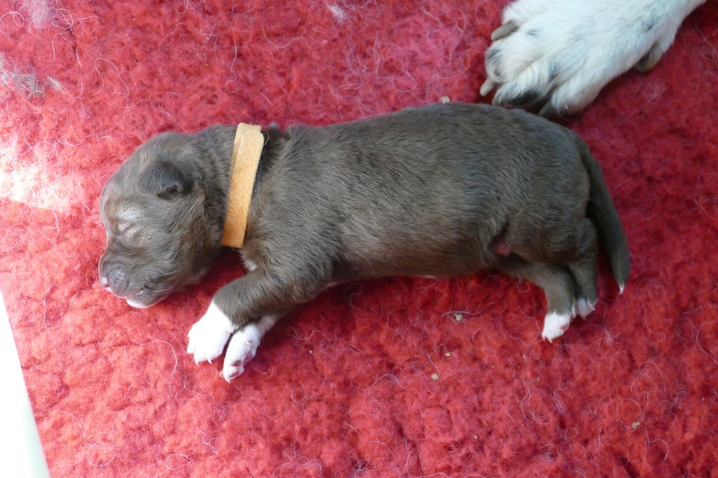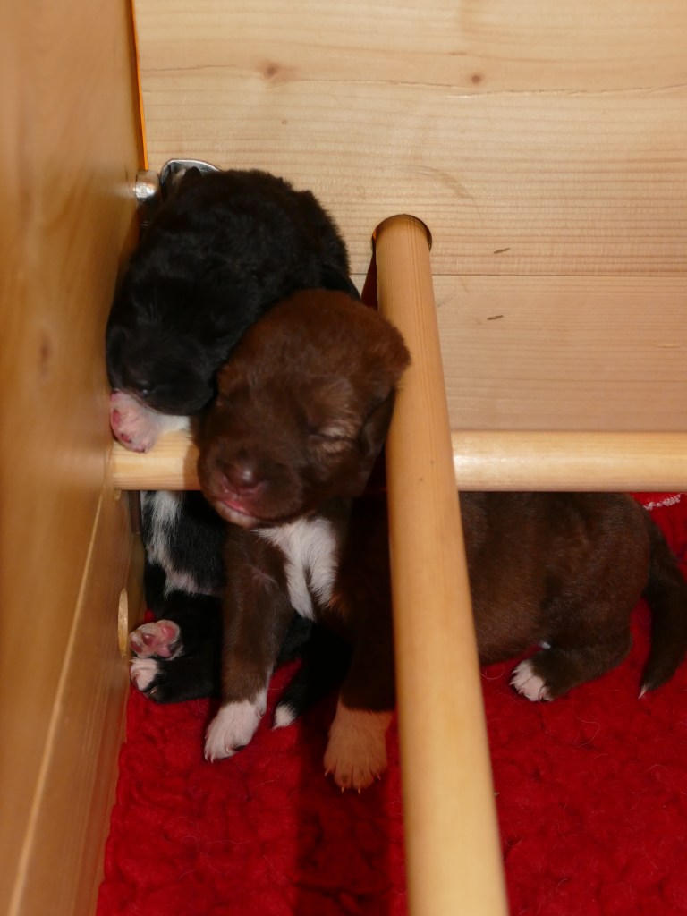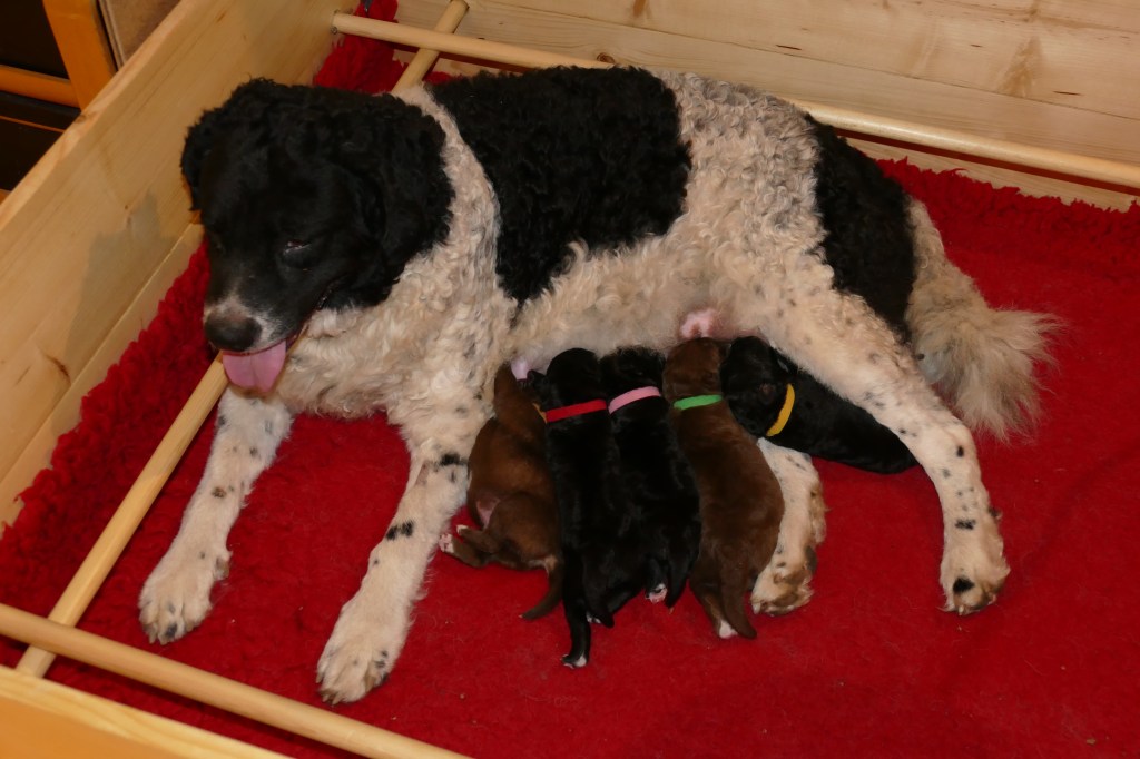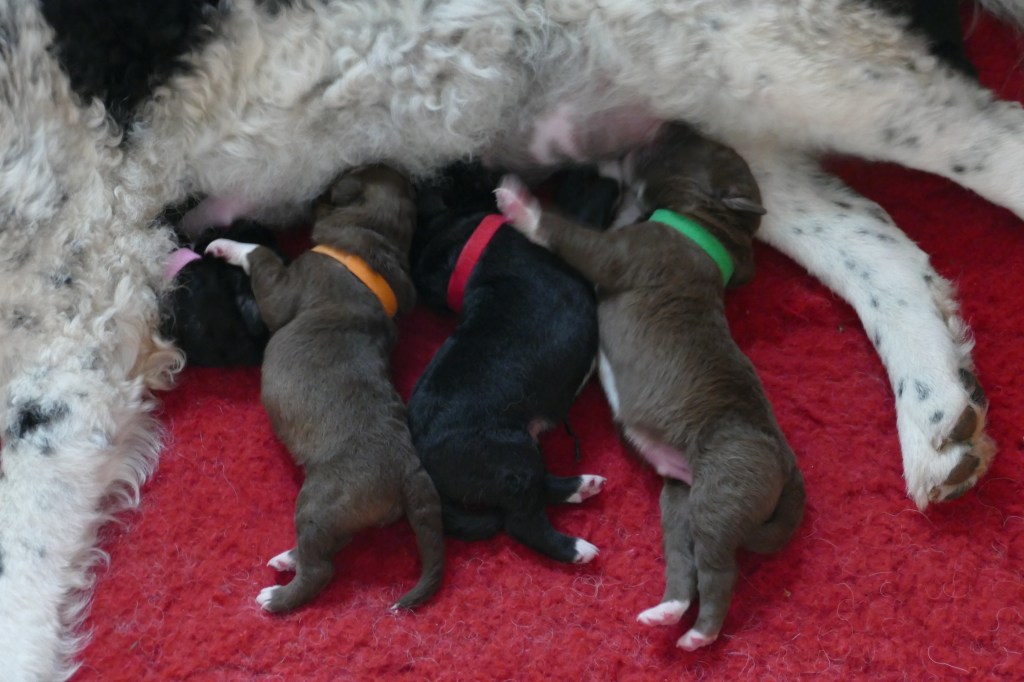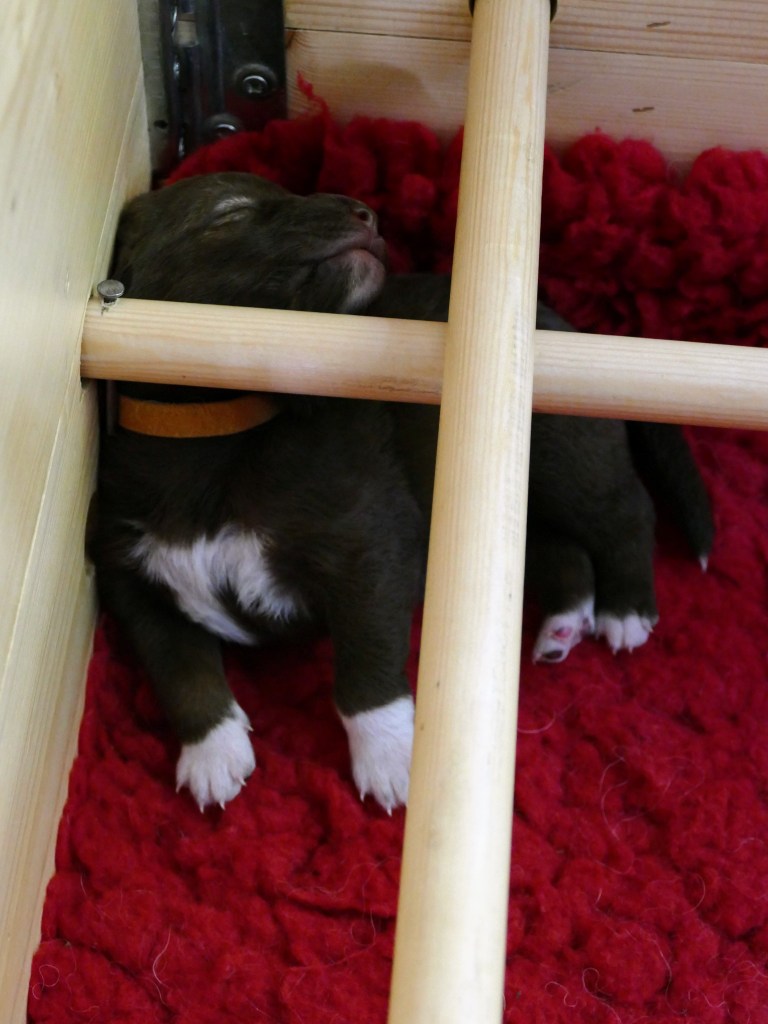 De bevalling ging niet zoals je dat je voorstelt. Hoewel je altijd rekening houdt met complicaties vraag je jezelf af, signaleer ik dat op tijd en grijp ik op tijd in. Gelukkig is alles goed afgelopen, zijn er 5 mooie, stevige en levendige pups en Tyske is er ook goed vanaf gekomen. Zij herstelt gelukkig voorspoedig, we houden haar goed in de gaten en er gebeuren geen nare dingen. Eenmaal thuis, als we ’s middags weer tot rust zijn gekomen, weeg ik de pups voor de 1e keer. Daarna weeg ik ze iedere dag om 11.00 uur . Als ik ze de volgende dag gewogen heb, val ik gelijk van mijn “roze wolk”. De zwaarste pup is 14g aangekomen en de lichtste pup is 20g afgevallen!! De rest schommelt een paar gram rond hun geboorte gewicht. Nu kan dat na zo’n heftige bevalling en niet gelijk kunnen drinken na de geboorte werkt daar niet aan mee. Daarom weeg ik ze ’s avonds om 23.00 uur weer. Nu ben ik weer helemaal terug op aarde. 3 van de 5 pups zitten boven hun geboortegewicht maar 2 zijn nog verder afgevallen. De vraag is of Tyske wel voldoende melk heeft na zo’n operatie. Om te voorkomen dat deze pups verzwakken gaan we bijvoeren met flesjes puppymelk. Dat klinkt eenvoudiger dan het is want ze willen het drinken uit een flesje niet snel oppakken en het moet 8x per dag, dus om de 3 uur. Het bruine reutje met oranje band krijgt het snel door en begint goed te drinken en te groeien. Het zwarte reutje met geel bandje blijft zich verzetten tegen de fles en groeit daarom niet goed. Na 4 dagen besluiten we om hem te gaan dwangvoeren met een voedingssonde. We houden de gewichten zowel ’s ochtends als ’s avonds in de gaten en dan is er nog eentje die niet voldoende groeit. Het teefje gaan we ook met de fles bijvoeren maar ook zij verzet zich hevig tegen speen. Daarom krijgt zij nu ook puppymelk via de sonde. We doen er alles aan om de melk bij Tyske op gang te krijgen maar zonder resultaat. Haar baarmoeder is er uit en dat is een belangrijk orgaan voor de hormoonhuishouding die de melkproductie regelt. Tyske is een topmoeder, ze verzorgt haar pups en gaat er zo bij liggen dat ze makkelijk bij alle tepels kunnen. Daar was ik wel even bang voor dat ze, als ze geen spanning zou voelen, niet haar pups zou laten drinken en haar pups zou verwaarlozen. Dan zou je in een negatieve spiraal terecht komen. Maar gelukkig is dat niet het geval. Verder neem ik iedere zinvolle tip over. Zo ook een ander speentje kopen. Het lijkt er op dat het misschien succesvol is bij het zwarte reutje.