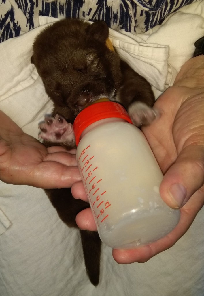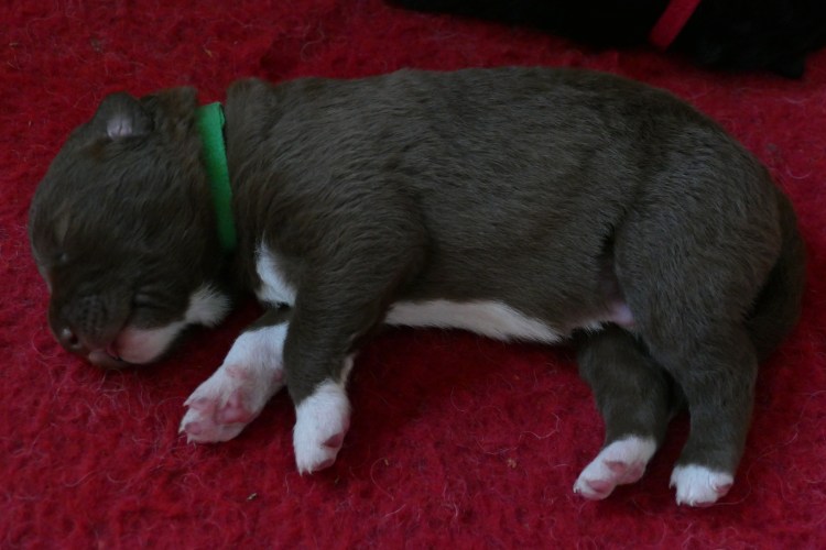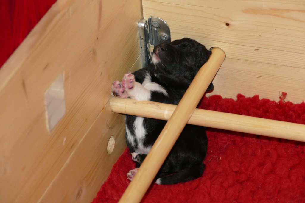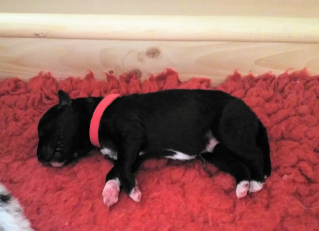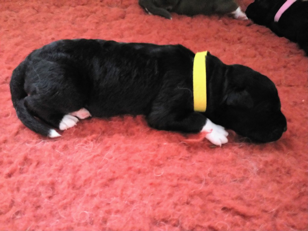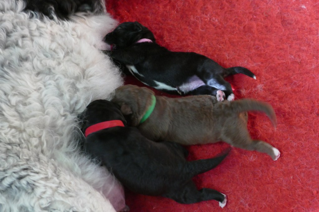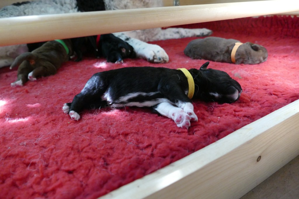 De bevalling ging niet zoals je dat je voorstelt. Hoewel je altijd rekening houdt met complicaties vraag je jezelf af, signaleer ik dat op tijd en grijp ik op tijd in. Gelukkig is alles goed afgelopen, zijn er 5 mooie, stevige en levendige pups en Tyske is er ook goed vanaf gekomen. Zij herstelt gelukkig voorspoedig, we houden haar goed in de gaten en er gebeuren geen nare dingen. Eenmaal thuis, als we ’s middags weer tot rust zijn gekomen, weeg ik de pups voor de 1e keer. Daarna weeg ik ze iedere dag om 11.00 uur . Als ik ze de volgende dag gewogen heb, val ik gelijk van mijn “roze wolk”. De zwaarste pup is 14g aangekomen en de lichtste pup is 20g afgevallen!! De rest schommelt een paar gram rond hun geboorte gewicht. Nu kan dat na zo’n heftige bevalling en niet gelijk kunnen drinken na de geboorte werkt daar niet aan mee. Daarom weeg ik ze ’s avonds om 23.00 uur weer. Nu ben ik weer helemaal terug op aarde. 3 van de 5 pups zitten boven hun geboortegewicht maar 2 zijn nog verder afgevallen. De vraag is of Tyske wel voldoende melk heeft na zo’n operatie. Om te voorkomen dat deze pups verzwakken gaan we bijvoeren met flesjes puppymelk. Dat klinkt eenvoudiger dan het is want ze willen het drinken uit een flesje niet snel oppakken en het moet 8x per dag, dus om de 3 uur. Het bruine reutje met oranje band krijgt het snel door en begint goed te drinken en te groeien. Het zwarte reutje met geel bandje blijft zich verzetten tegen de fles en groeit daarom niet goed. Na 4 dagen besluiten we om hem te gaan dwangvoeren met een voedingssonde. We houden de gewichten zowel ’s ochtends als ’s avonds in de gaten en dan is er nog eentje die niet voldoende groeit. Het teefje gaan we ook met de fles bijvoeren maar ook zij verzet zich hevig tegen speen. Daarom krijgt zij nu ook puppymelk via de sonde. We doen er alles aan om de melk bij Tyske op gang te krijgen maar zonder resultaat. Haar baarmoeder is er uit en dat is een belangrijk orgaan voor de hormoonhuishouding die de melkproductie regelt. Tyske is een topmoeder, ze verzorgt haar pups en gaat er zo bij liggen dat ze makkelijk bij alle tepels kunnen. Daar was ik wel even bang voor dat ze, als ze geen spanning zou voelen, niet haar pups zou laten drinken en haar pups zou verwaarlozen. Dan zou je in een negatieve spiraal terecht komen. Maar gelukkig is dat niet het geval. Verder neem ik iedere zinvolle tip over. Zo ook een ander speentje kopen. Het lijkt er op dat het misschien succesvol is bij het zwarte reutje.