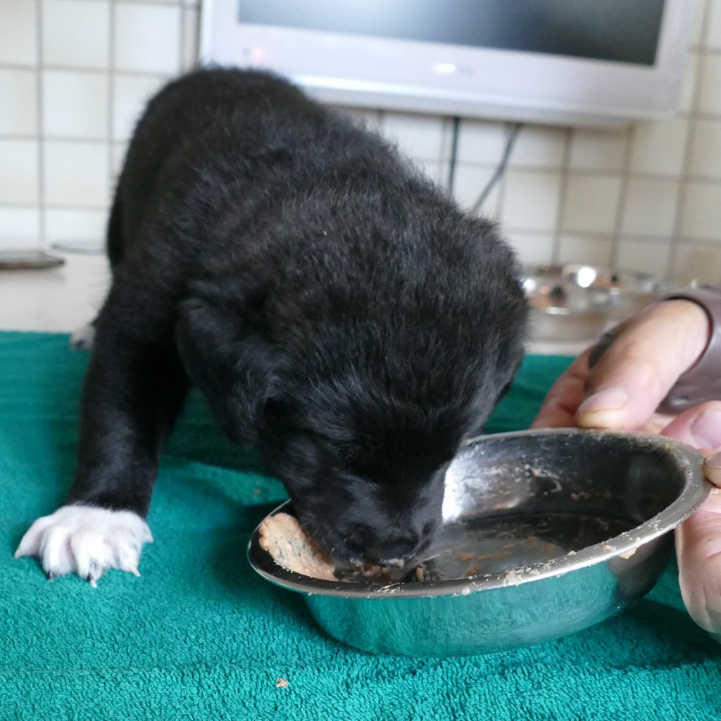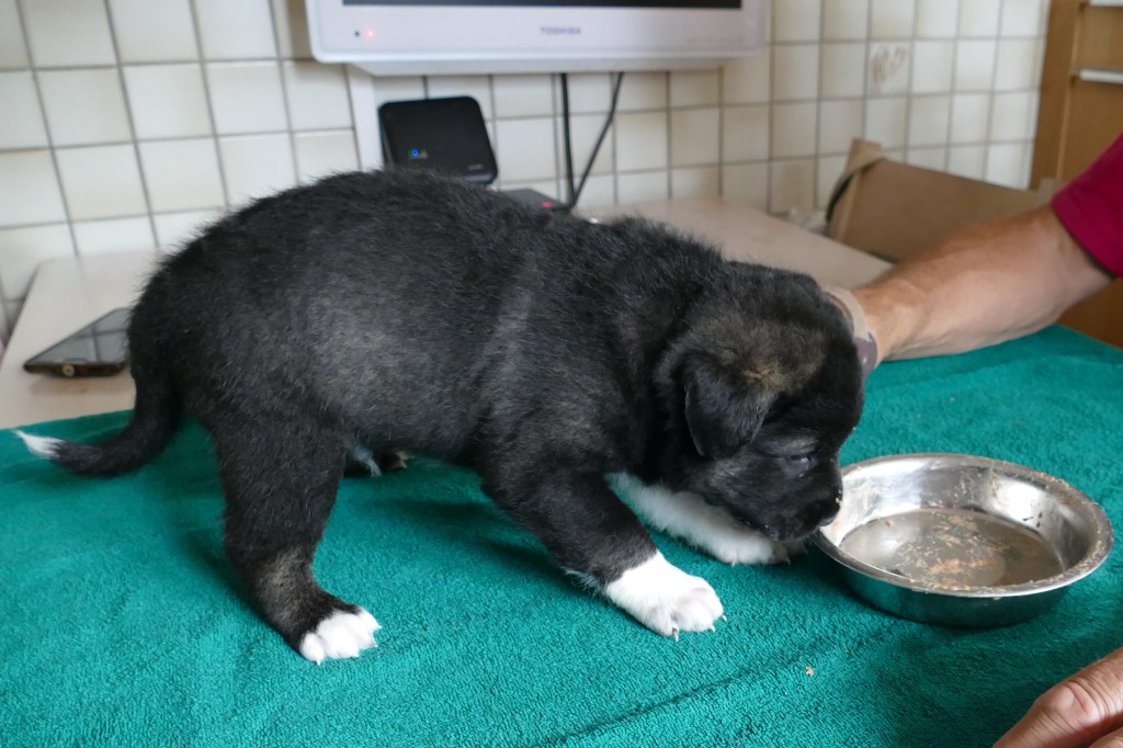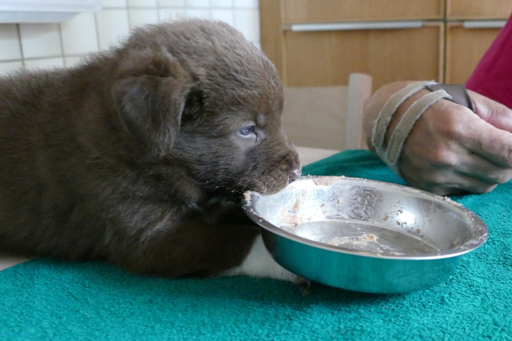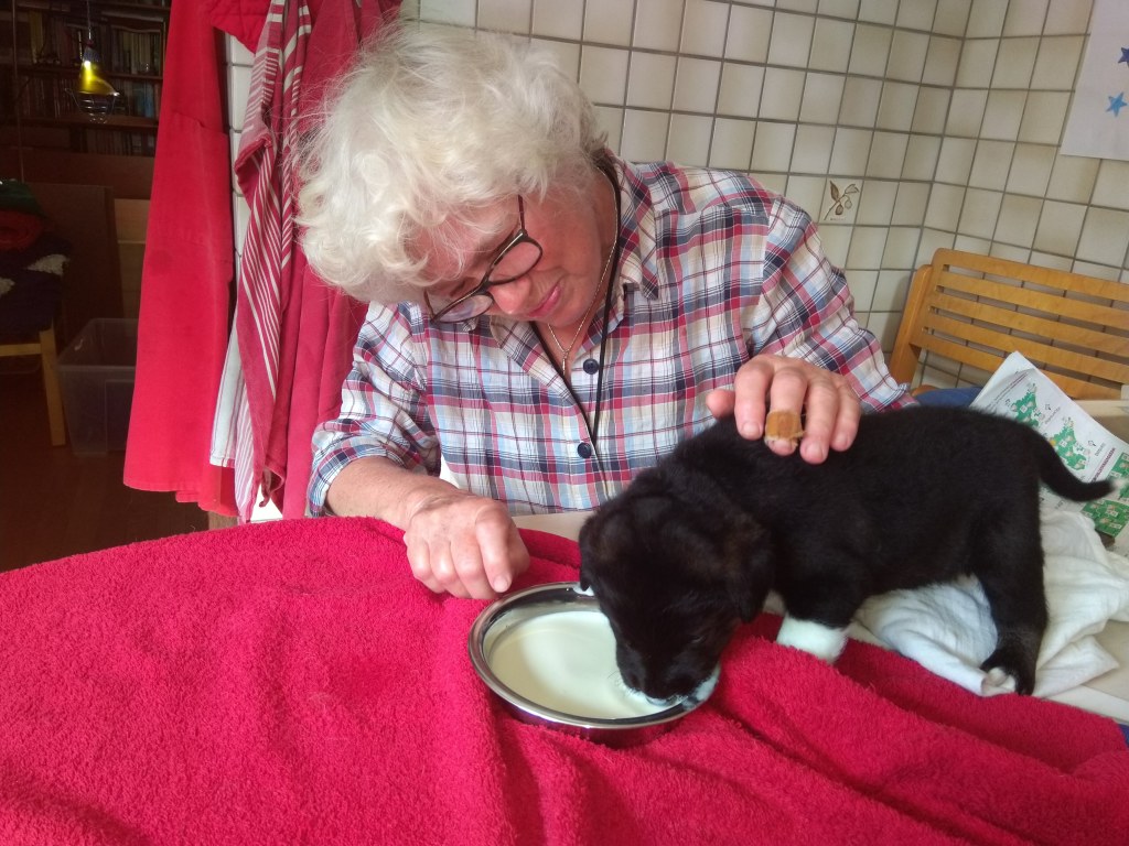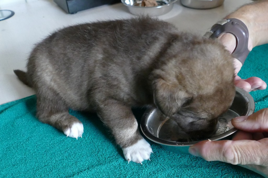 Volco wil steeds moeilijker uit het flesje drinken, hij zit een beetje op de speen te kauwen, duwt iedere keer het flesje weg met zijn voorpoten en smeert zich helemaal onder de puppymelk, drinken is er niet bij. Ik hoop dat hij voldoende bij Tyske krijgt maar hij groeit de laatste dagen maar zo’n 20g per dag. Dat is niet voldoende. Op maandag wil hij weer niet uit het flesje drinken. Ik besluit wat anders te proberen. Ik doe de melk in de bakje en ik zet hem op een handdoek met het bakje op de keukentafel. Ik probeer zijn aandacht op de melk te vestigen door op de rand van het bakje te tikken en ja hoor, hij duwt zijn snuit helemaal in de melk en begint te lebberen. Af en toe moet hij proesten omdat hij zijn neus ook in de melk duwt maar hij krijgt het door en drinkt een deel van de melk uit het bakje. Als ik het ’s avonds weer probeer gaat het al een stuk beter en drinkt hij het bakje bijna leeg. Op dinsdagmorgen probeer ik het ook bij Sybe en Yfke, Tjibbe wil nog wel uit het flesje drinken. Sybe, de grote hongerlijder, is heel gulzig en duwt zijn snuit ook helemaal in de melk maar drinkt het bakje helemaal leeg. Yfke heeft wat meer aansporing nodig, ik doop mijn vinger in de melk en zij likt het er af. Uiteindelijk gaat ze zelf drinken maar dan draait ze zich resoluut om, ze hoeft niet meer. Alle pups zijn op dinsdag weer goed gegroeid, ook Volco.