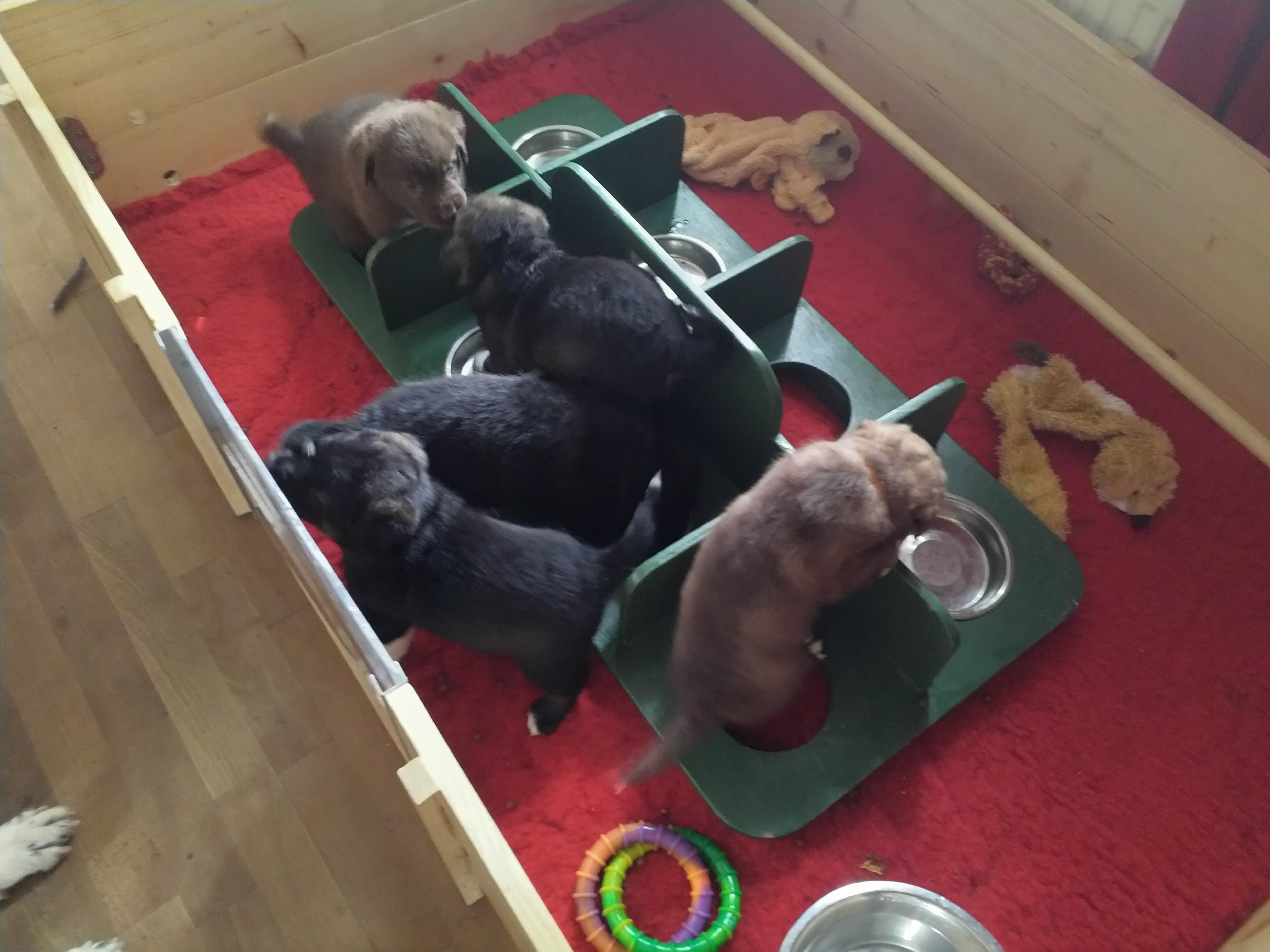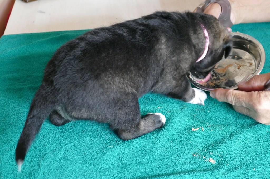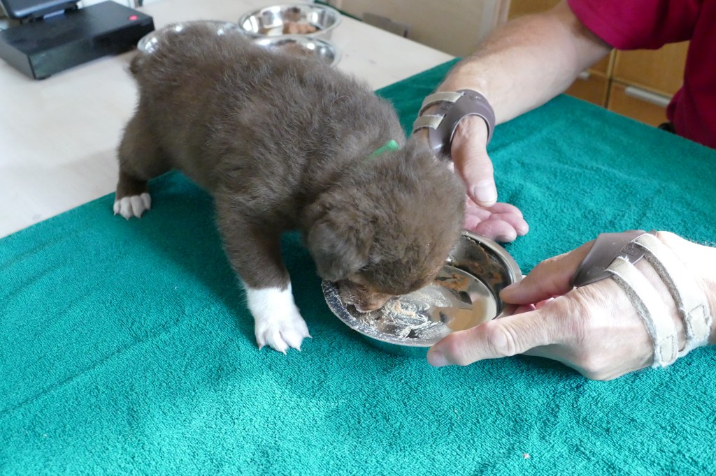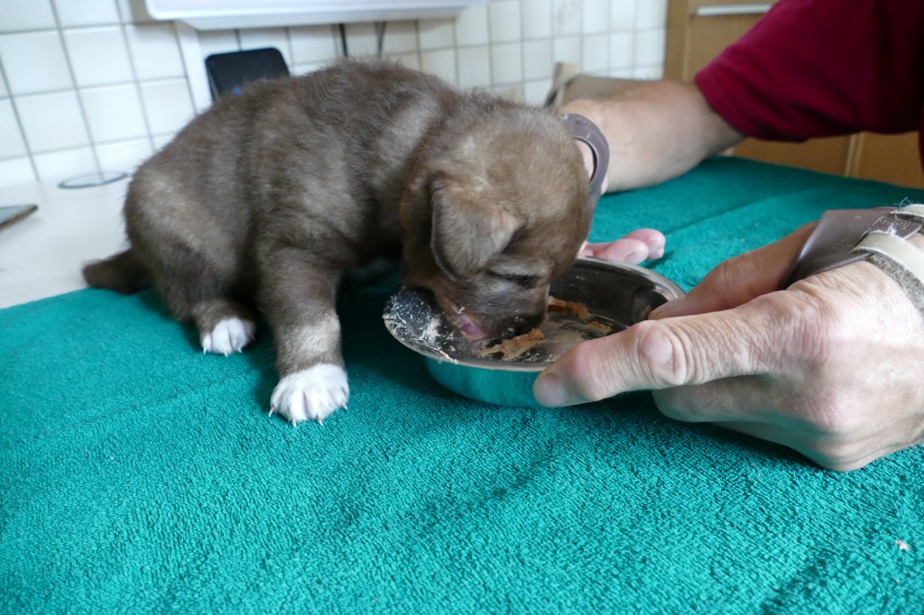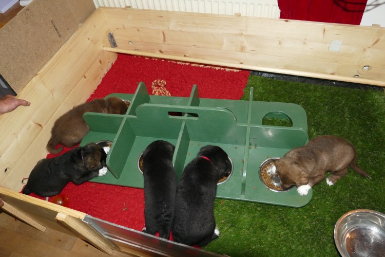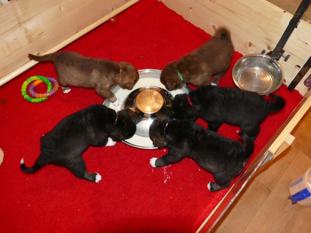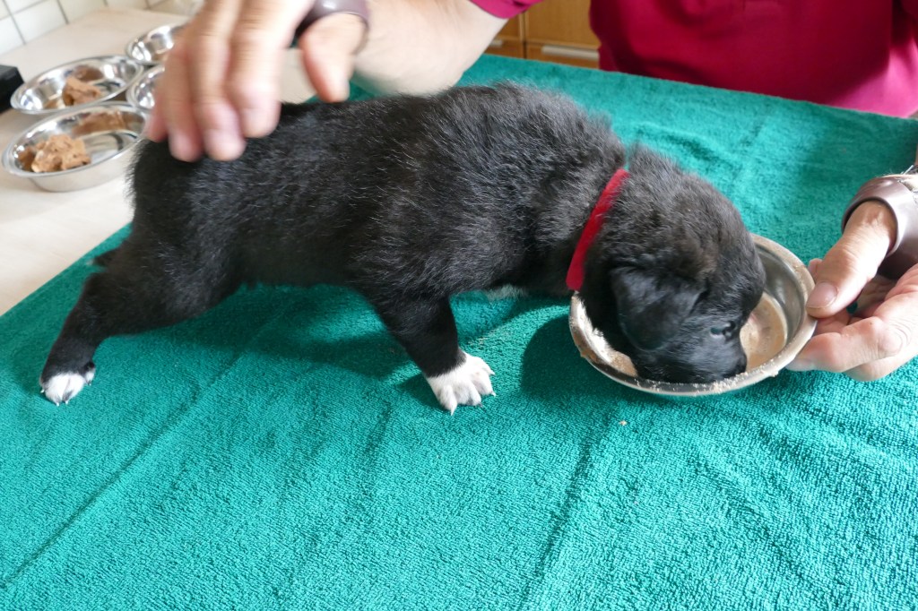 Op woensdag beginnen we met overschakelen naar vast voer. We beginnen met Starter Mousse van Royal Canin. Dat is een hele zachte paté die gemakkelijk op te likken is. We beginnen er in de morgen mee. Eén voor één voeren we de hondjes uit een bakje op een handdoek op de keukentafel. Onze ervaring is dat zo’n 1e keer een geweldige smeerboel wordt en de pups helemaal onder zitten omdat ze ook met de poten in het bakje gaan. Tyske vond dat niet erg want ze likte ze helemaal schoon alsof het lolly’s waren en ze smaakten heerlijk! Nu was ze teleurgesteld, de pups aten zo netjes alsof nooit anders gedaan hadden dan uit bakjes eten. Er viel niets af te wassen, zelfs de bakjes niet. ’s Avonds herhaal ik het hele proces nog eens. Daarnaast geef ik nog 2x per dag puppymelk, dit maal uit een bakje.