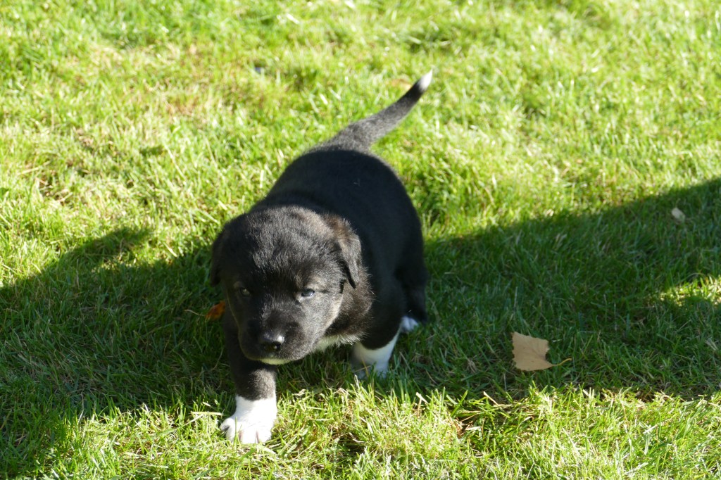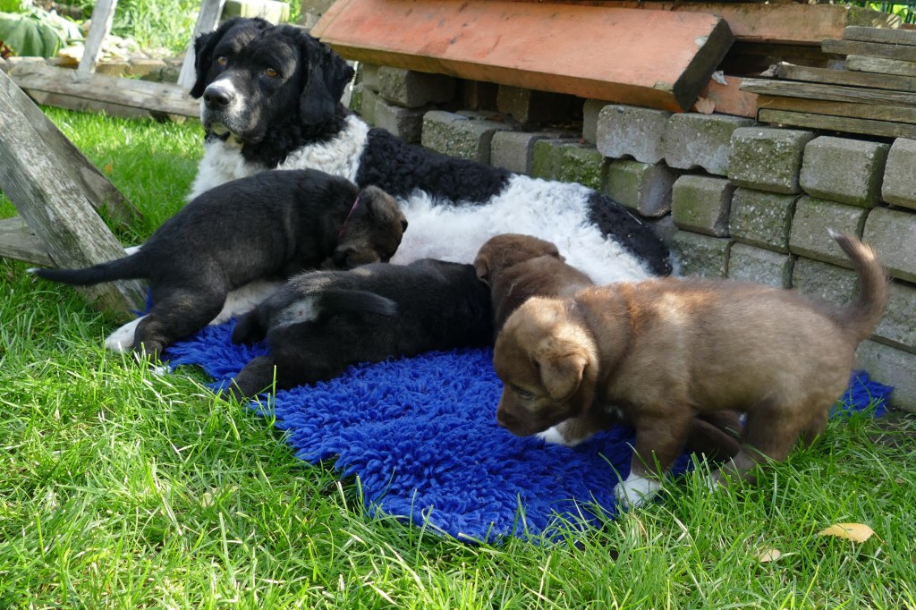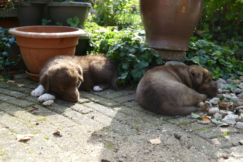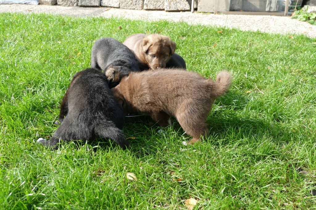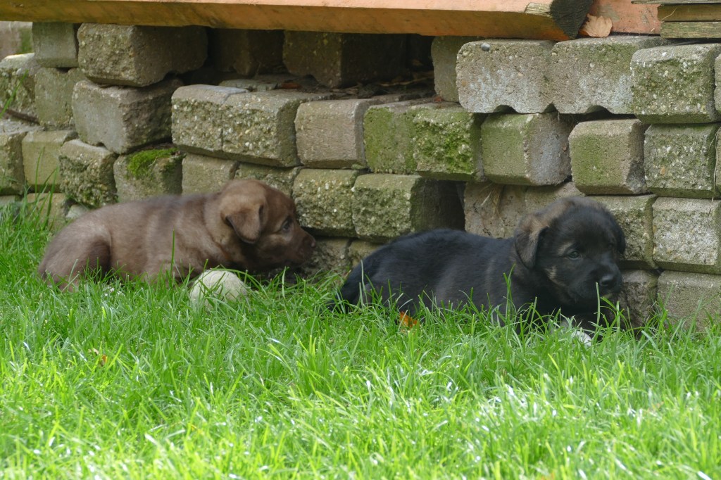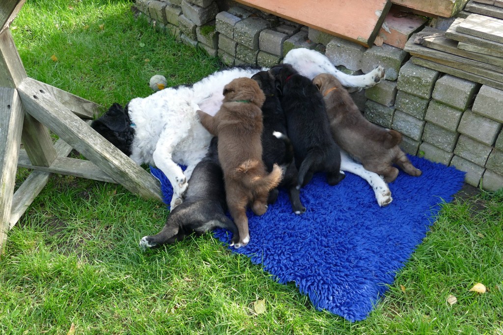 Zondag is het heel zonnig weer met een temperatuur van boven de 20 graden. Ik maai het gras kort zodat de pups er straks makkelijk kunnen lopen. Als aan het eind van de middag, als het gras droog is en het zonnig is in de voortuin neem ik ze mee naar buiten. We hebben puppybezoek en ze helpen allemaal mee met puppy’s naar buiten dragen. Sommigen vinden het vreemd het gras onder hun poten te voelen, anderen gaan gelijk op onderzoek uit. Yfke klimt over het lage muurtje om in de border tussen de planten te verdwijnen. Dat vind ik niet zo’n goed idee, ik zet haar terug op het gras. Nu, in het zonlicht, kun je de pups pas echt goed bekijken en de weerschijn in hun vachten valt nu goed op. De grote honden zijn ook in de voortuin en maken van de gelegenheid gebruik om even hun wilde Wetterspelletje te spelen en achter elkaar aan te rennen. Wonder boven wonder weten ze de pups te ontwijken, er wordt er geen eentje geraakt. Tyske gaat ervoor liggen en drinken bij mama kan ook heel goed buiten in het gras. Eenmaal weer binnen in de kist gaan ze een poosje onderzeil na deze gebeurtenissen. Zolang het weer goed blijft gaan ze elke dag een poosje naar buiten en je ziet ze steeds vrijer worden en op onderzoek uitgaan.