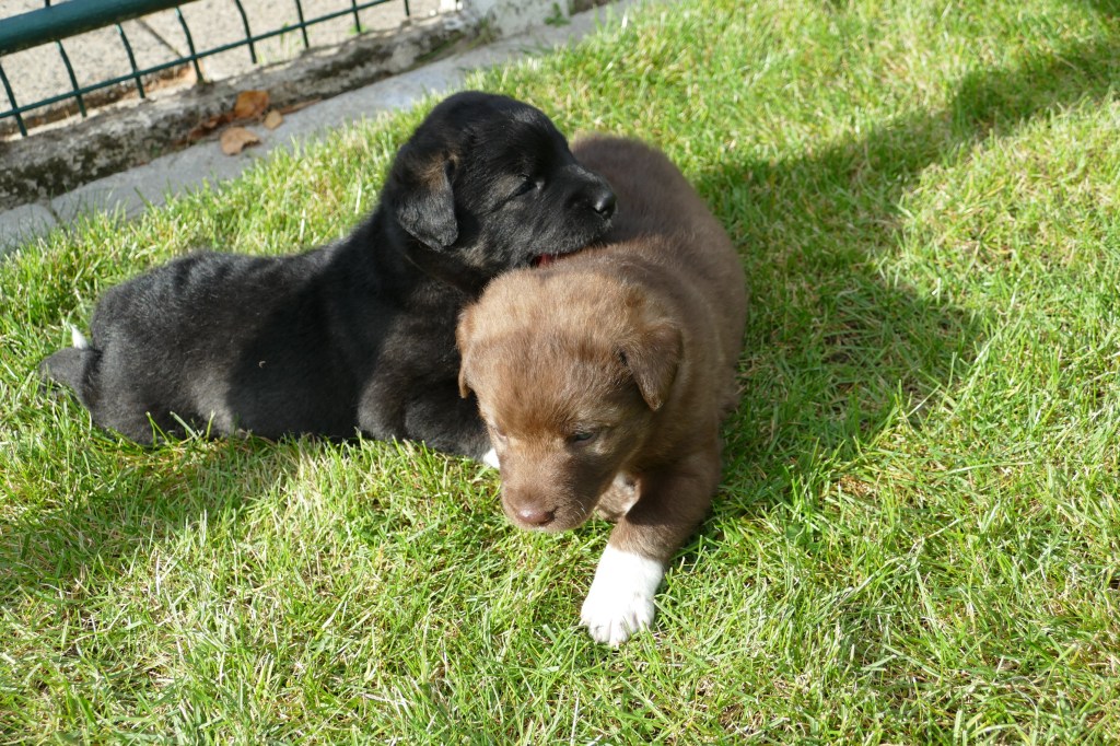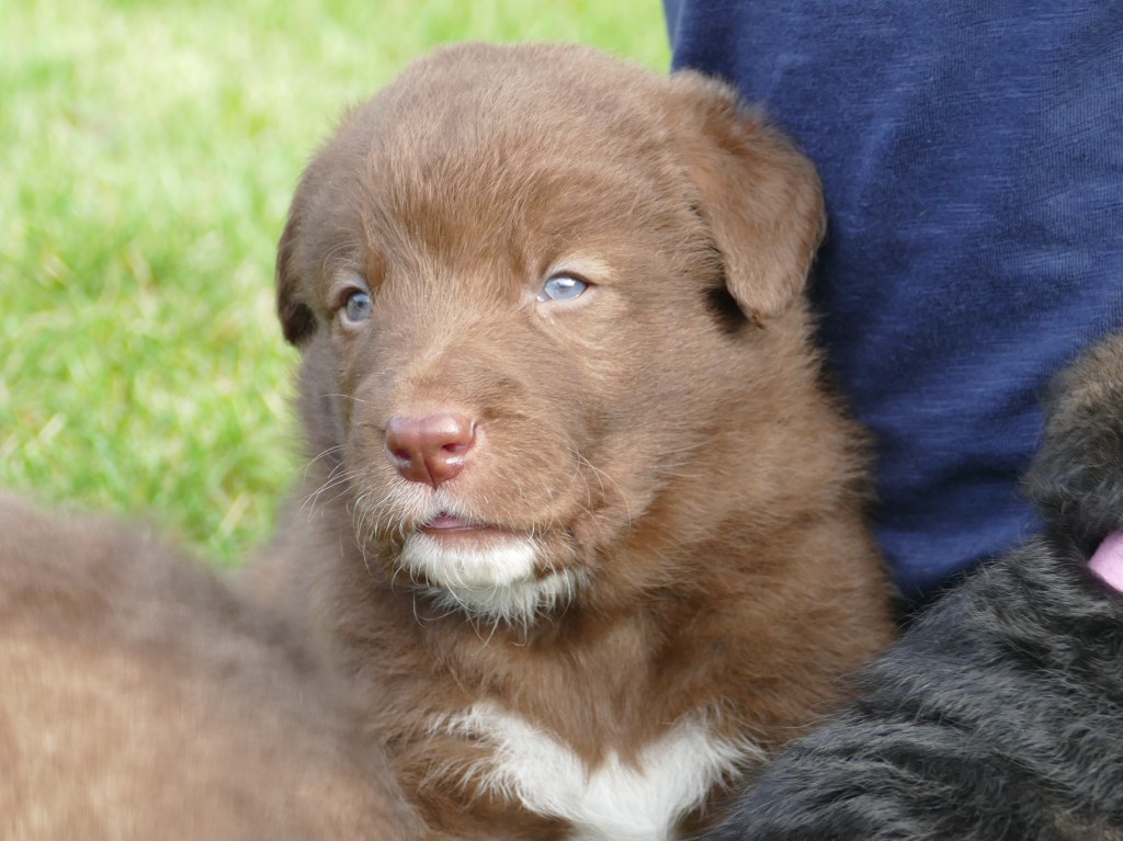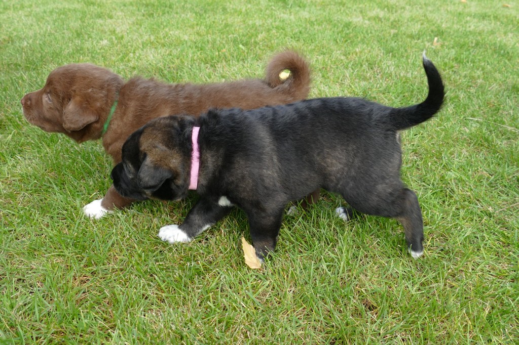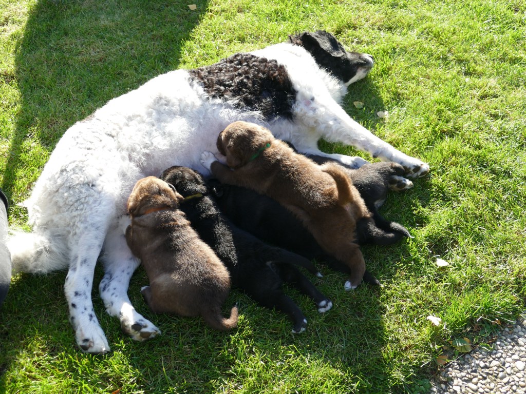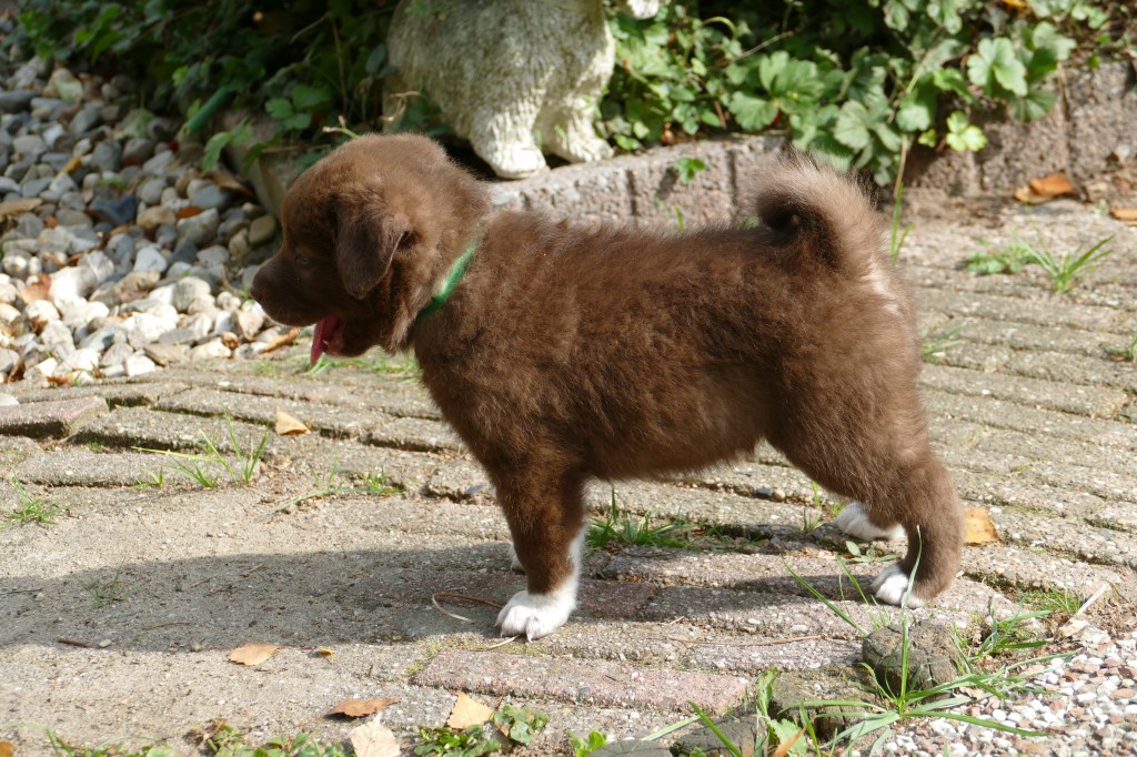 Zondag is het heel zonnig weer met een temperatuur van boven de 20 graden. Ik maai het gras kort zodat de pups er straks makkelijk kunnen lopen. Als aan het eind van de middag, als het gras droog is en het zonnig is in de voortuin neem ik ze mee naar buiten. We hebben puppybezoek en ze helpen allemaal mee met puppy’s naar buiten dragen. Sommigen vinden het vreemd het gras onder hun poten te voelen, anderen gaan gelijk op onderzoek uit. Yfke klimt over het lage muurtje om in de border tussen de planten te verdwijnen. Dat vind ik niet zo’n goed idee, ik zet haar terug op het gras. Nu, in het zonlicht, kun je de pups pas echt goed bekijken en de weerschijn in hun vachten valt nu goed op. De grote honden zijn ook in de voortuin en maken van de gelegenheid gebruik om even hun wilde Wetterspelletje te spelen en achter elkaar aan te rennen. Wonder boven wonder weten ze de pups te ontwijken, er wordt er geen eentje geraakt. Tyske gaat ervoor liggen en drinken bij mama kan ook heel goed buiten in het gras. Eenmaal weer binnen in de kist gaan ze een poosje onderzeil na deze gebeurtenissen. Zolang het weer goed blijft gaan ze elke dag een poosje naar buiten en je ziet ze steeds vrijer worden en op onderzoek uitgaan.