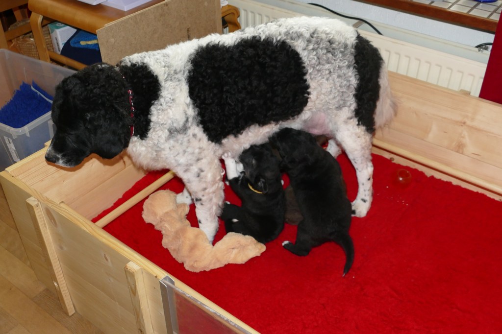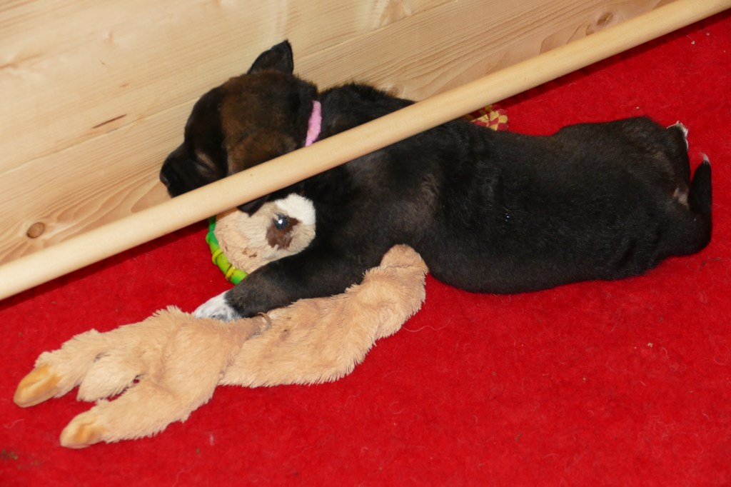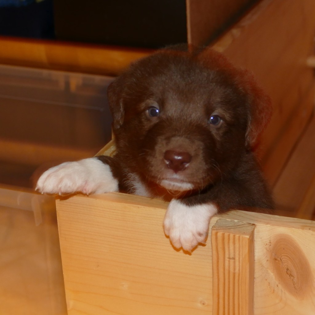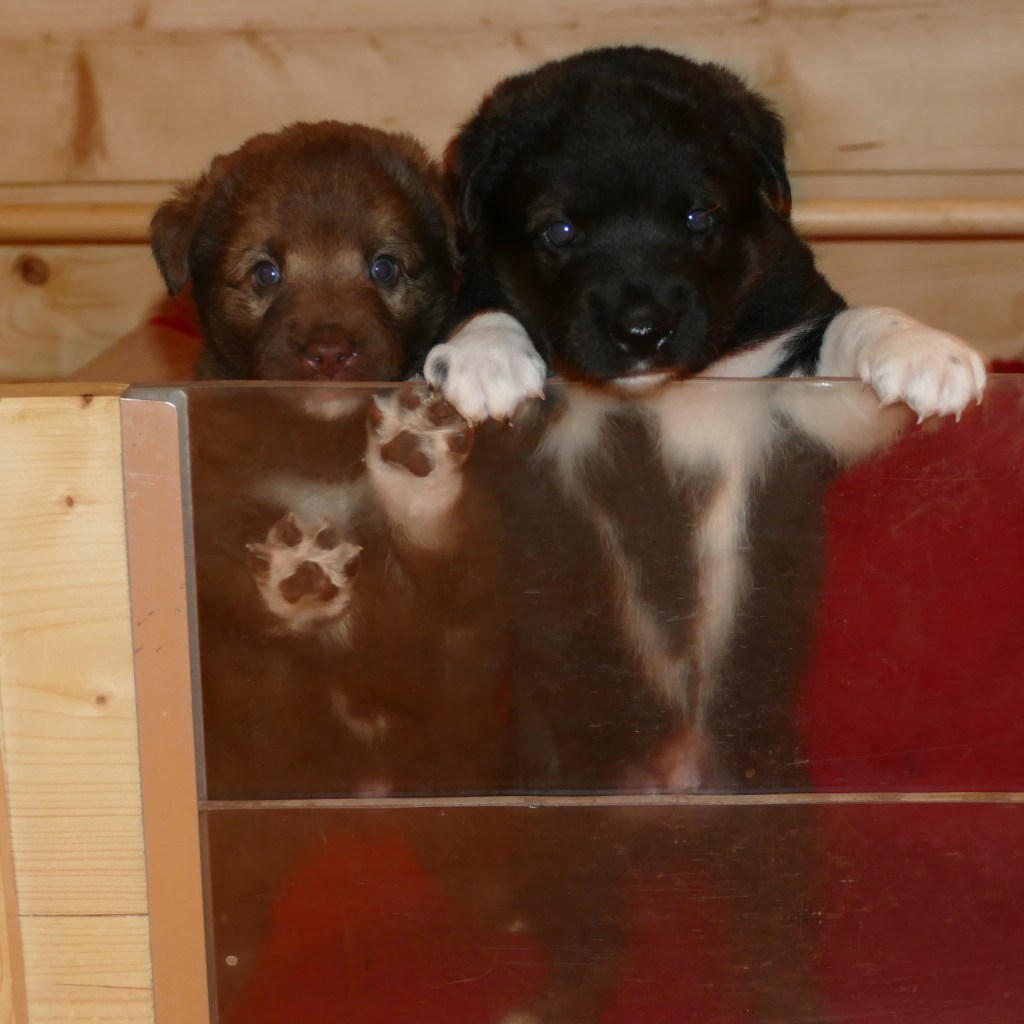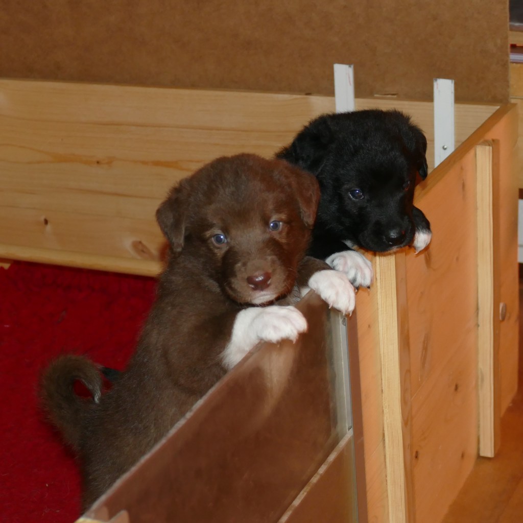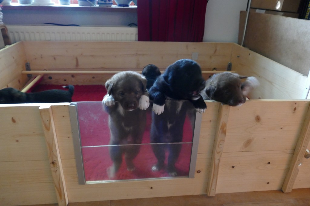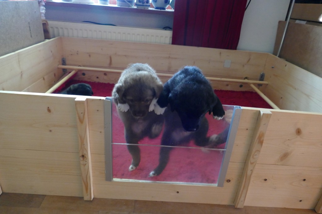3 Weken oud nu en de pups groeien en ontwikkelen zich nu zo snel. Als ze op de achterpoten gaan staan kunnen ze al over de rand van de kist kijken. Sybe en Wadse zien al kans om uit de kist te klimmen. Ze gebruiken de stokken in de kist als opstapje. De voorste stok hebben we al weggehaald. Misschien moeten de stokken aan de zijkant ook nog weg, ze zijn slim genoeg om die te gebruiken.